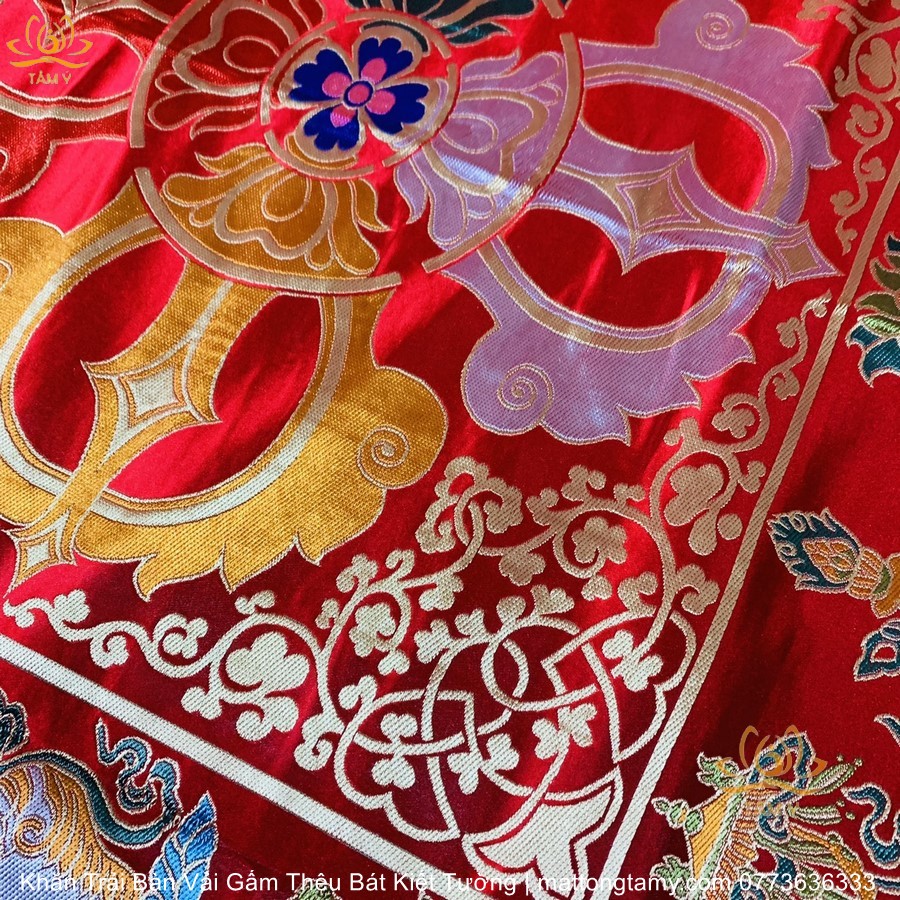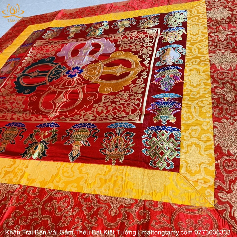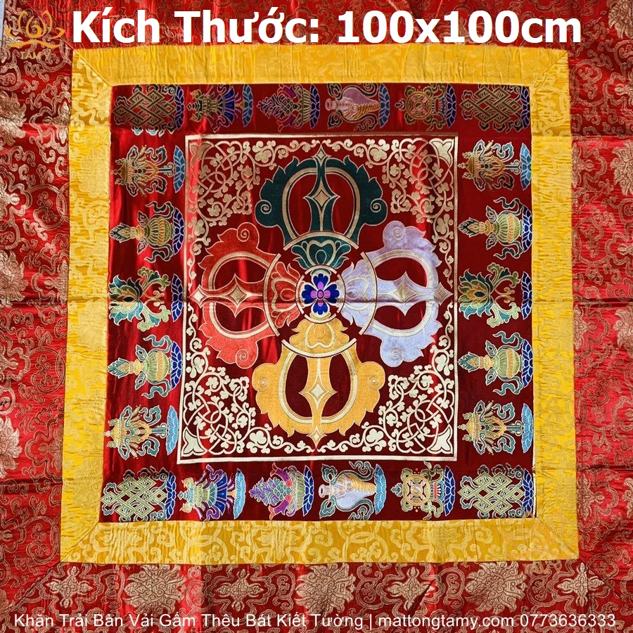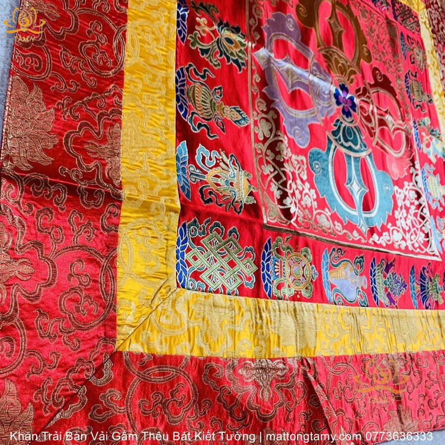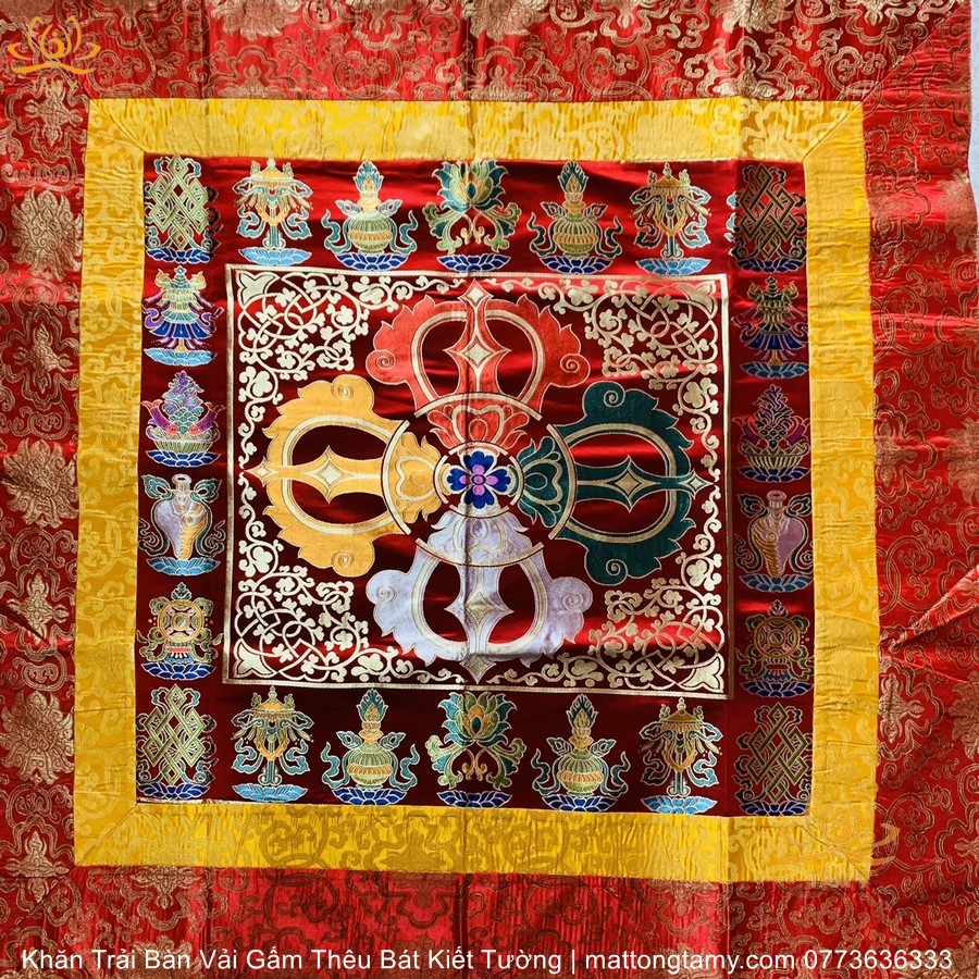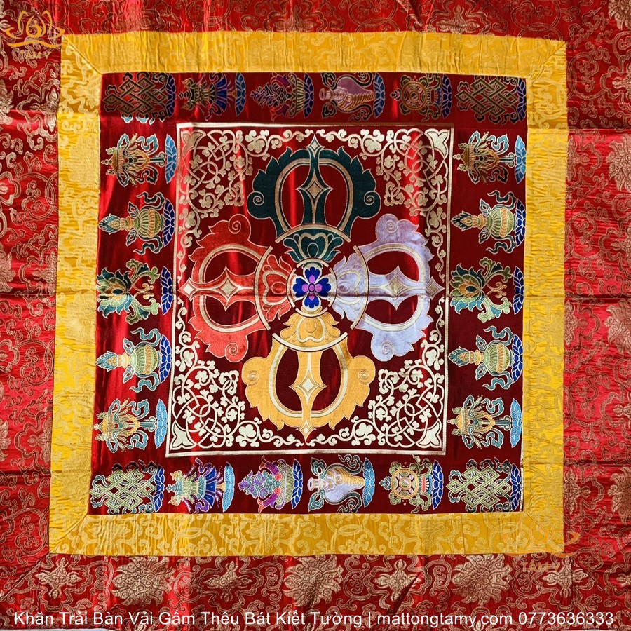 |100x100cm| Khăn trải bàn mật tông vải gấm Tây Tạng thêu chày kim cang kép và bát kiết tường (bát cát tường) - KTB011