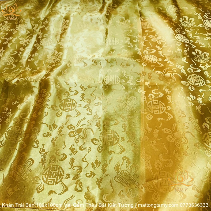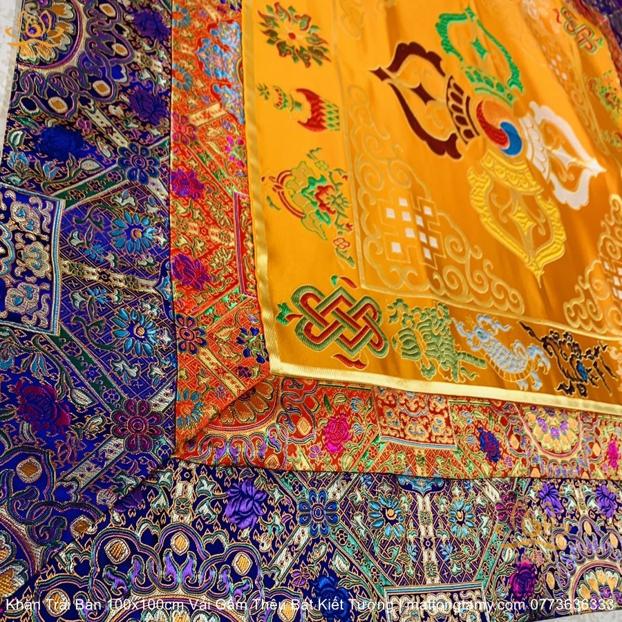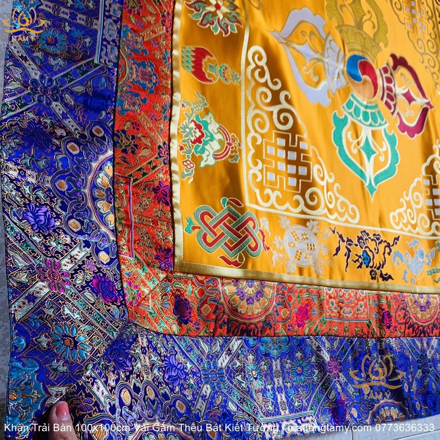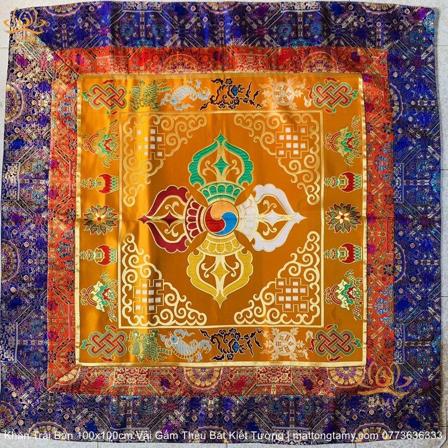 |100x100cm| Khăn trải bàn mật tông vải gấm Tây Tạng thêu chày kim cang kép và bát kiết tường (bát cát tường) - KTB014