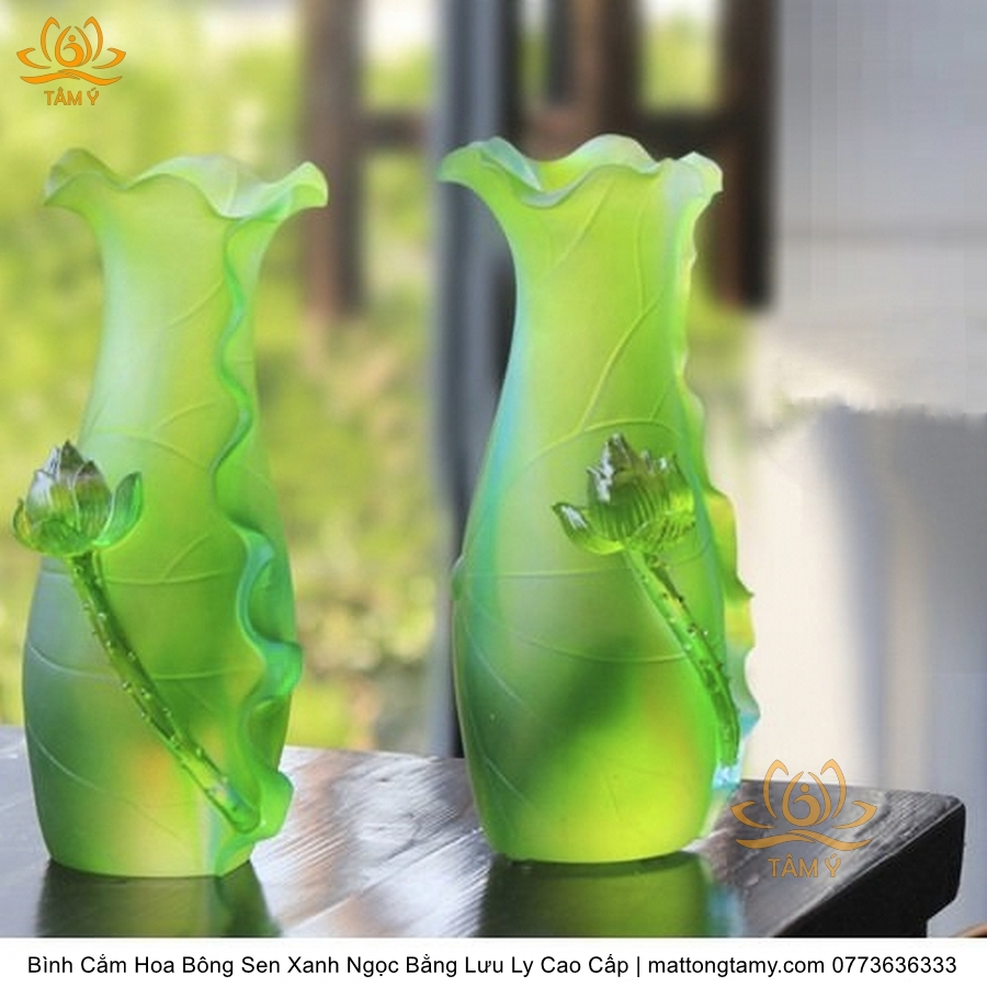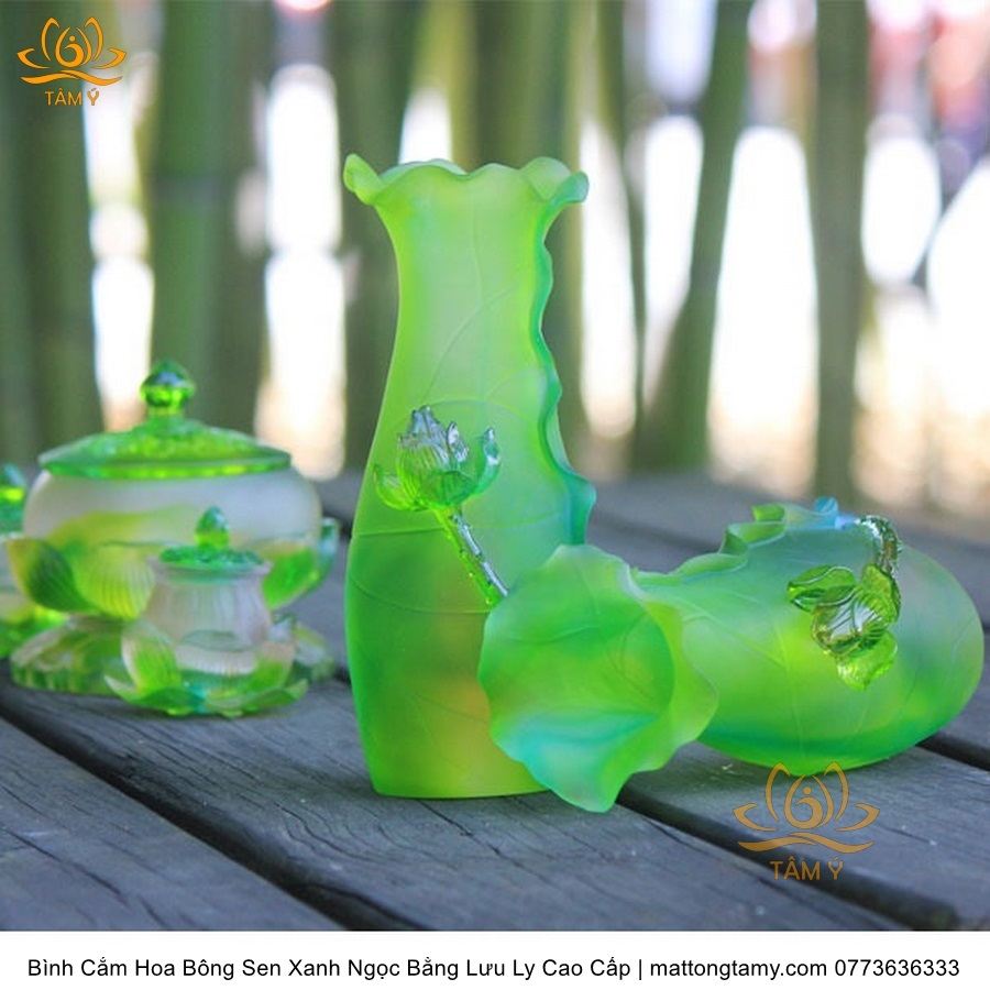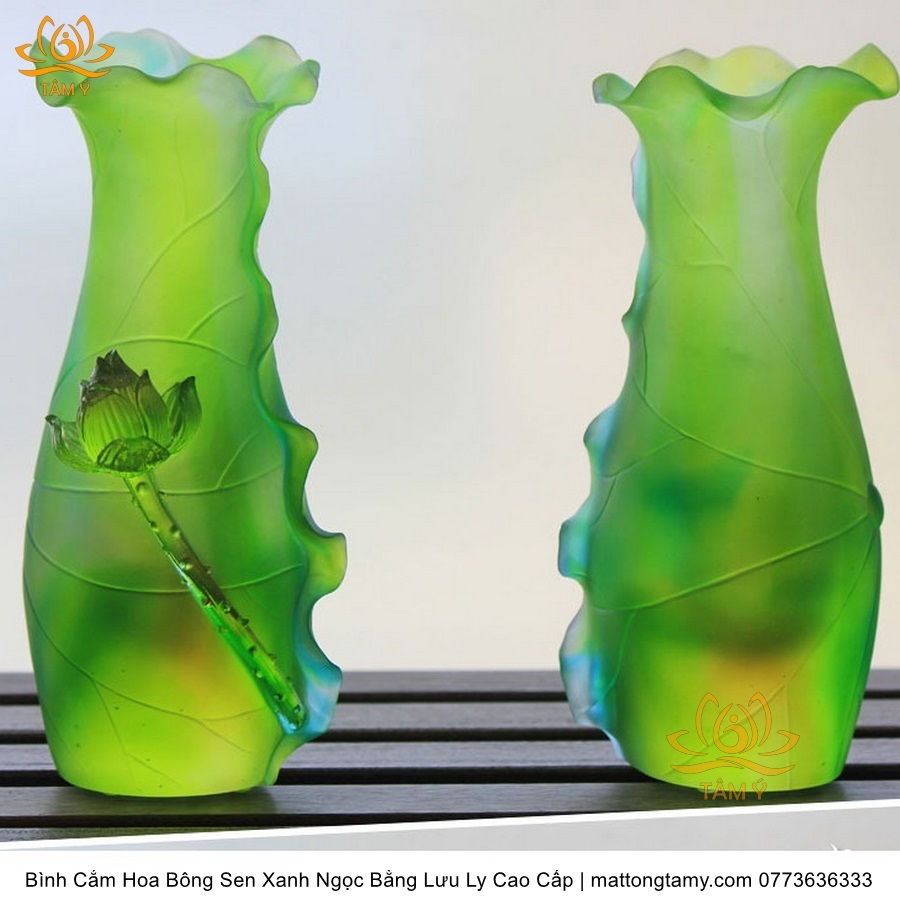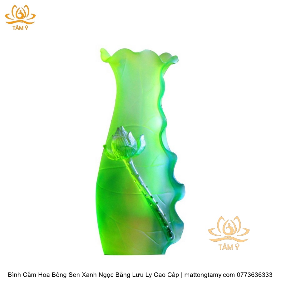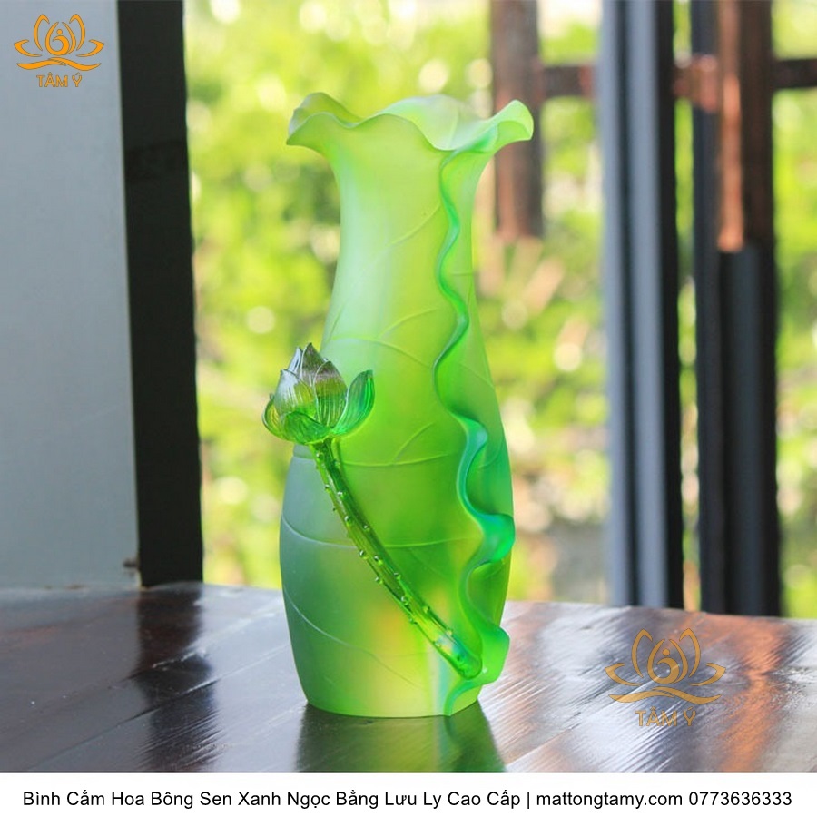 Bình Hoa Bằng Lưu Ly Cao Cấp Khắc Hình Bông Sen Của Quan Âm Bồ Tát Màu Xanh Ngọc, Thiết Kế Sang Trọng, Tinh Xảo BH03