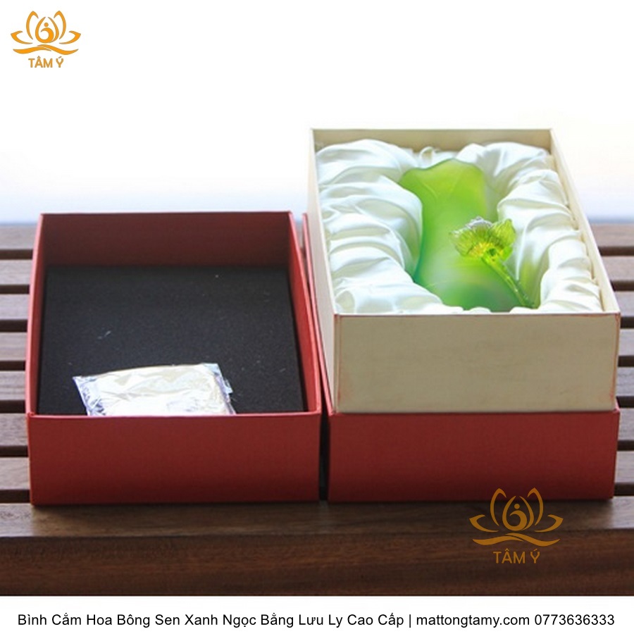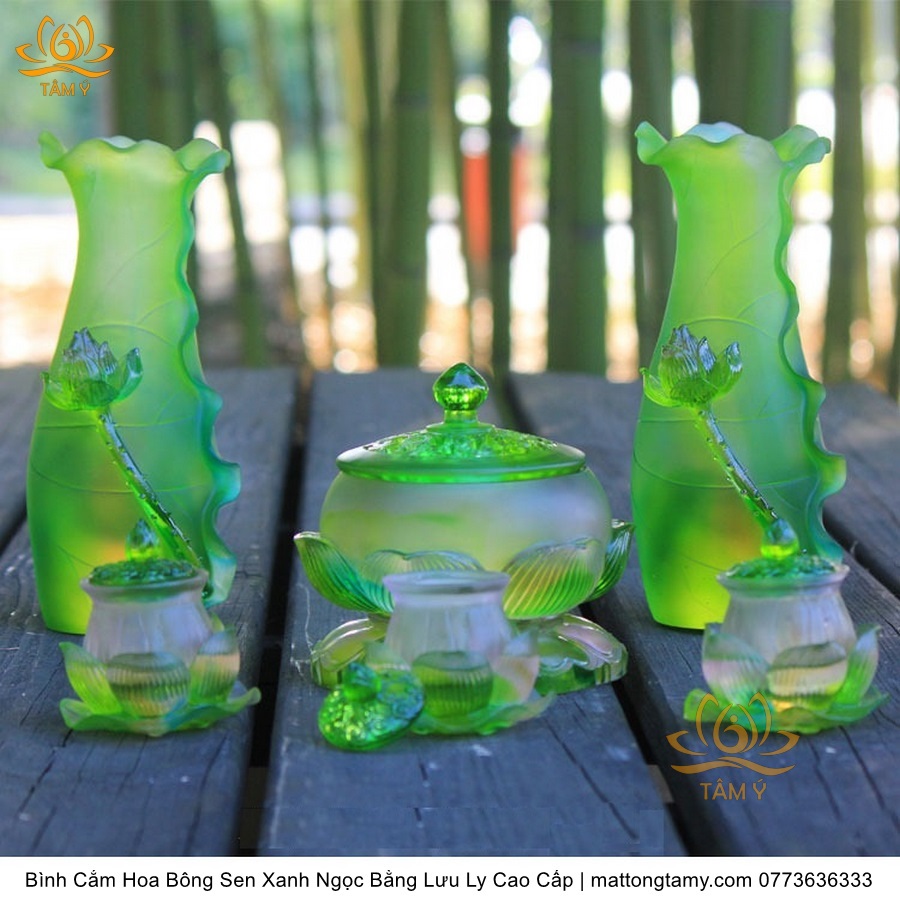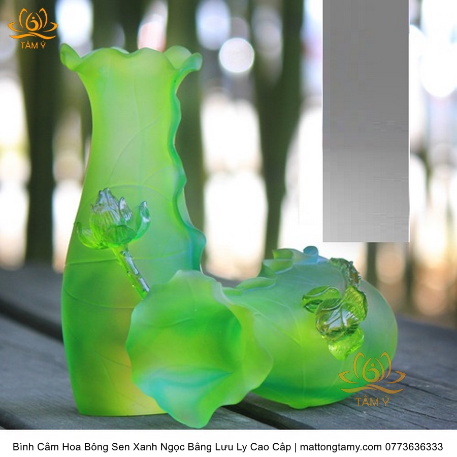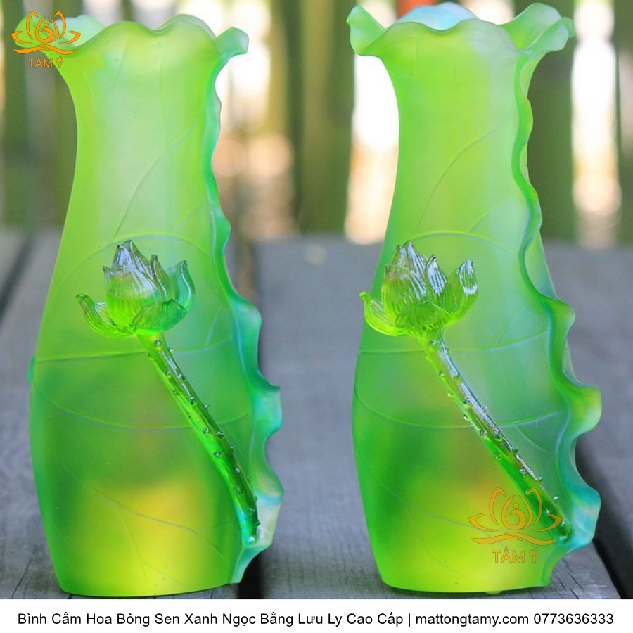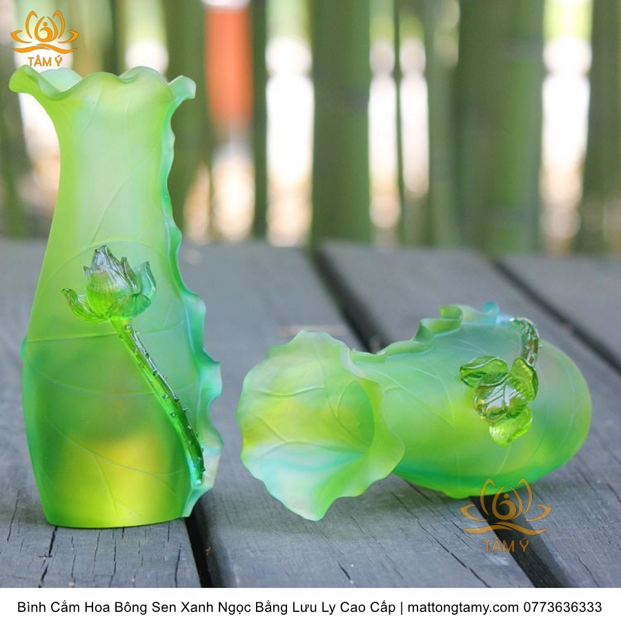 Bình Hoa Bằng Lưu Ly Cao Cấp Khắc Hình Bông Sen Của Quan Âm Bồ Tát Màu Xanh Ngọc, Thiết Kế Sang Trọng, Tinh Xảo BH03