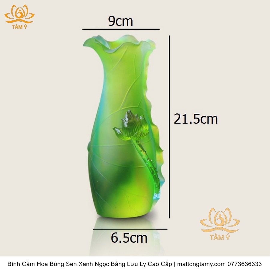 Chất liệu: Lưu Ly Cao Cấp. Kích Thước: Cao 21.5cm, đường kính lớn nhất 6.5cm, đường kính miệng 9cm. Màu sắc: Xanh ngọc. Biểu tượng: Bông sen của Quan Âm Bồ tát.