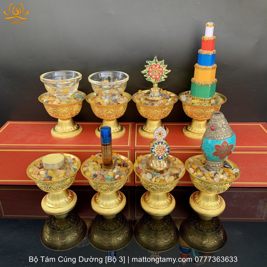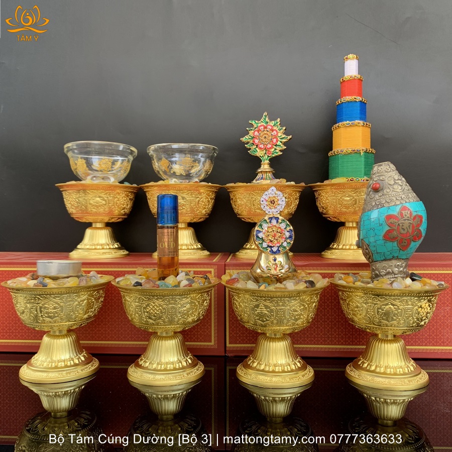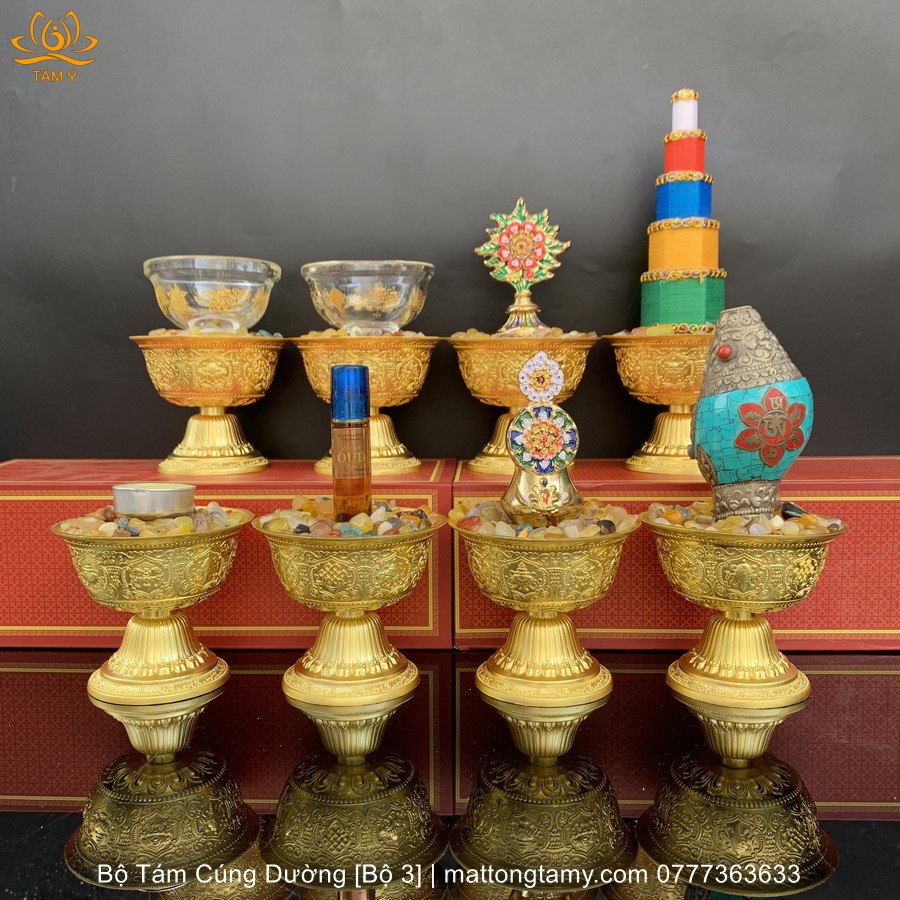 Chúng ta dùng 8 cái chén, và bàn thờ trước đó phải quét dọn sạch sẽ ,cái nầy Phật tử phía Bắc có nhiều chướng ngại do có niềm tin không động vào bàn thờ.Niềm tin đó không có trong truyền thống mật thừa ,bàn thờ phải được quét dọn như một cách tịnh hóa và làm sạch thân thể của quý vị vậy.Khi lau chùi quý vị phải dùng khẩu trang che miệng vì hơi thở và nước bọt có thể làm ô nhiễm phẩm cúng và tránh bụi.Dùng khăn lau chùi các chén cúng theo chiều kim đồng hồ và trì chú OM AH HUM để tịnh hoá vật cúng.Dọn các món cúng dường lên theo chiều từ trái sang phải.Tối thu theo chiều ngược lại đem cất ( phải úp lại).