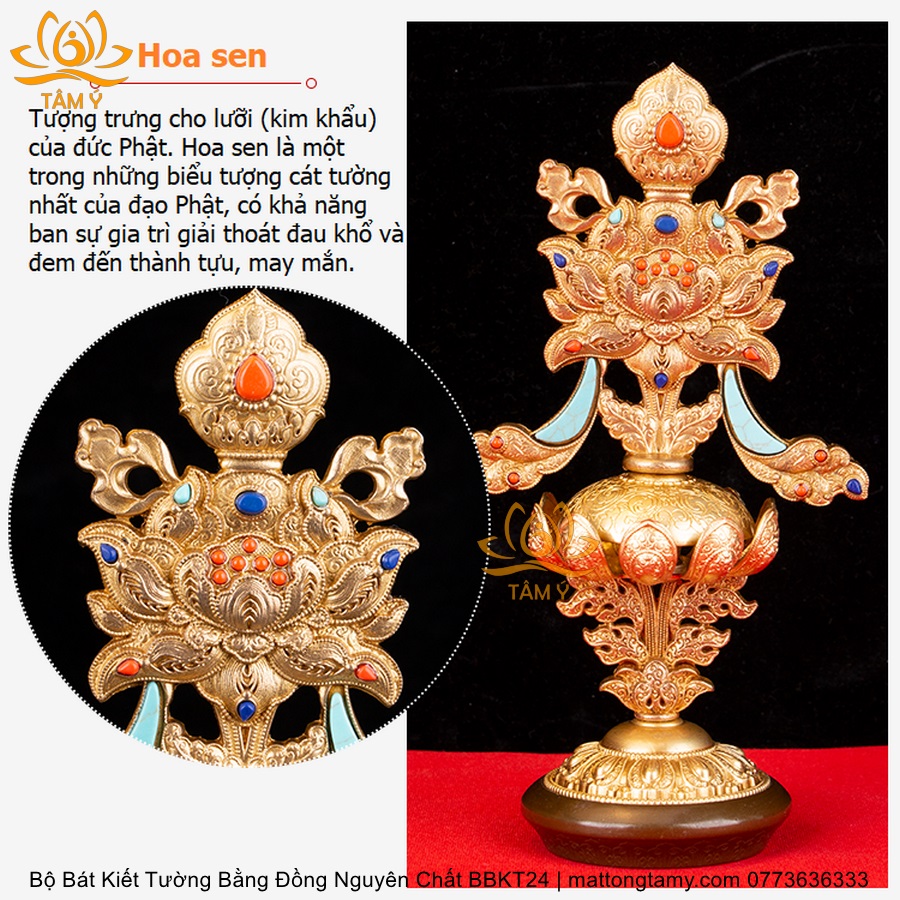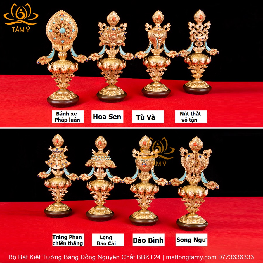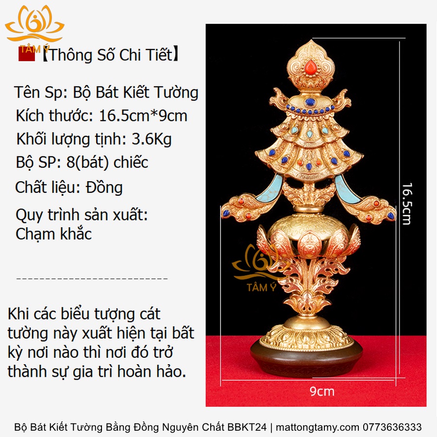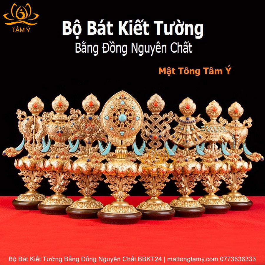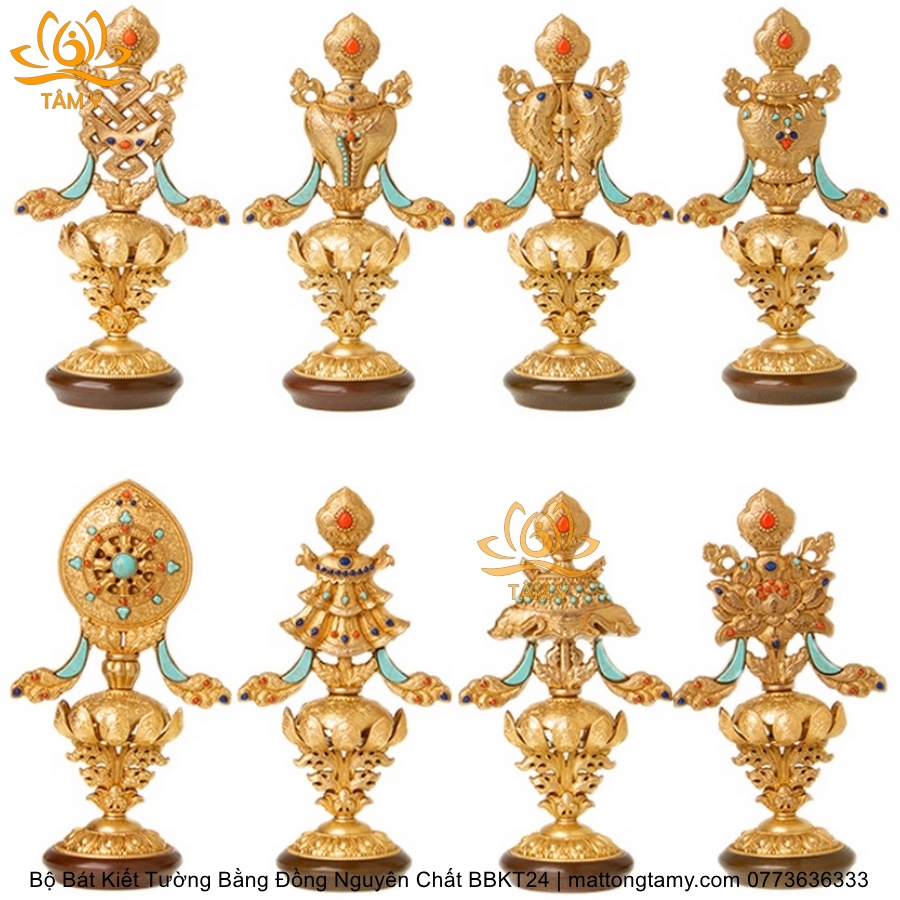 Bộ Bát Kiết Tường (Bát Đại Cát Tường - Tám Tướng Cát Tường) Bệ Sen Mạ Vàng Cao 16.5cm Bằng Đồng Nguyên Chất, Hoàn Thiện Thủ Công BBKT24