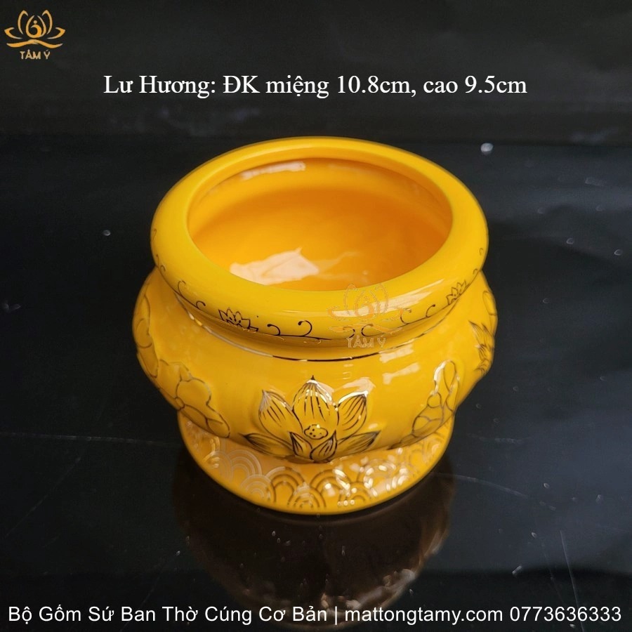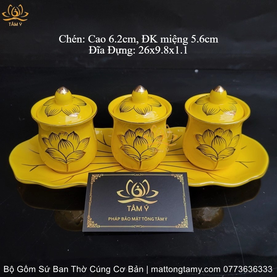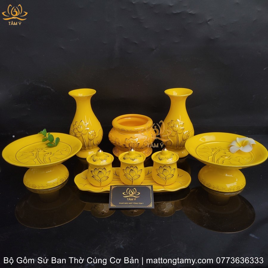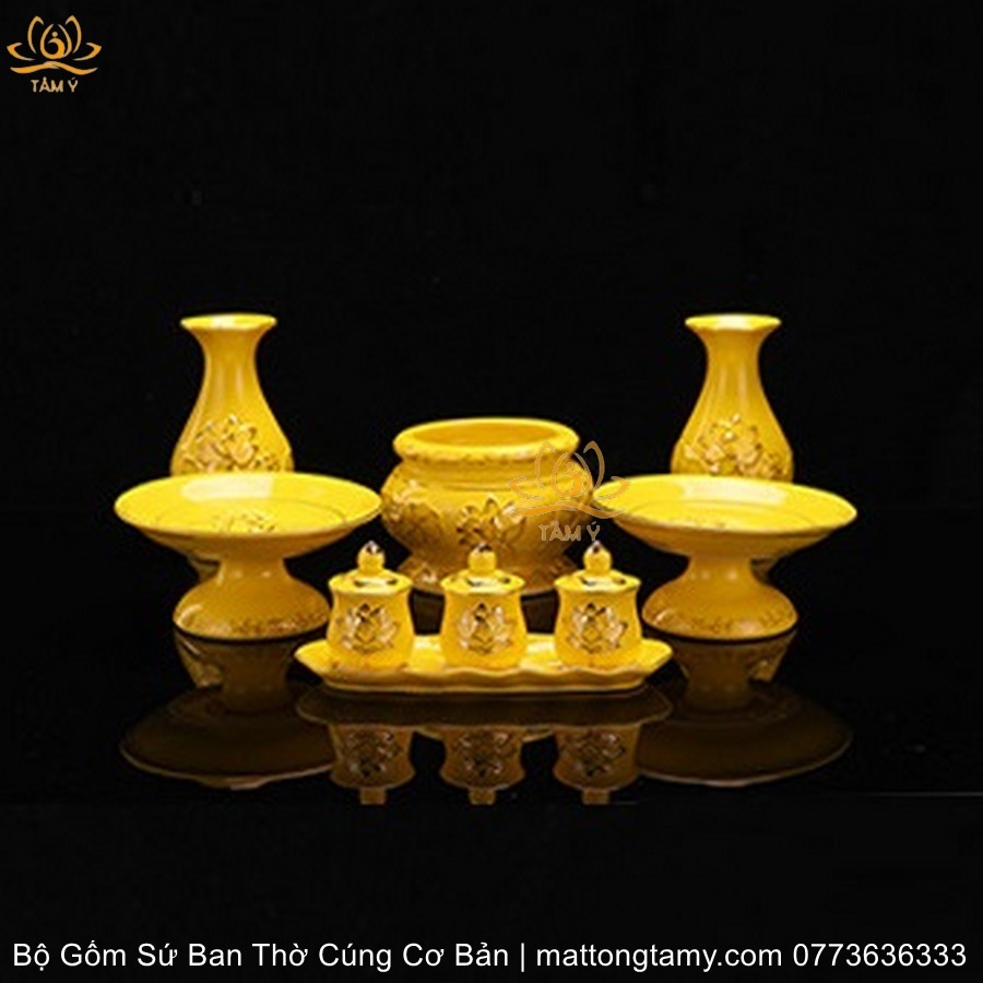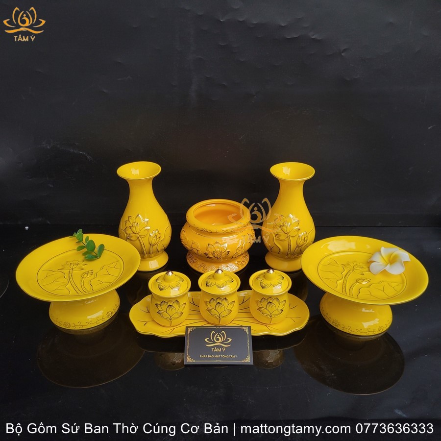 Bộ Gốm Sứ Ban Thờ Cúng Cơ Bản: Lư Hương, Bình Hoa, Đĩa Bồng, Chén Nước Màu Vàng