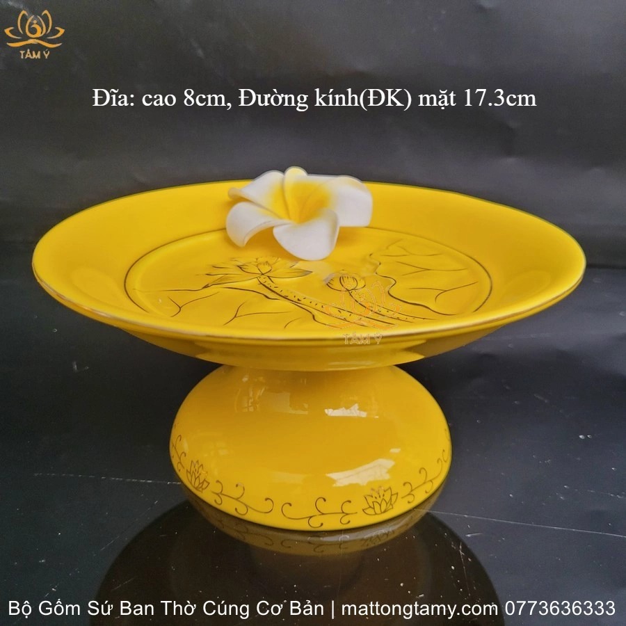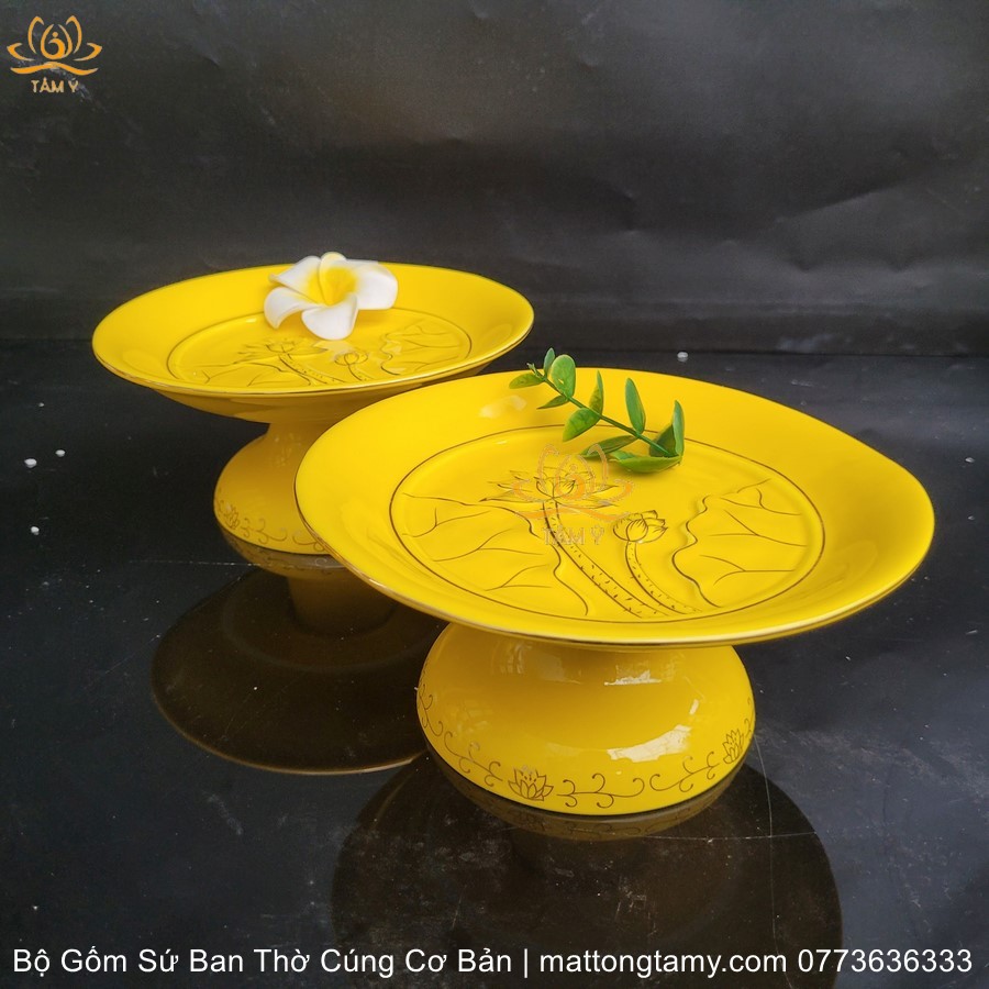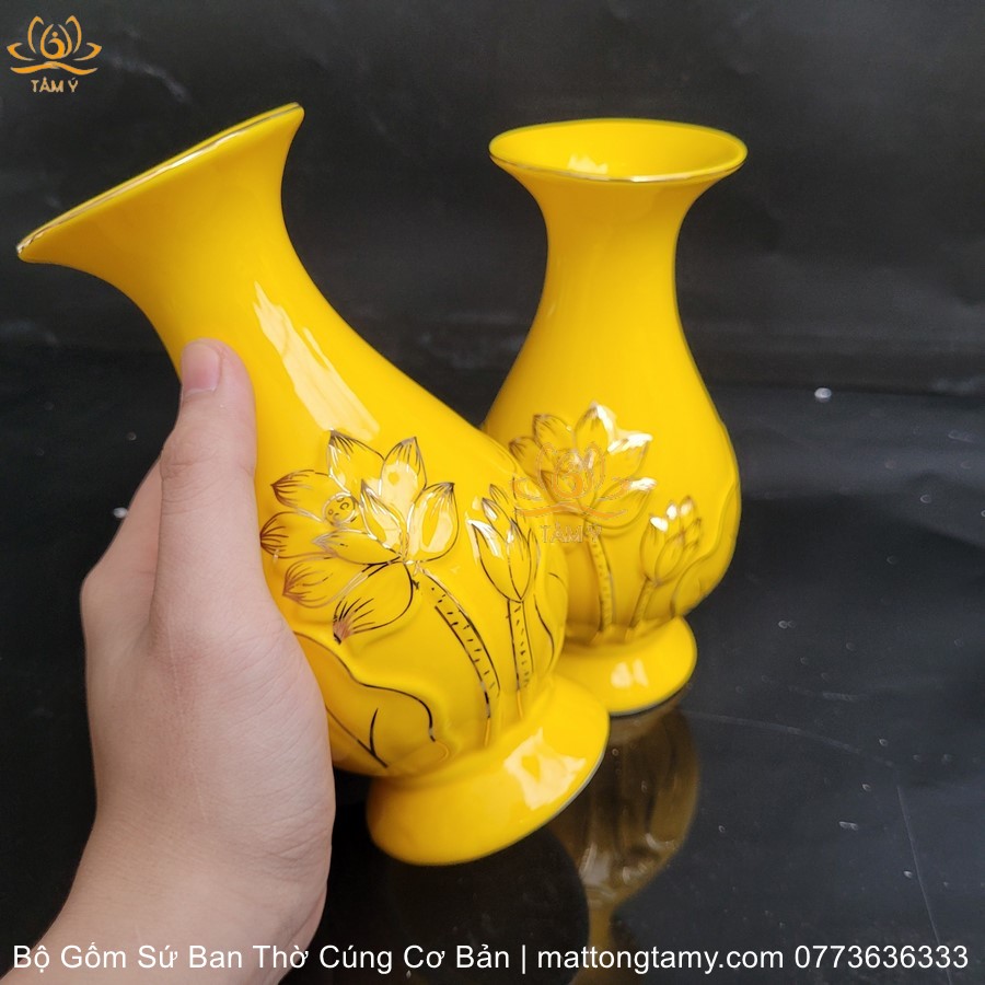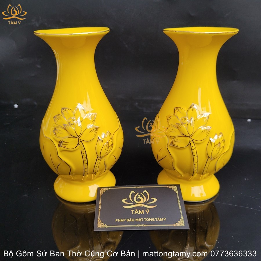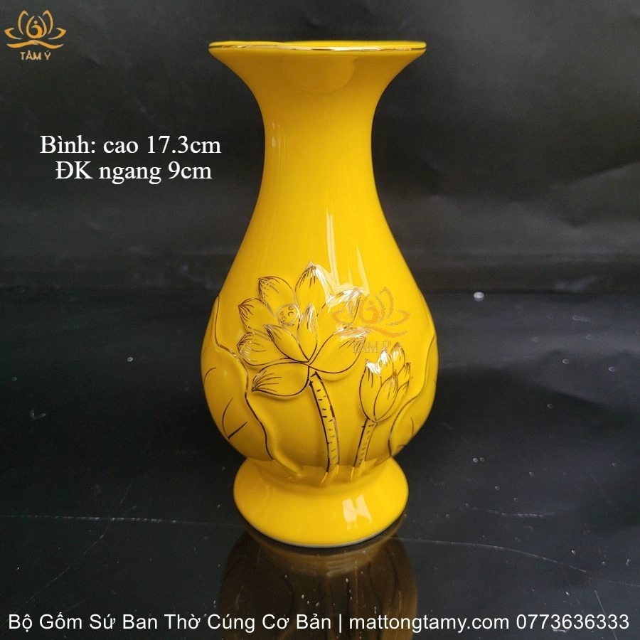 Bộ Gốm Sứ Ban Thờ Cúng Cơ Bản: Lư Hương, Bình Hoa, Đĩa Bồng, Chén Nước Màu Vàng
