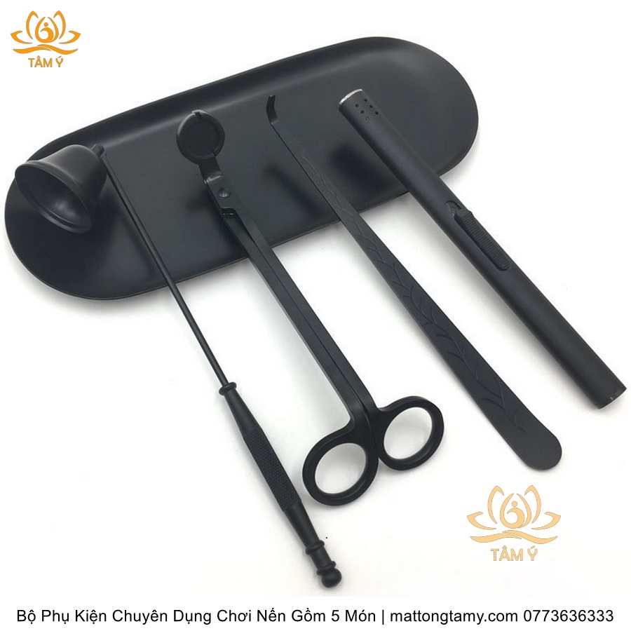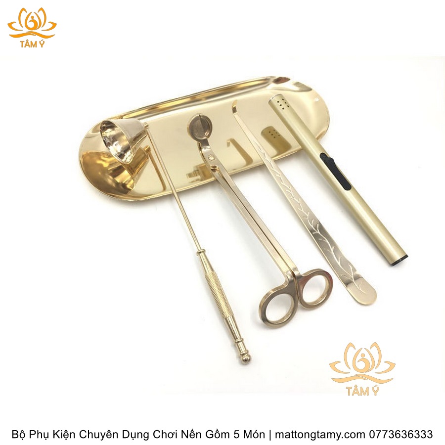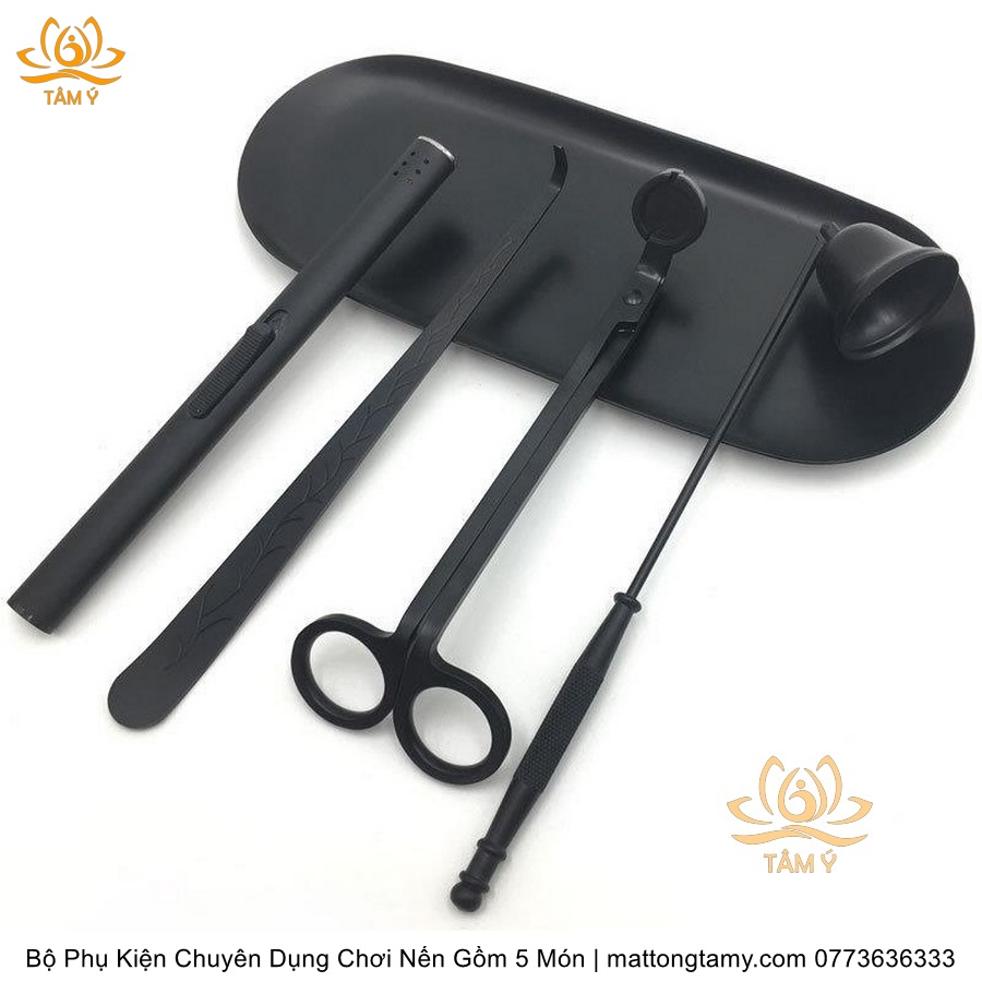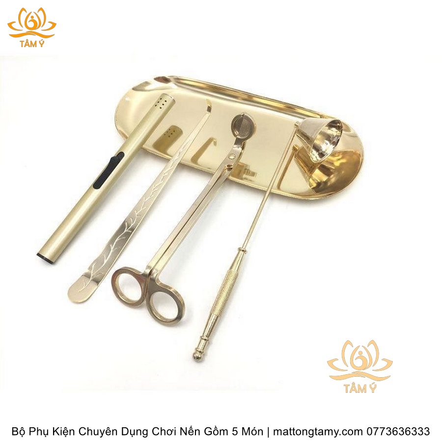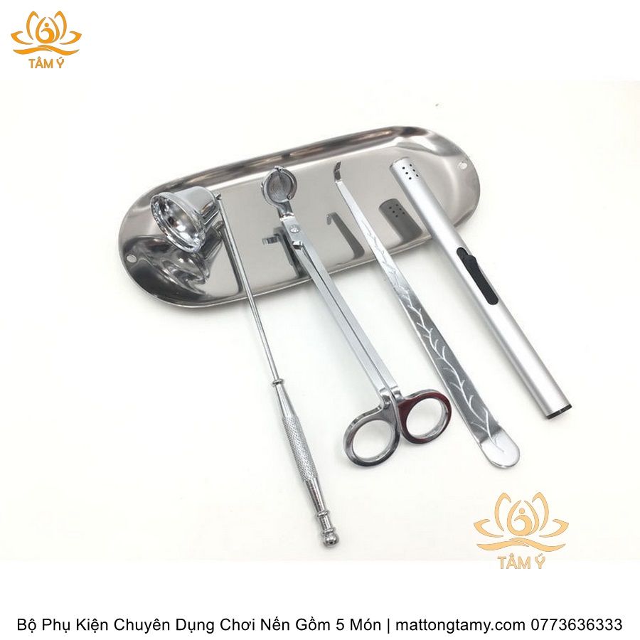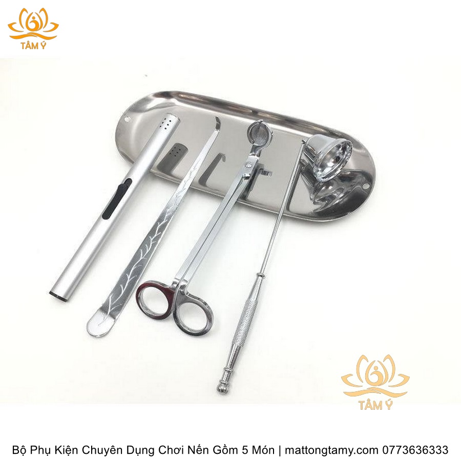 Bộ Phụ Kiện Chuyên Dụng Chơi Nến Gồm 5 Món Kéo Cắt Bấc, Chuông, Khêu, Khay Đựng, Dụng Cụ Đốt Bằng Thép Không Gỉ