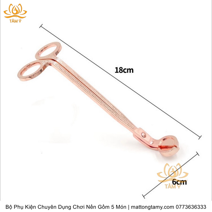 💫Bộ sản phẩm có 4 màu: Đen, vàng, bạc, hồng. 💫Chất Liệu: Thép không gỉ chống mài mòn. ⚜️ Bộ phụ kiện gồm 3 sản phẩm: 1. Kéo cắt bấc chuyên dụng. Kích thước: 18 x 6cm. 2. Chuông dập lửa. Kích thước: 14 x 4 x 3cm. 3. Khêu. Kích thước: 20cm. 4. Khay đựng dụng cụ: 23 x 9.5cm. 5. Dụng cụ đốt nến bằng điện: 17.5 x 2cm.