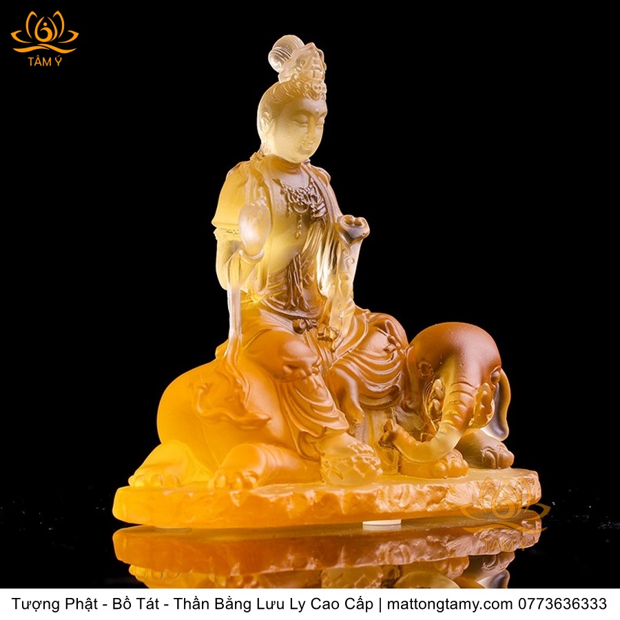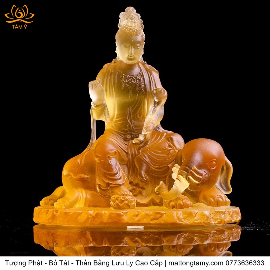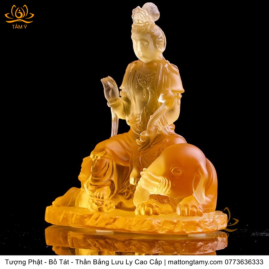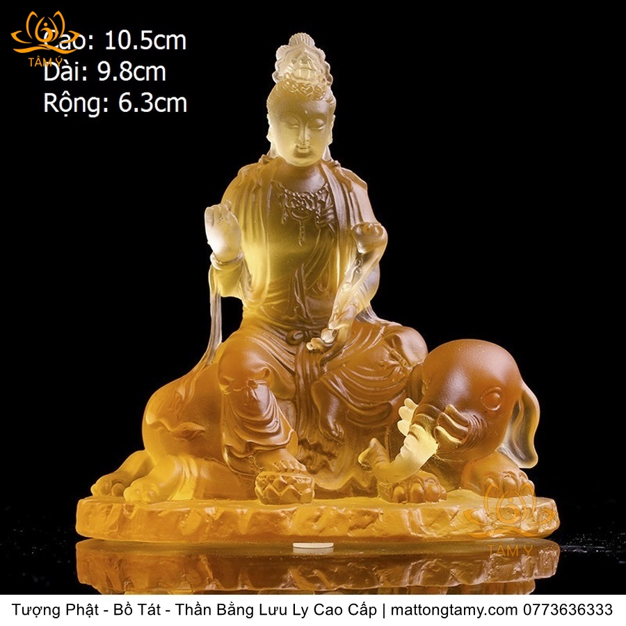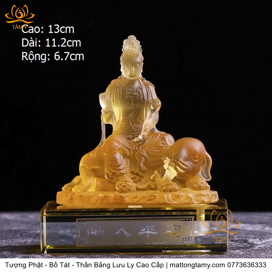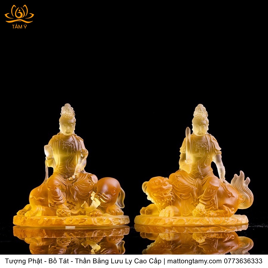 Chất liệu: Lưu Ly Cao Cấp. Kích thước: Có Đế Rời: Cao 13cm, Rộng Trái Qua Phải 11.2cm, Rộng Từ Sau Ra Trước 6.7cm. Không Đế Rời: Cao 10.5cm, Rộng Trái Qua Phải 9.8cm, Rộng Từ Sau Ra Trước 6.3cm. Đức Phổ Hiền tượng trưng cho CHÂN LÝ, còn Đức Văn Thù tượng trưng cho CHÂN TRÍ. Lý trí dung thông. Phổ Hiền tượng trưng cho tam muội, còn Văn Thù tượng trưng cho Bát Nhã. Phổ Hiền tượng trưng cho hạnh, còn Văn Thù tượng trưng cho giải.