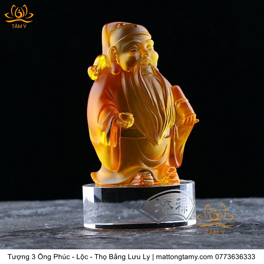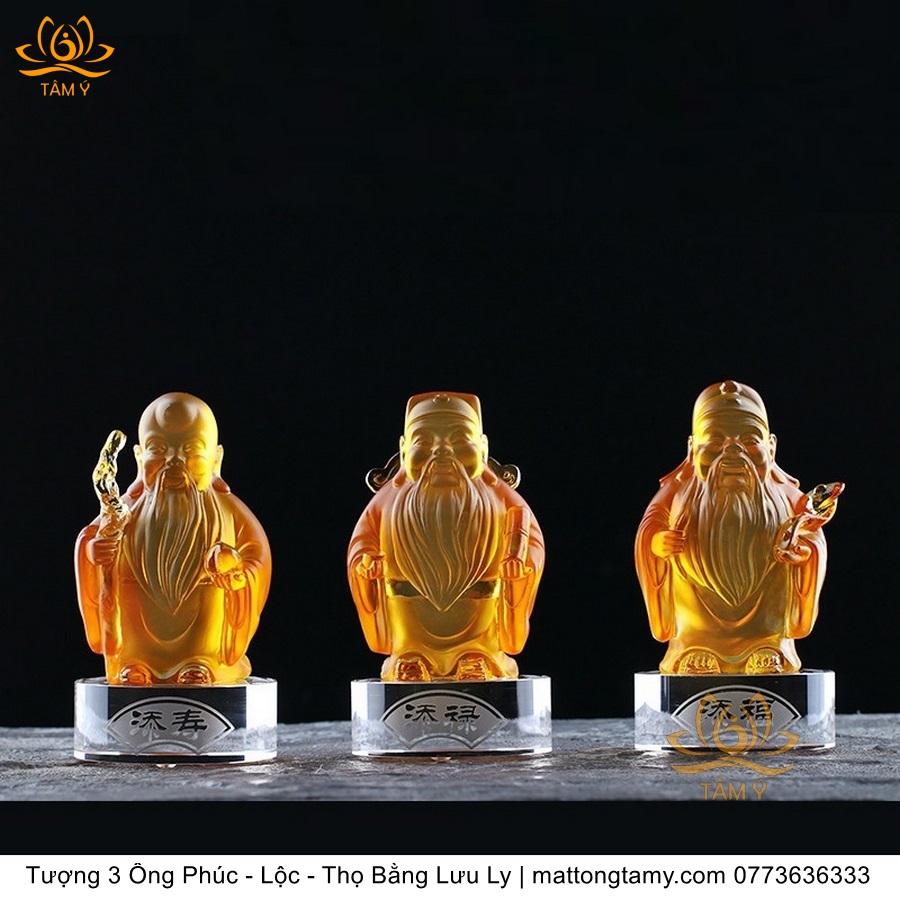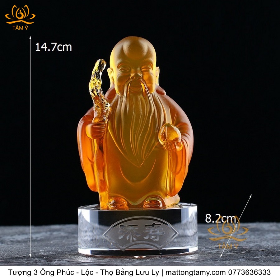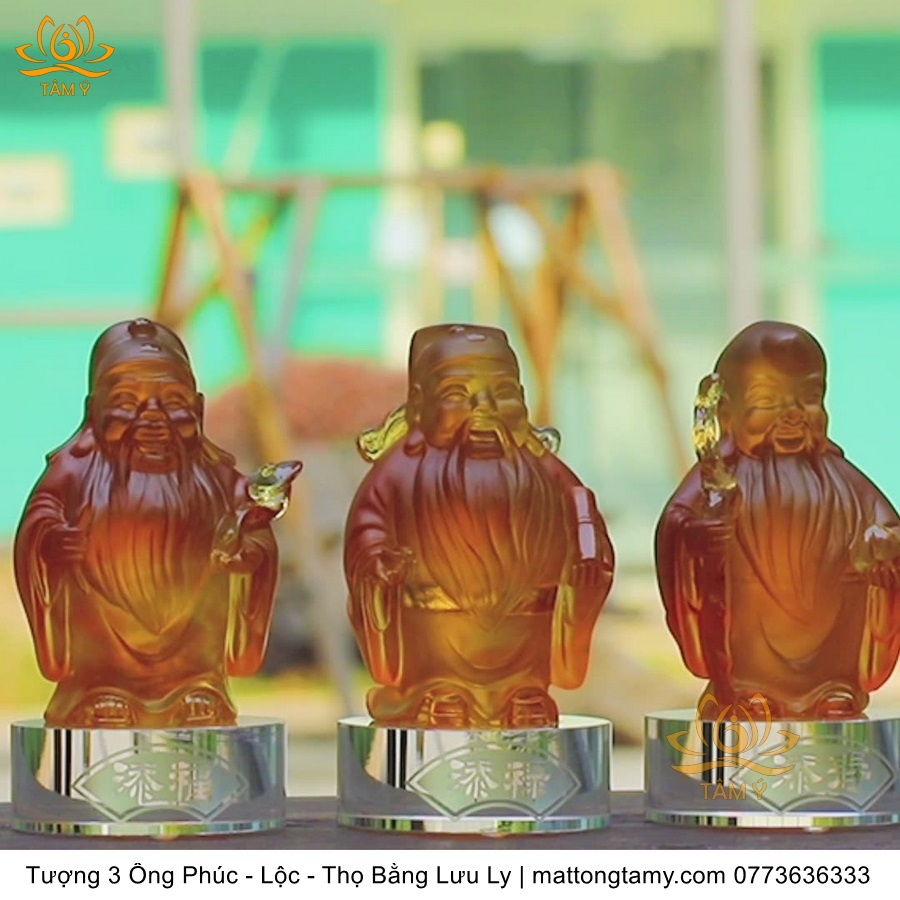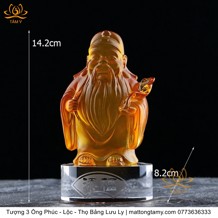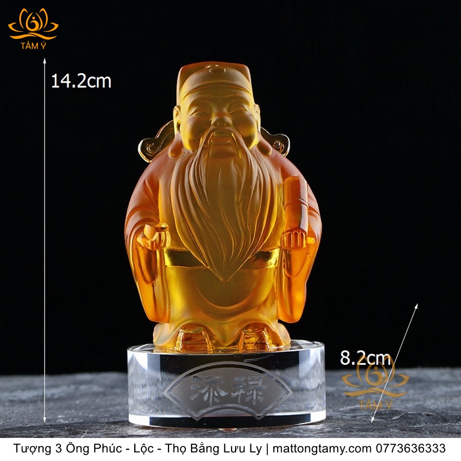 Chất liệu: Lưu ly cao cấp. Kích thước 3 ông thần: Ông Phúc: Cao 14.2cm, Trái qua phải 8.2cm, Trước ra sau 8.2cmcm. Ông Lộc: Cao 14.2cm, Trái qua phải 8.2cm, Trước ra sau 8.2cmcm. Ông Thọ: Cao 14.7cm, Trái qua phải 8.2cm, Trước ra sau 8.2cm. Màu sắc: Hổ Phách
