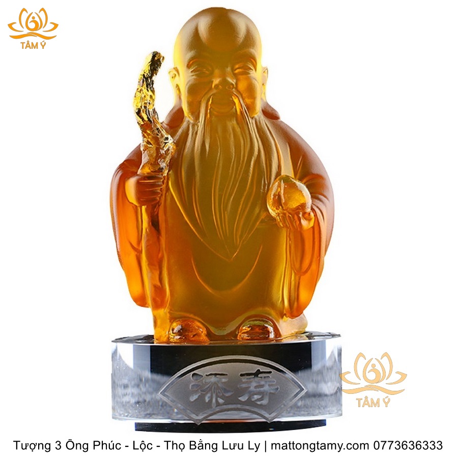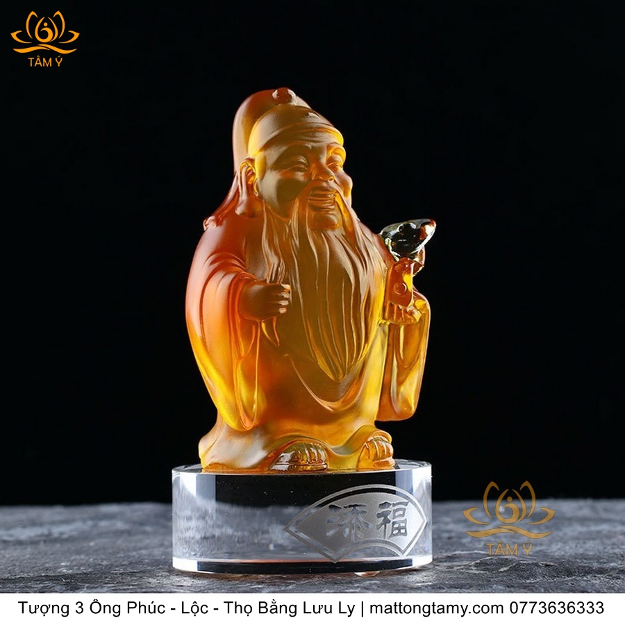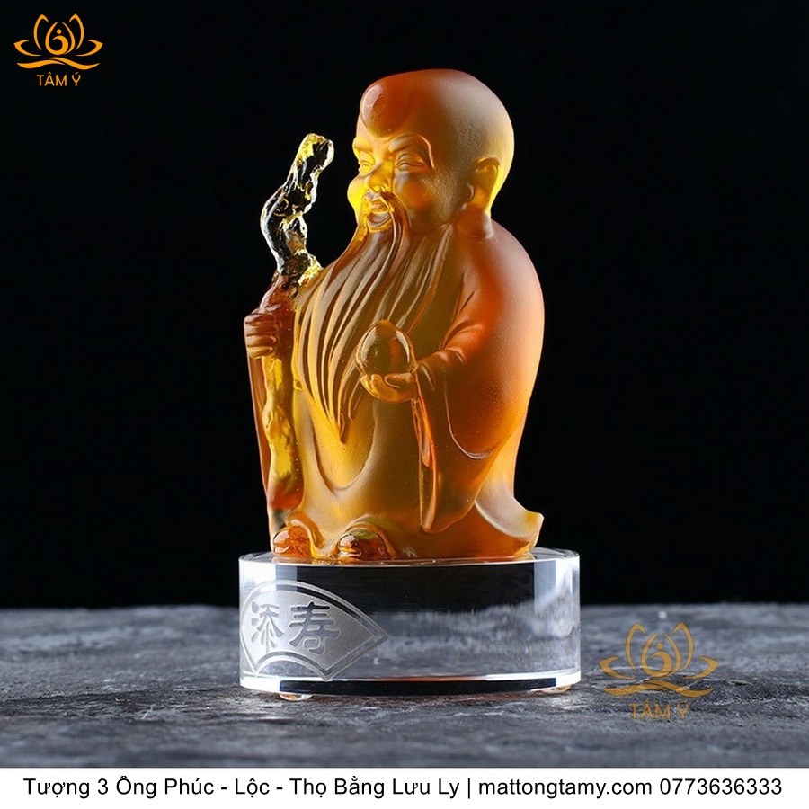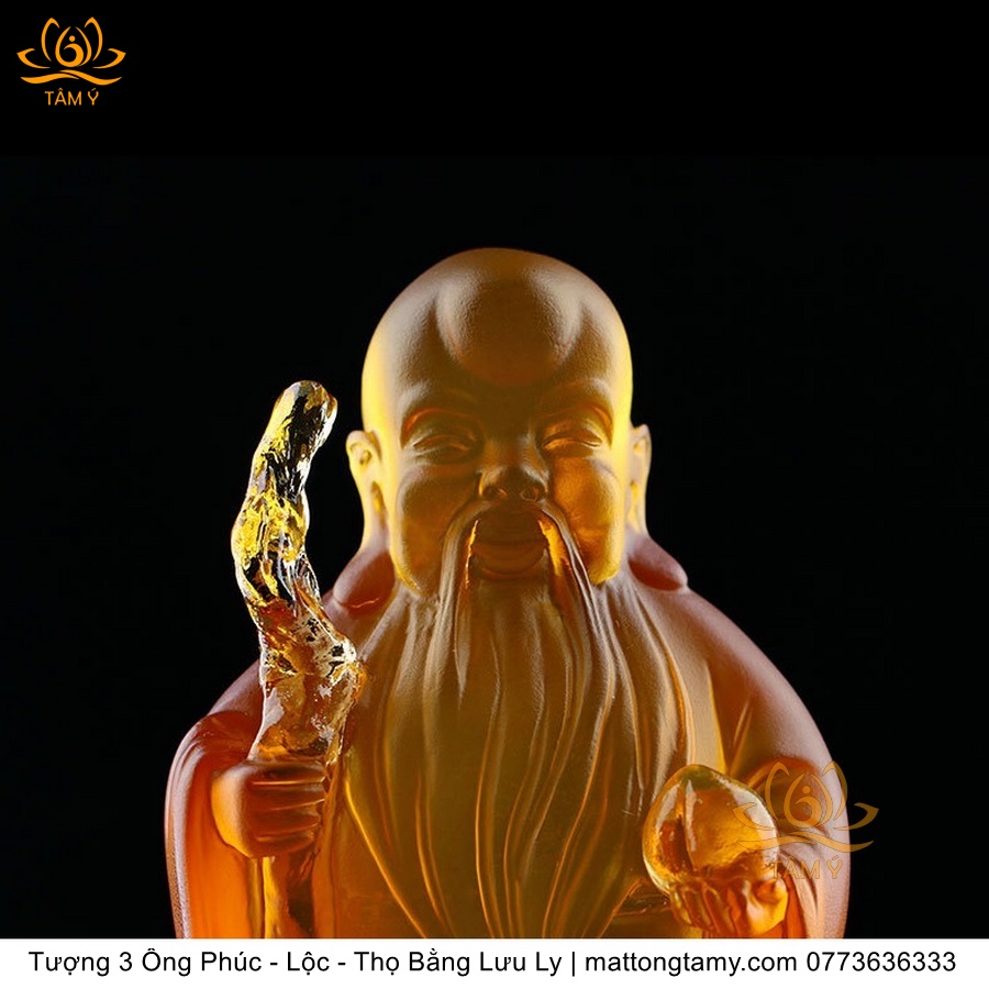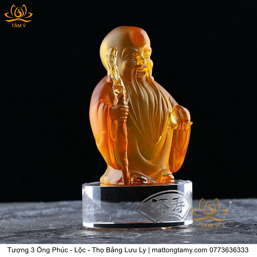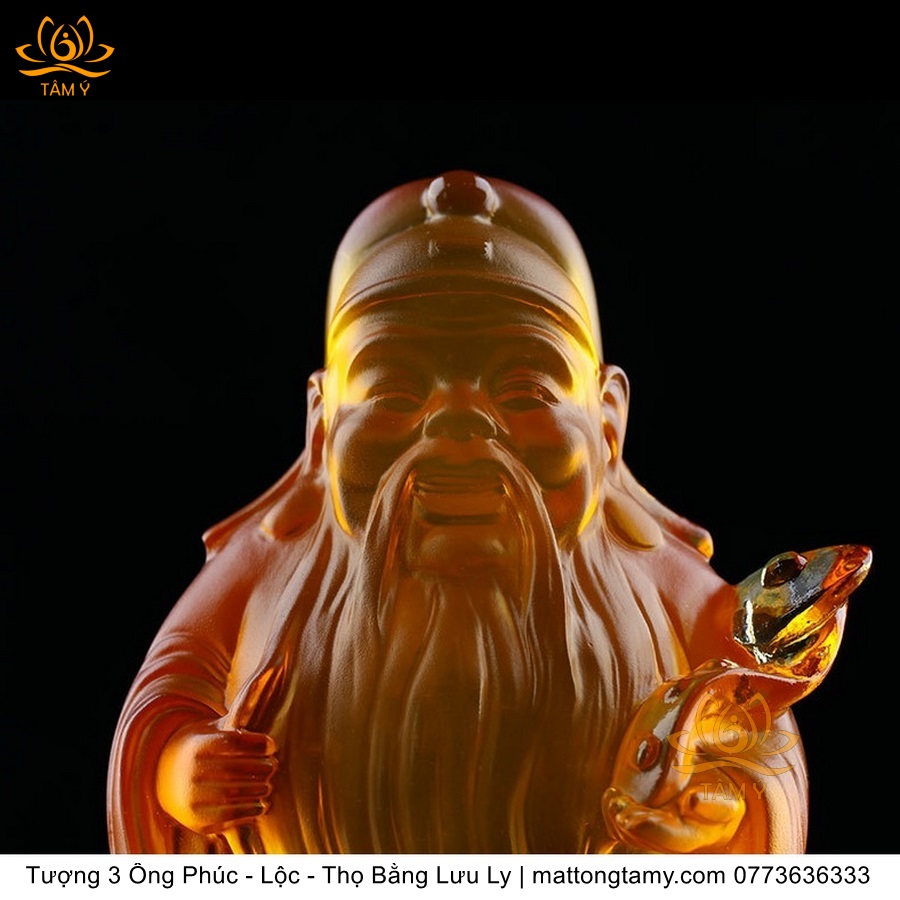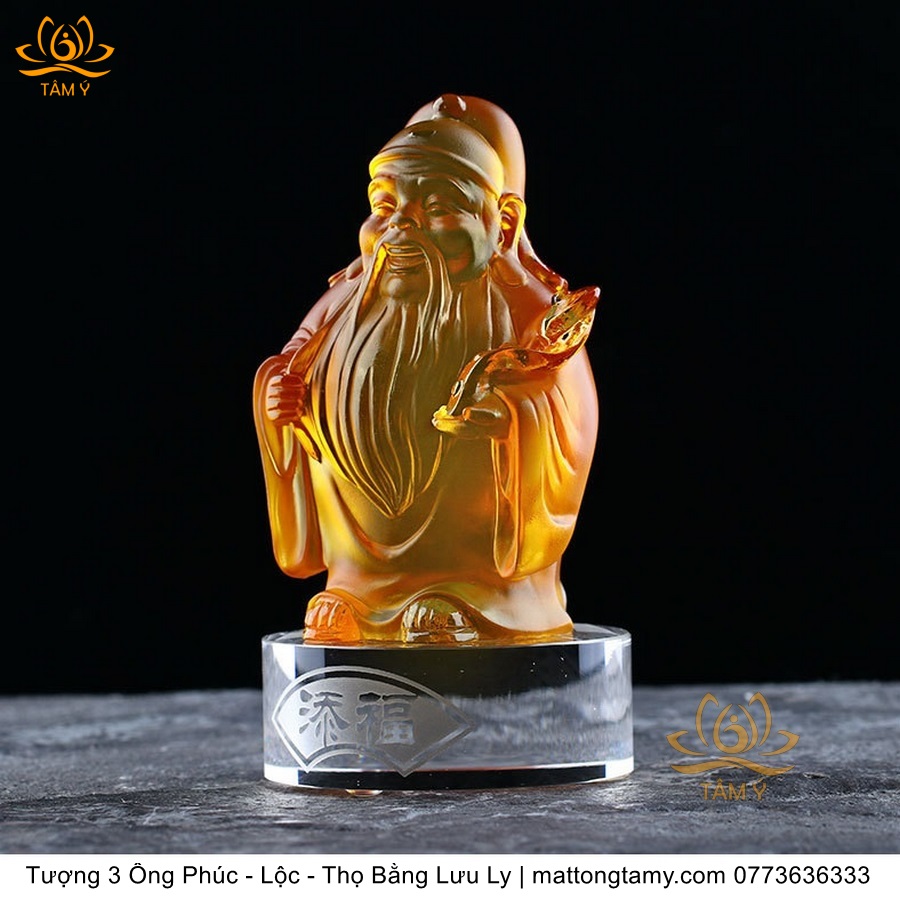 Chất liệu: Lưu ly cao cấp. Kích thước 3 ông thần: Ông Phúc: Cao 14.2cm, Trái qua phải 8.2cm, Trước ra sau 8.2cmcm. Ông Lộc: Cao 14.2cm, Trái qua phải 8.2cm, Trước ra sau 8.2cmcm. Ông Thọ: Cao 14.7cm, Trái qua phải 8.2cm, Trước ra sau 8.2cm. Màu sắc: Hổ Phách