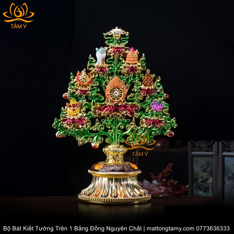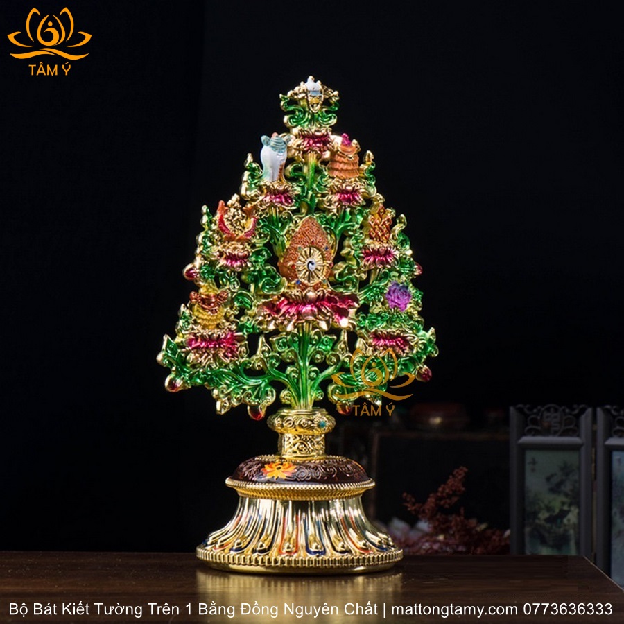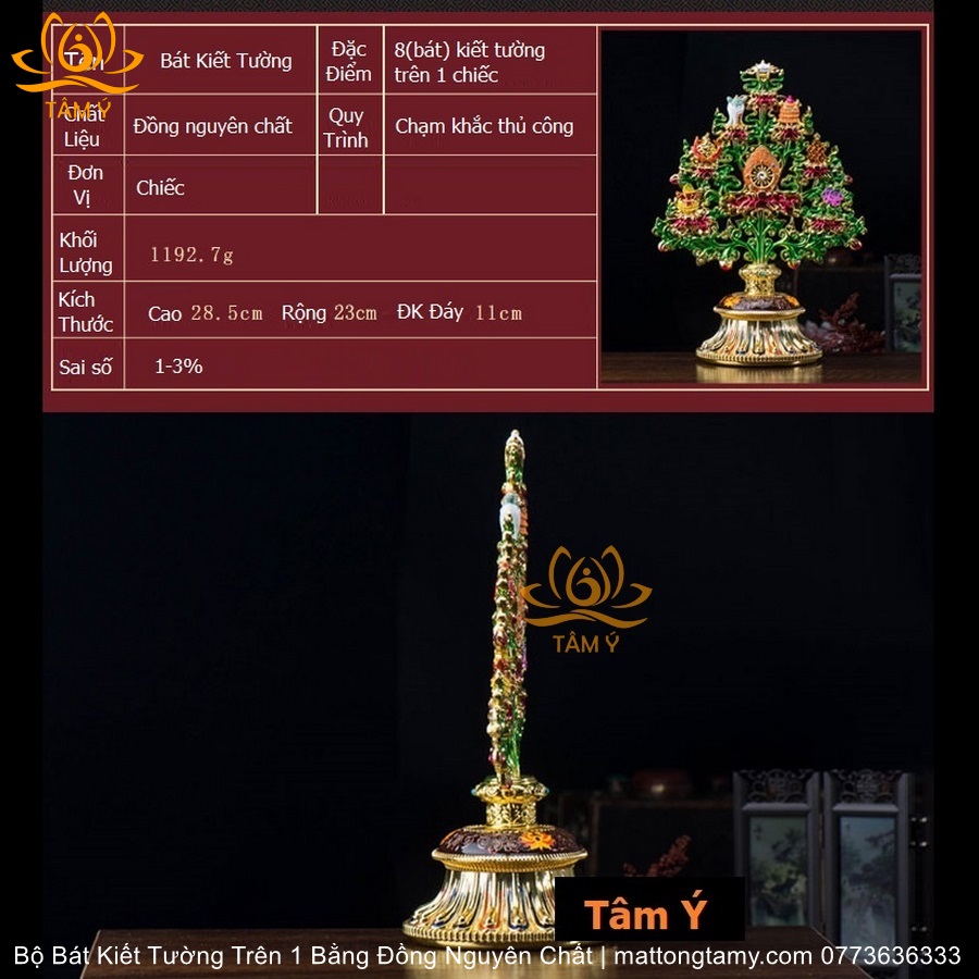 Chất liệu: Đồng Nguyên Chất. Kích thước: Cao 28.5cm, Rộng 23cm, Đk đáy 11cm. Đặc Điểm: 8 biểu tượng Bát Kiết Tường Trên 1 Sản phẩm. Khối lượng: 1192gram. Quy trình sản xuất: Hoàn thiện thủ công.