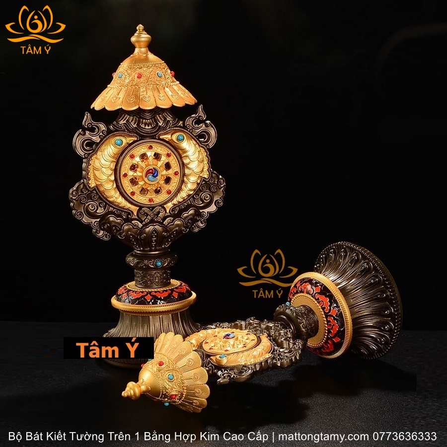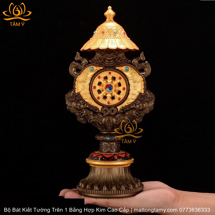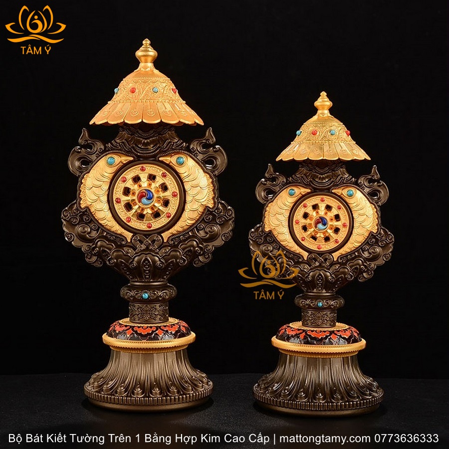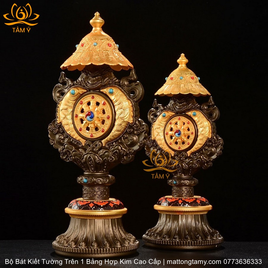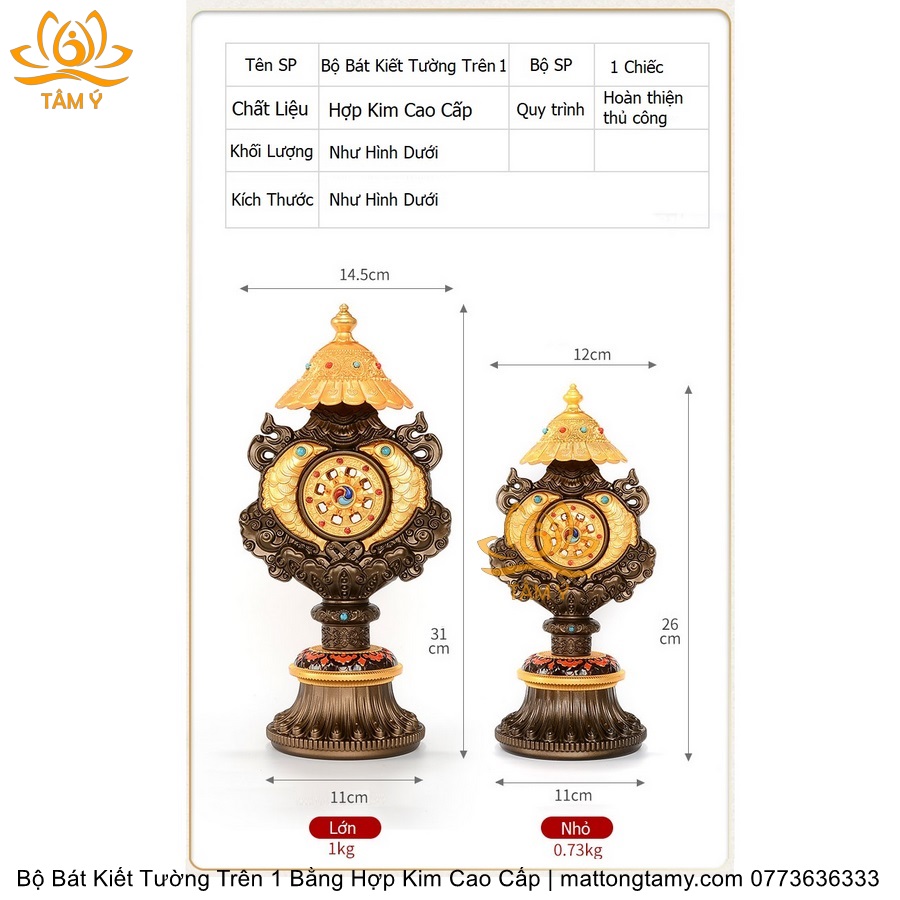 Chất liệu: Hợp Kim Cao Cấp. Kích thước: Lớn: 31cm*14.5cm*11cm, Nhỏ. 26cm*12cm*11cm. Đặc Điểm: 8 biểu tượng Bát Kiết Tường Trên 1 Sản phẩm. Khối lượng: Lớn: 1000gram, Nhỏ: 730gram. Quy trình sản xuất: Hoàn thiện thủ công.