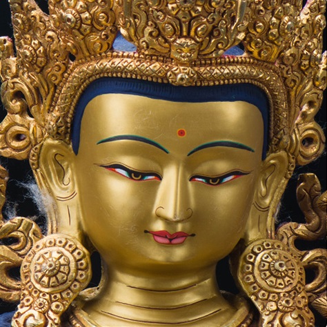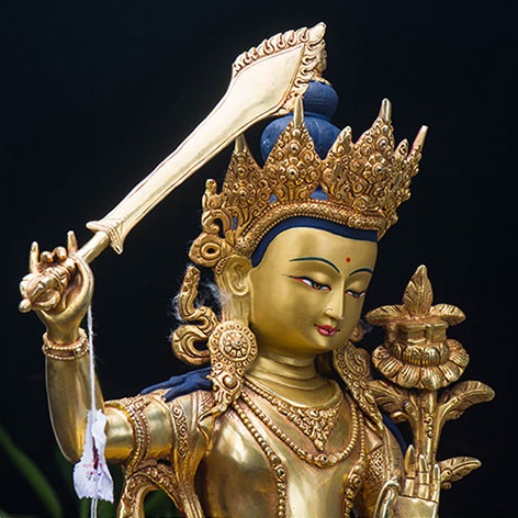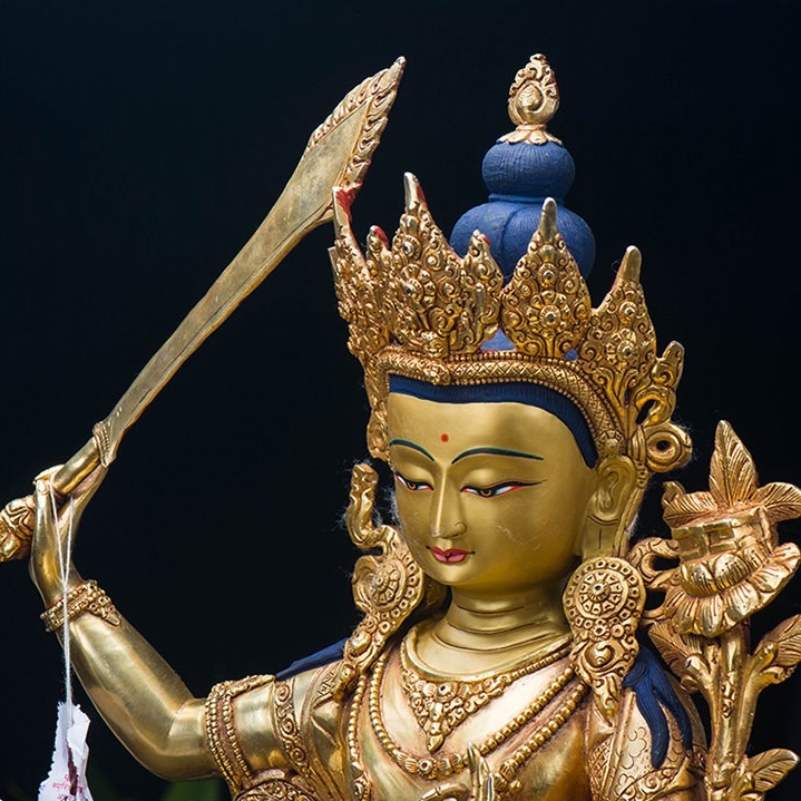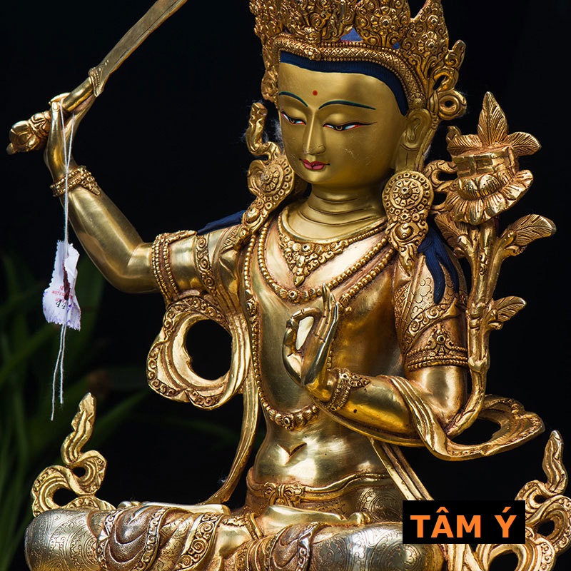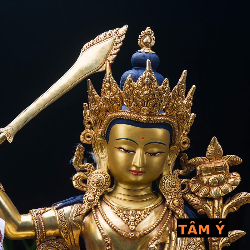 Văn thù Bồ Tát được biết đến là vị đại biểu cho trí tuệ. Ngài có dáng dấp trẻ trung, ngồi kiết già trên một chiếc bồ đoàn bằng hoa sen. Ngài có biểu tượng đặc thù là trên tay phải, dương cao lên khỏi đầu, là một lưỡi gươm đang bốc lửa. Điều này mang hàm ý rằng lưỡi gươm vàng trí tuệ này sẽ chặt đứt tất cả những trói buộc của vô minh phiền não. Đây là những thứ đã cột chặt con người vào với khổ đau, bất hạnh của vòng tròn sinh tử luân hồi. Ngài nguyện làm điều này để đưa con người đến với trí tuệ viên mãn.