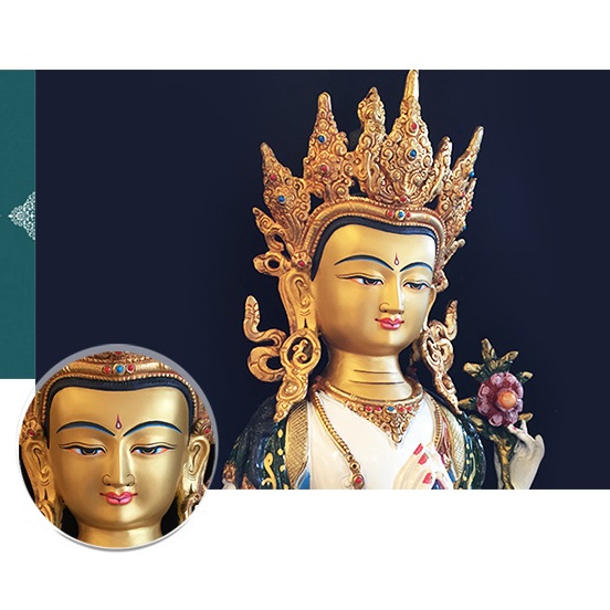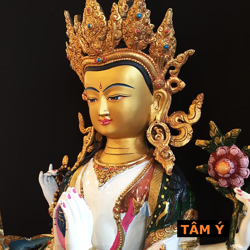 11. Bởi đã thành tựu viên mãn tất cả các công hạnh Ba la mật nên Ngài trang hoàng bằng các bảo báu. Bởi Ngài đã thành tựu Ngũ Trí Phật, là những trí tuệ vốn sẵn có nơi mình và tất cả chúng sinh, nên đầu Ngài đội Bảo quan Ngũ Phật, cùng trang hoàng sắc tướng Đức Di Đà trên đỉnh đầu. Bởi Ngài thấu hiểu được chân lý tương đối và tuyệt đối bất khả phân, tùy duyên lợi ích chúng sinh, tùy duyên trải lòng yêu thương và trí tuệ đến mọi ngóc ngách của cuộc sống cho nên Ngài đeo khuyên tai phải và trái.