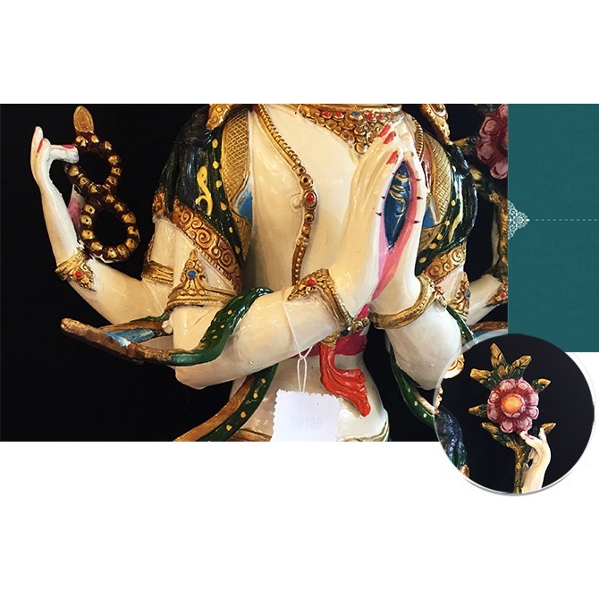 5. Bởi Bồ đề tâm thanh tịnh không mệt mỏi, làm lợi ích cho hết thảy chúng sinh không dừng nghỉ nên tay phải của Ngài trì giữ chuỗi tràng pha lê hay chúng ta gọi là tràng thạch anh trắng nêu biểu Bồ đề tâm thanh tịnh lợi ích chúng sinh.