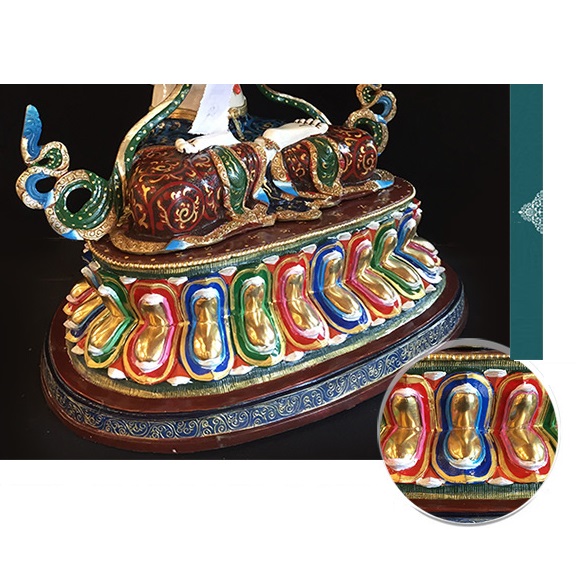 10. Bởi Đức Phật Di Đà - Thượng sư của Ngài là Pháp thân, là đối tượng của tâm chí thành, còn Đức Quan Âm là tình yêu thương hiển hiện trong hành động độ sinh cho nên Đức Phật Di Đà an trụ trên đỉnh đầu Ngài để nêu biểu sự hợp nhất chưa từng phân cách giữa tình yêu thương và trí tuệ giác ngộ.
