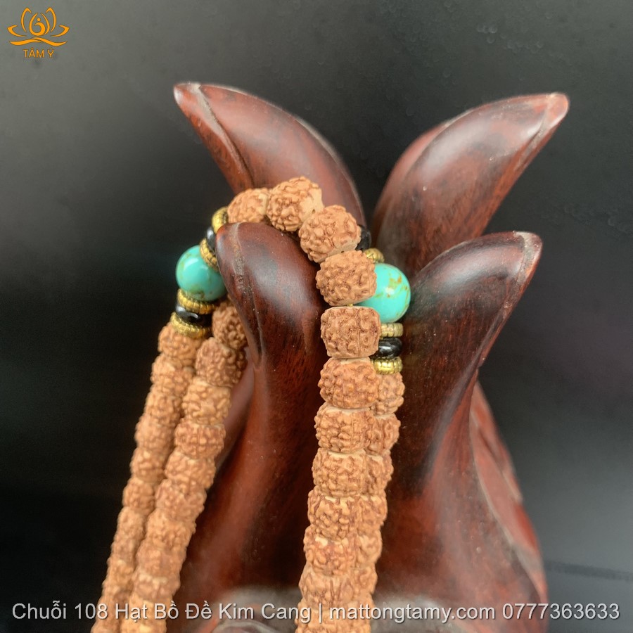 Kích thước mỗi hạt Đồ Đề Kim Cang: 8.8-9.0x6.8mm đã mài 2 đầu, xen lẫn là các hạt lam ngọc và mã não trang trí