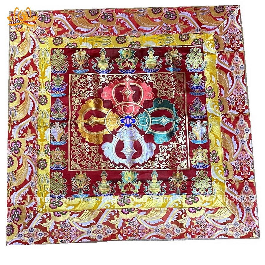 |100x100cm| Khăn trải bàn mật tông cỡ to vải gấm Tây Tạng cao cấp thêu chày kim cang kép và bát kiết tường (bát cát tường) - KTB016