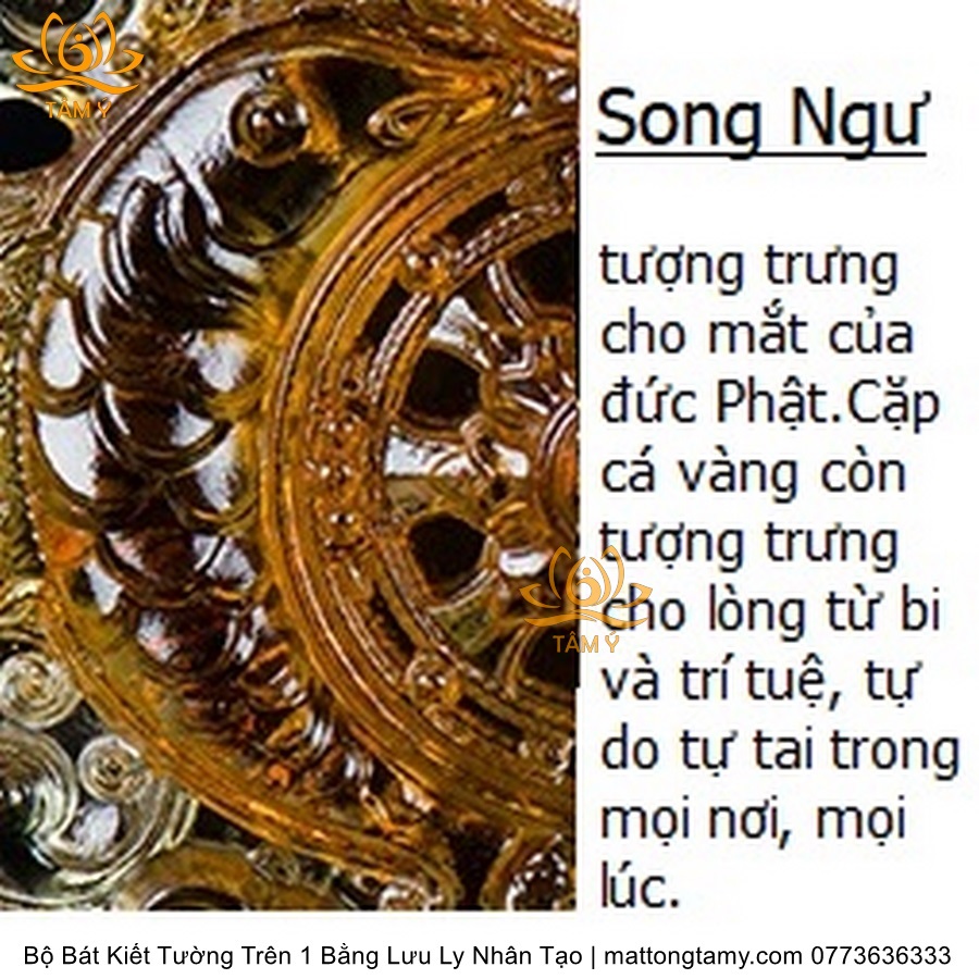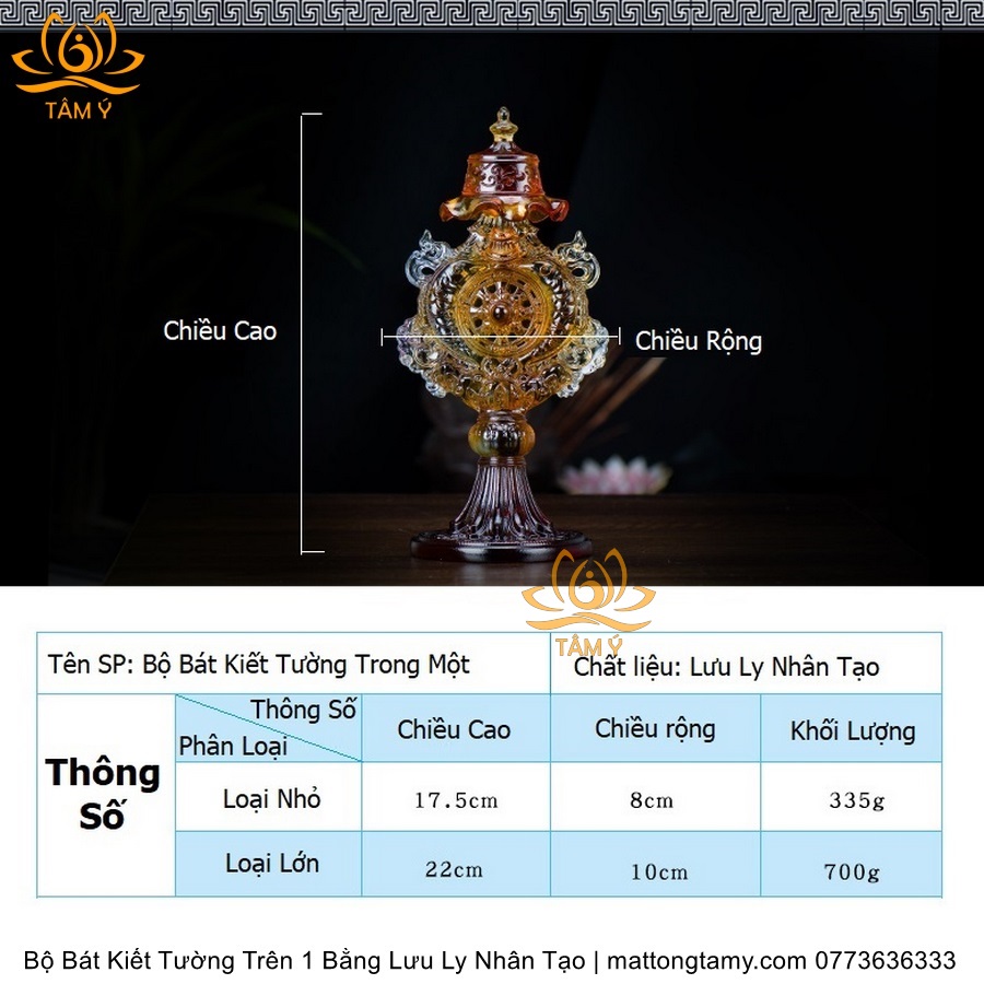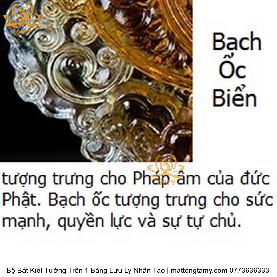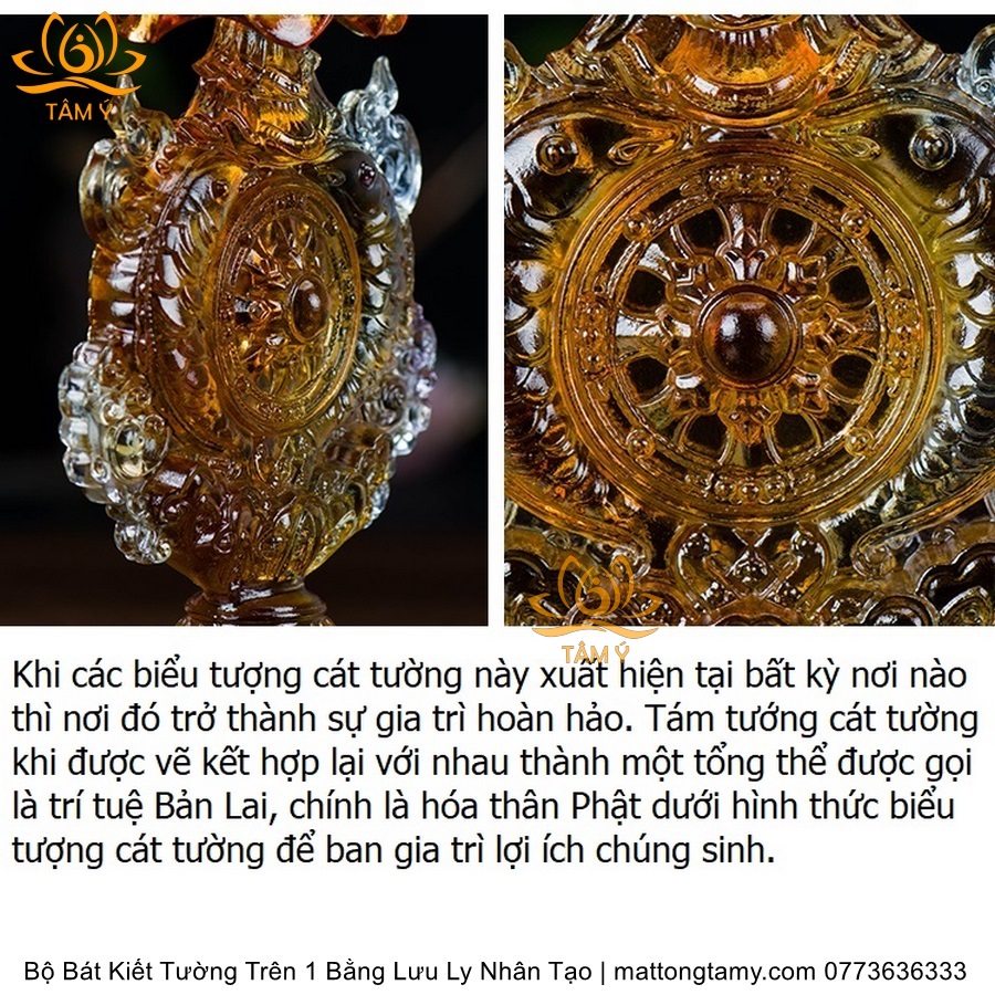 Chất liệu: Lưu ly nhân tạo. Kích thước: Lớn: 23cm*10cm, Nhỏ. 17.5cm*8cm. Đặc Điểm: 8 biểu tượng Bát Kiết Tường Trên 1 Sản phẩm. Khối lượng: Lớn: 700gram, Nhỏ: 335gram. Quy trình sản xuất: Hoàn thiện thủ công.