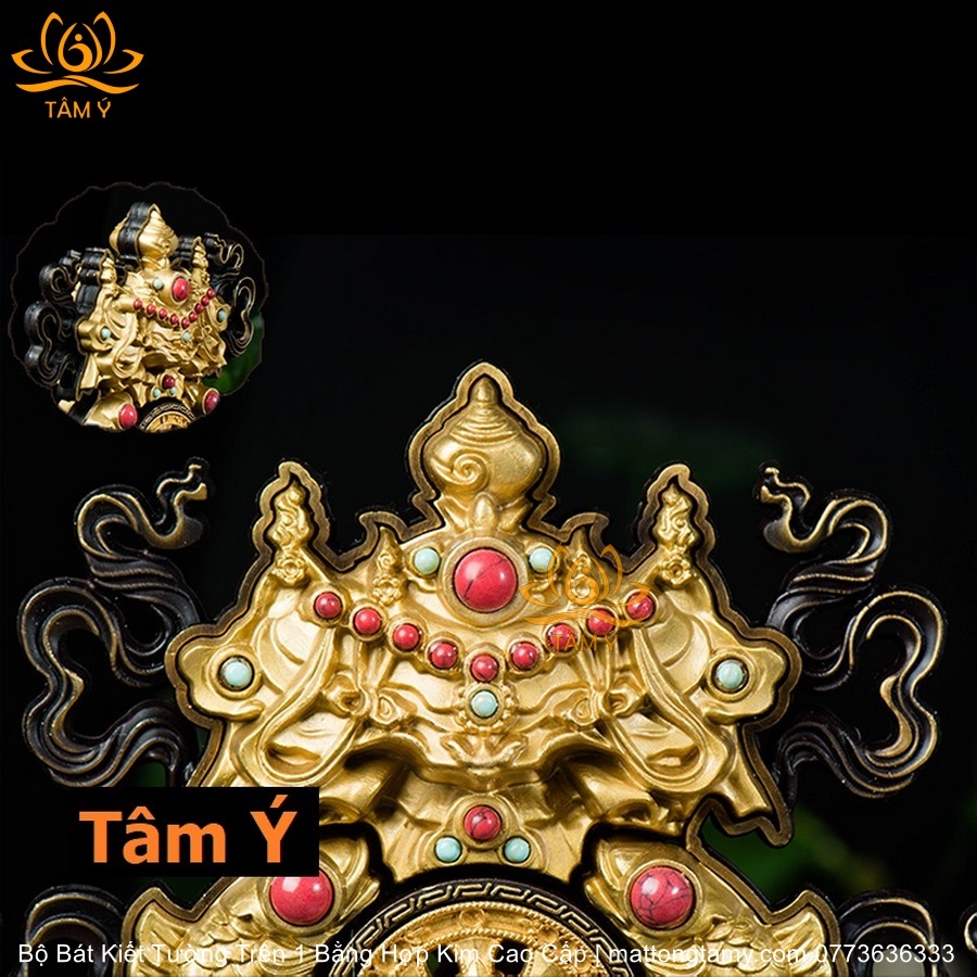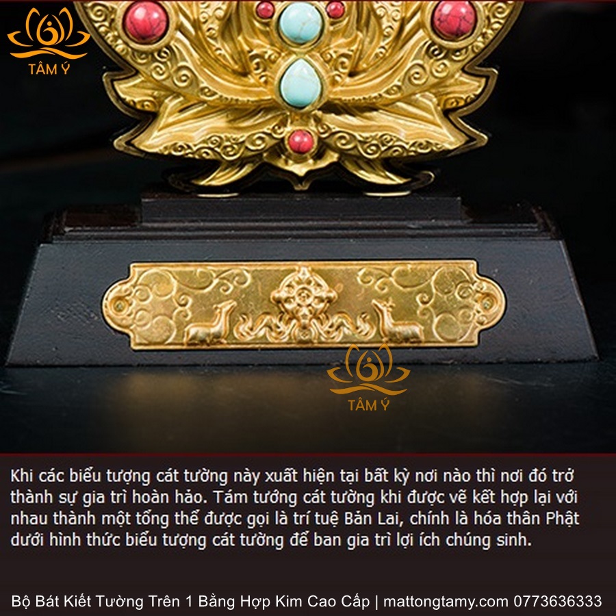 Chất liệu: Hợp Kim Cao Cấp. Kích thước: Lớn: 27cm*20cm. Đặc Điểm: 8 biểu tượng Bát Kiết Tường Trên 1 Sản phẩm. Khối lượng: Lớn: 1000gram. Quy trình sản xuất: Hoàn thiện thủ công.
