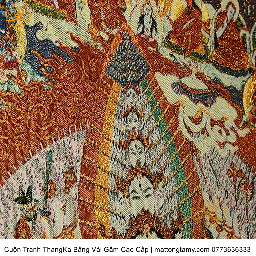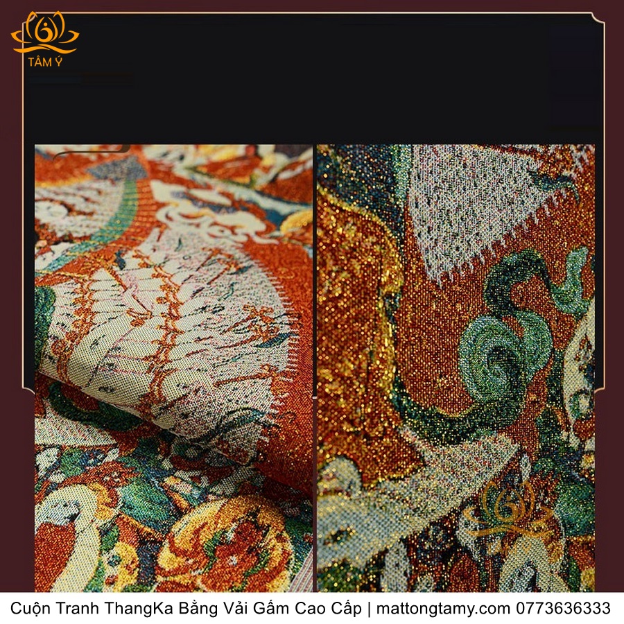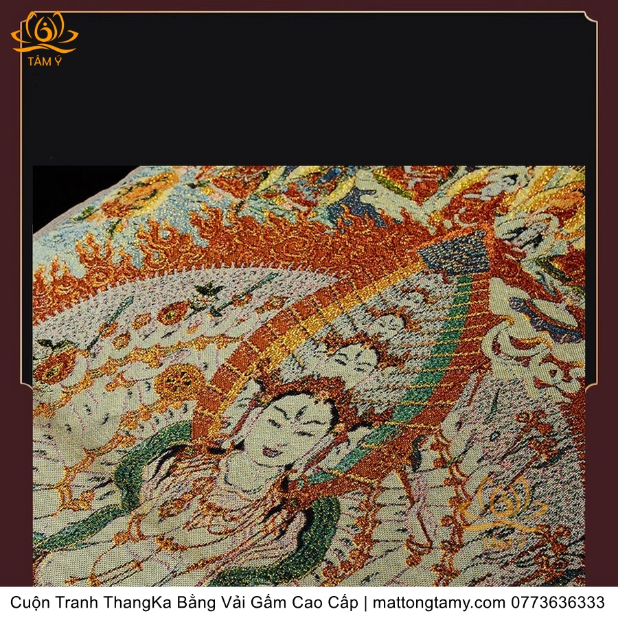 Chất liệu: Vải gấm cao cấp. Thêu dệt hình tướng: Quan Âm Thiên Thủ Thiên Nhãn. Kích thước: dài: 130cm, rộng phía trên: 70cm, rộng phía dưới: 88.5cm. Tranh thêu xong sẽ được may lên khung bằng vải gấm, 2 đầu tranh là thanh gỗ quý.