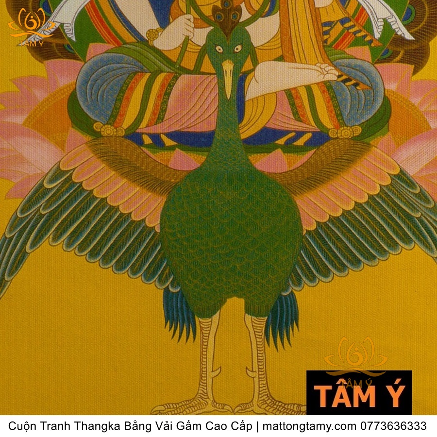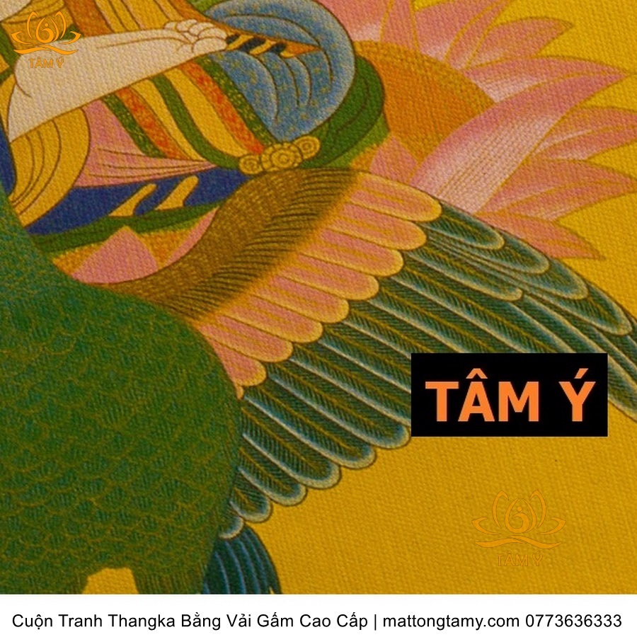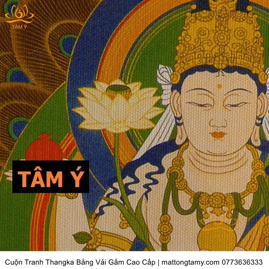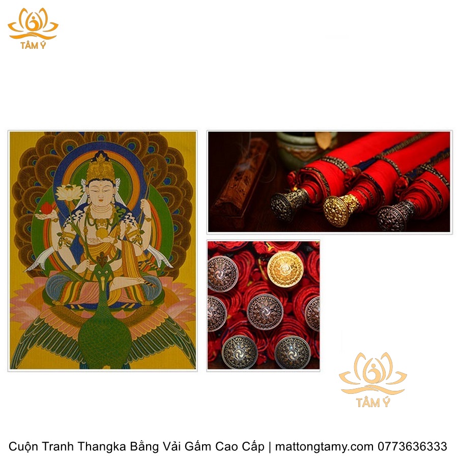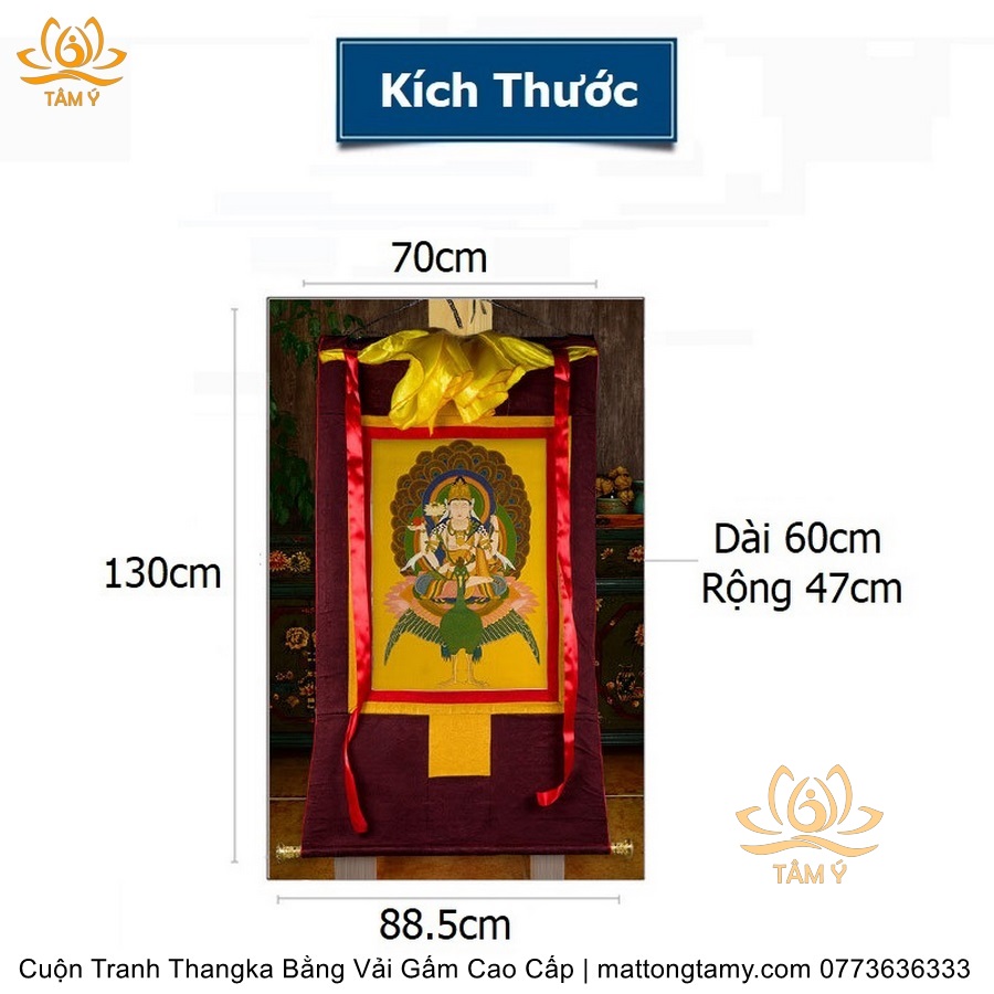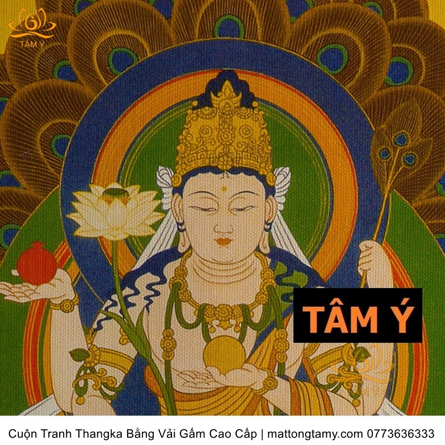Chất liệu: Vải gấm cao cấp. In: Quan Âm Tứ Thủ. Kích thước: dài: 130cm, rộng phía trên: 70cm, rộng phía dưới: 88.5cm. Tranh vẽ máy nhiều lớp công nghệ cao rất sắc nét, màu sắc tươi sáng, độ hoàn mỹ xuất sắc. Tranh vẽ máy trên lụa, rồi may lên khung bằng vải gấm, 2 đầu tranh là thanh gỗ quý.