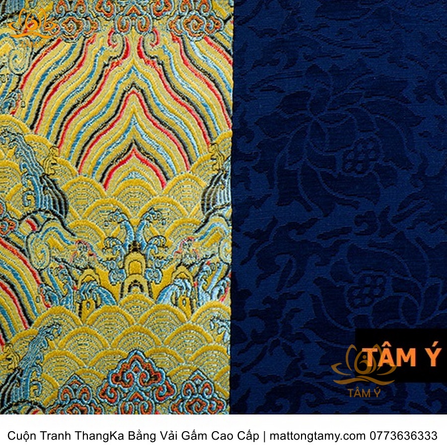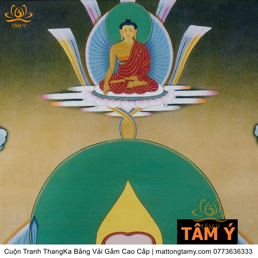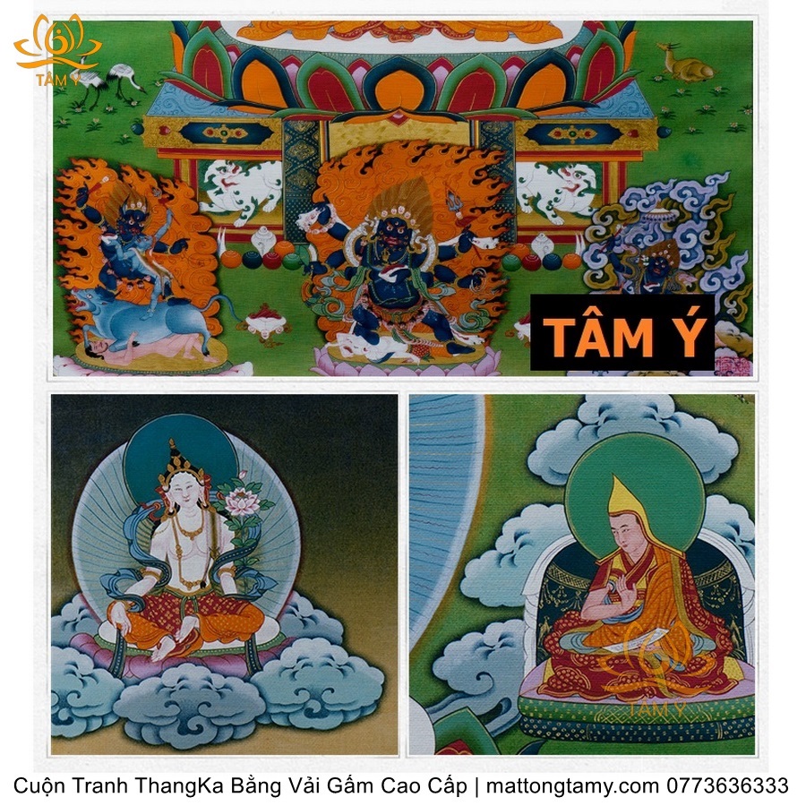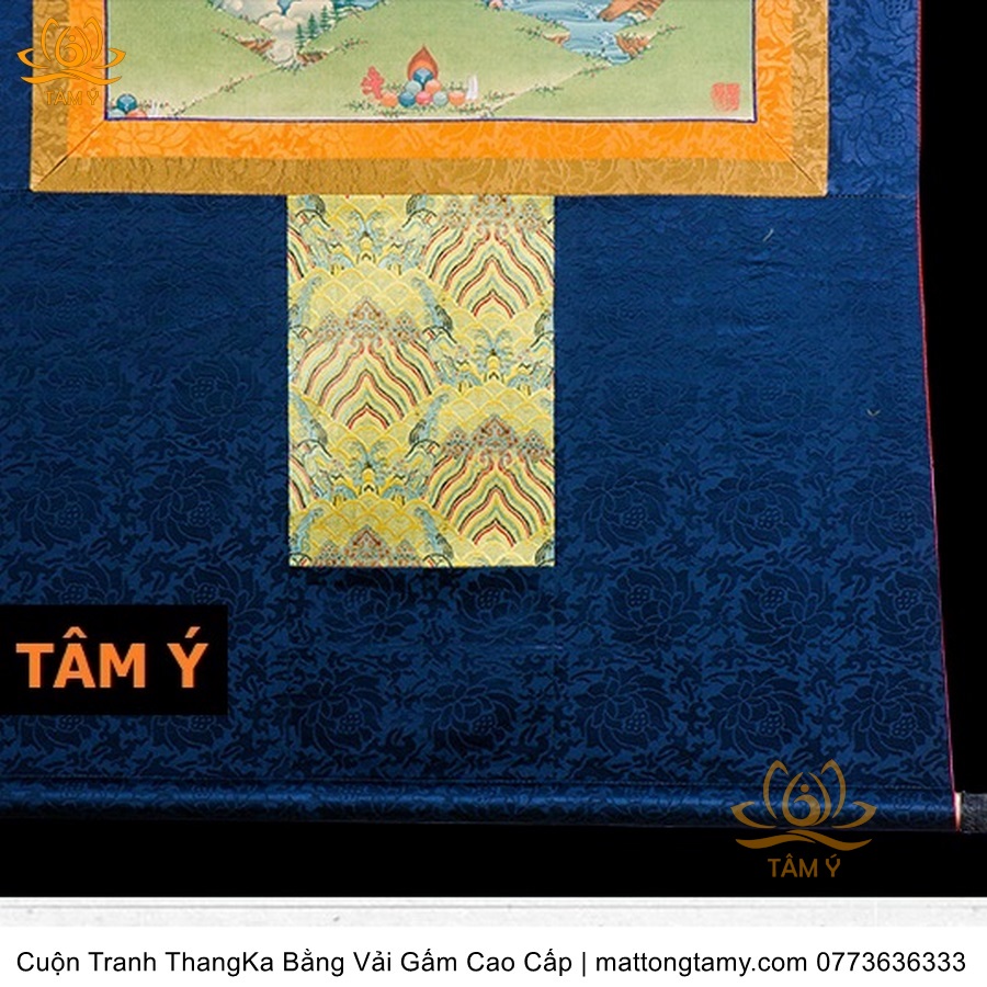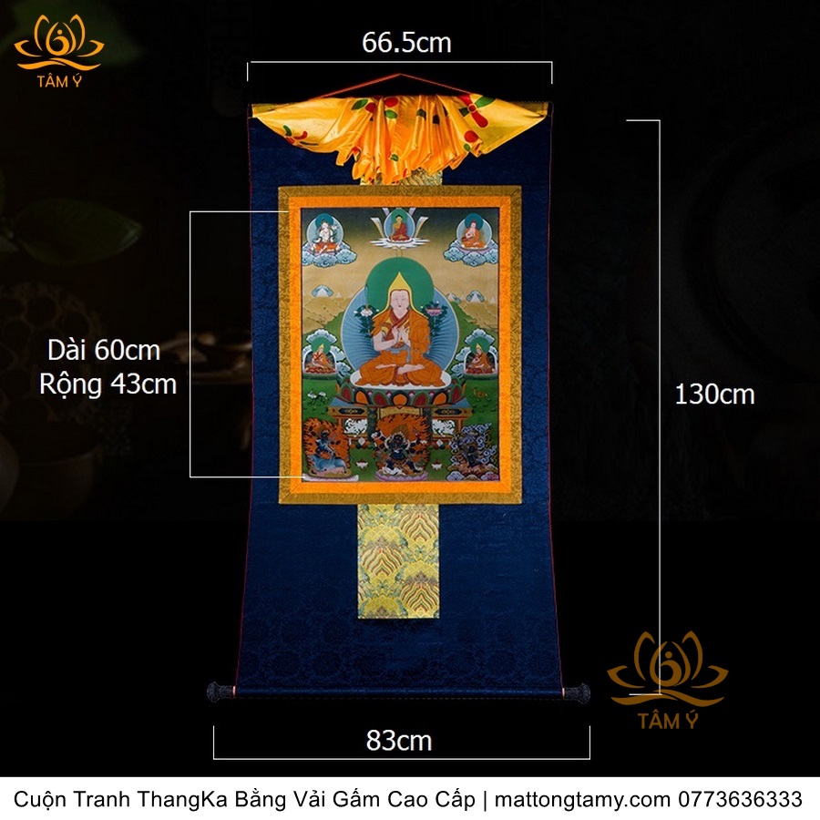Chất liệu: Vải gấm cao cấp. In: Ngài Tổ Longchenpa. Kích thước: dài: 200cm, rộng phía trên: 120cm, rộng phía dưới: 140cm. Tranh vẽ máy nhiều lớp công nghệ cao rất sắc nét, màu sắc tươi sáng, độ hoàn mỹ xuất sắc. Tranh vẽ máy trên lụa, rồi may lên khung bằng vải gấm, 2 đầu tranh là thanh gỗ quý.