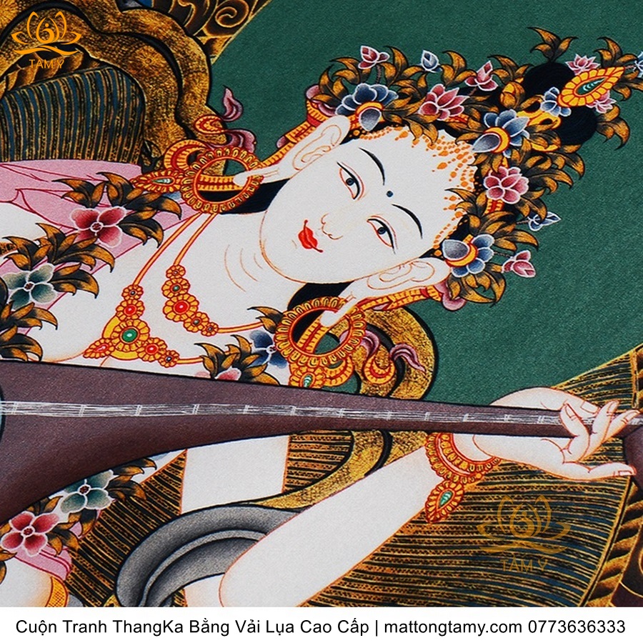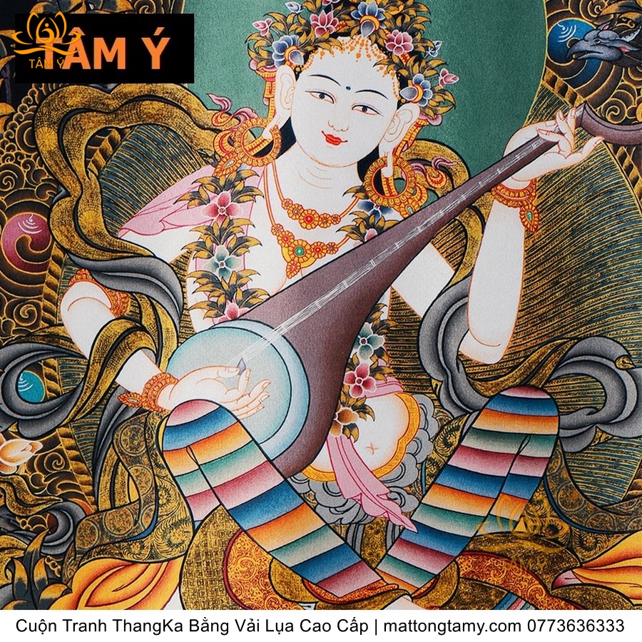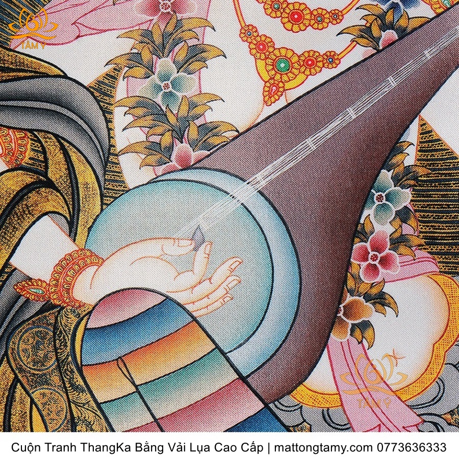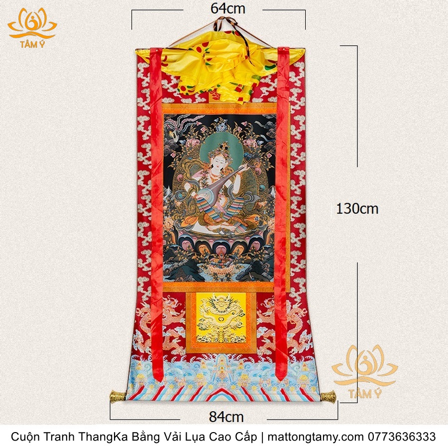 Chất liệu: Vải gấm cao cấp. In: Nữ Thần Âm Thanh. Tranh vẽ máy nhiều lớp công nghệ cao rất sắc nét, màu sắc tươi sáng, độ hoàn mỹ xuất sắc. Kích thước: dài: 130cm, rộng phía trên: 64cm, rộng phía dưới: 84cm. Tranh vẽ máy trên lụa, rồi in(may) lên khung bằng vải gấm, 2 đầu tranh là thanh gỗ quý.