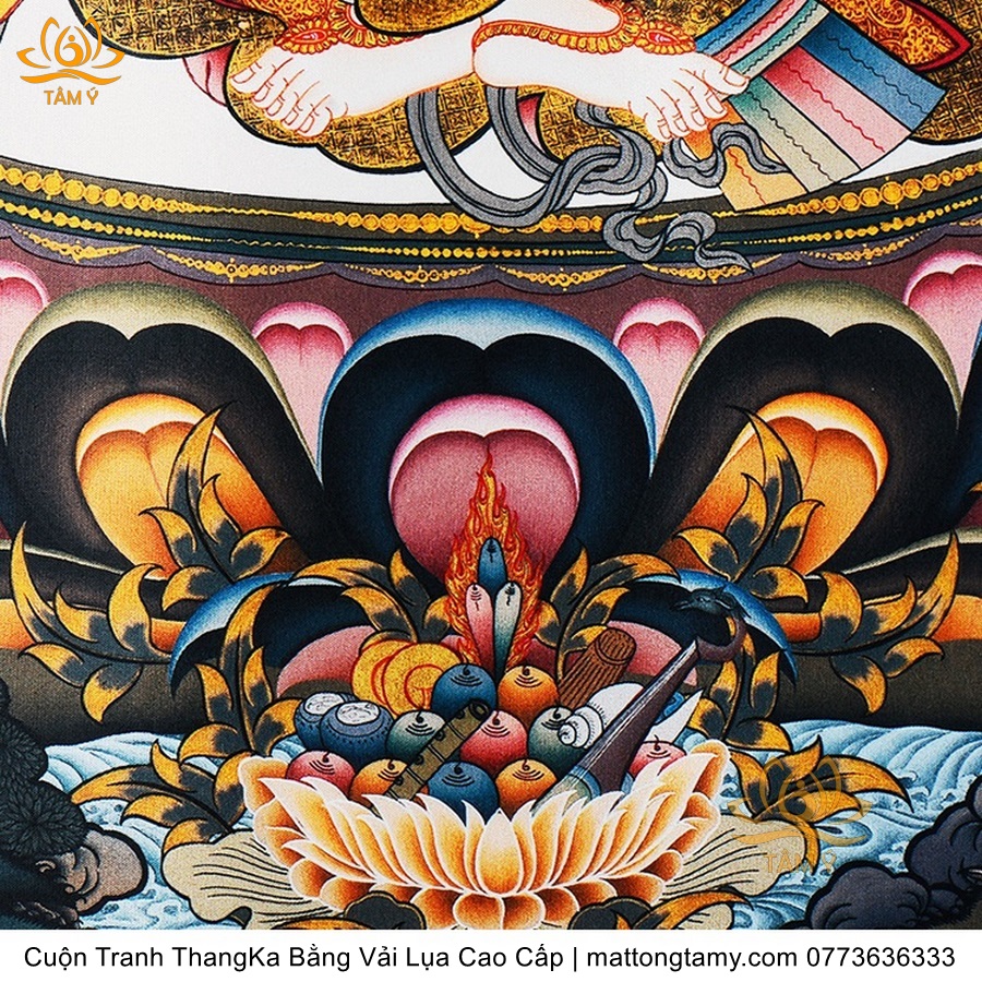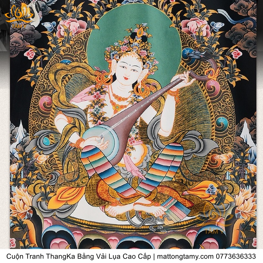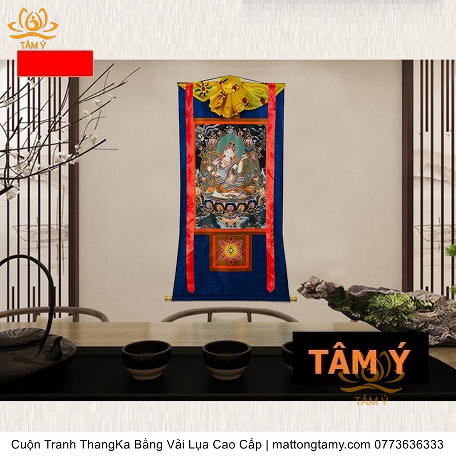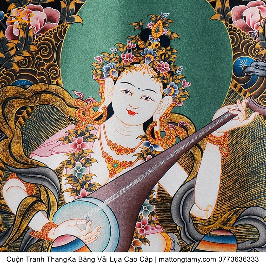 Chất liệu: Vải gấm cao cấp. In: Nữ Thần Âm Thanh. Tranh vẽ máy nhiều lớp công nghệ cao rất sắc nét, màu sắc tươi sáng, độ hoàn mỹ xuất sắc. Kích thước: dài: 130cm, rộng phía trên: 64cm, rộng phía dưới: 84cm. Tranh vẽ máy trên lụa, rồi in(may) lên khung bằng vải gấm, 2 đầu tranh là thanh gỗ quý.