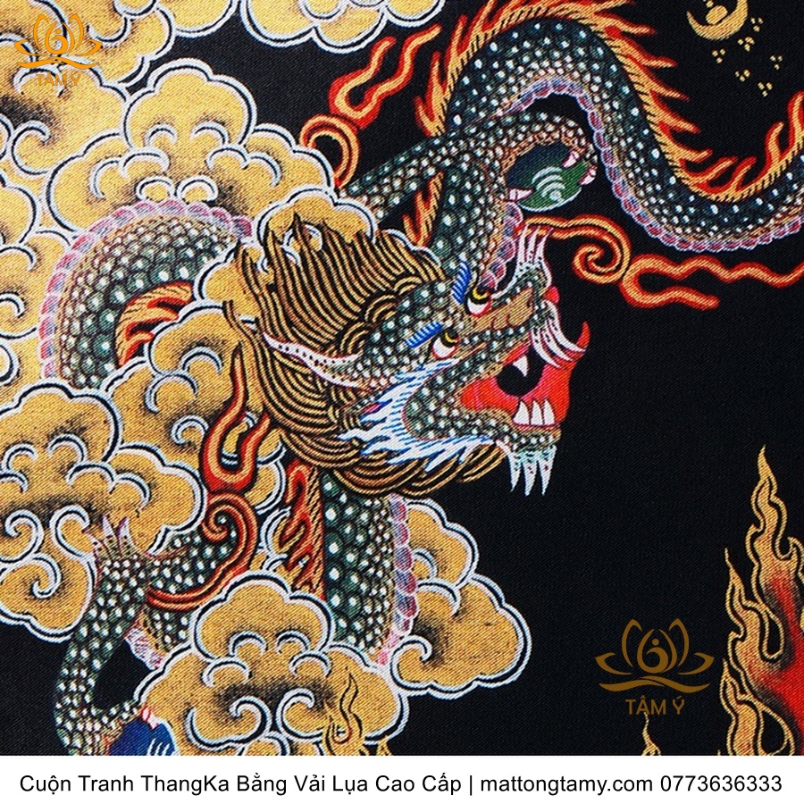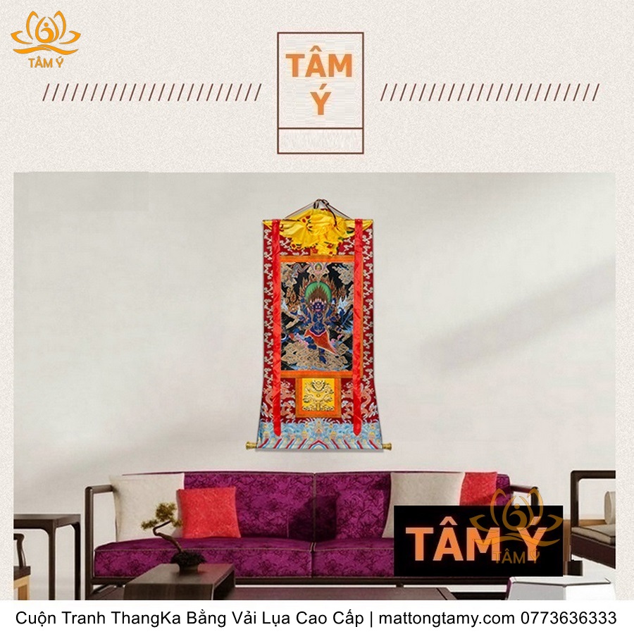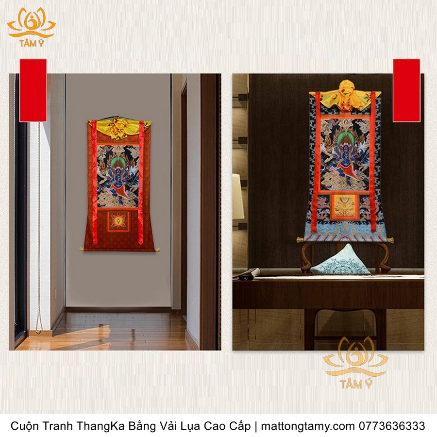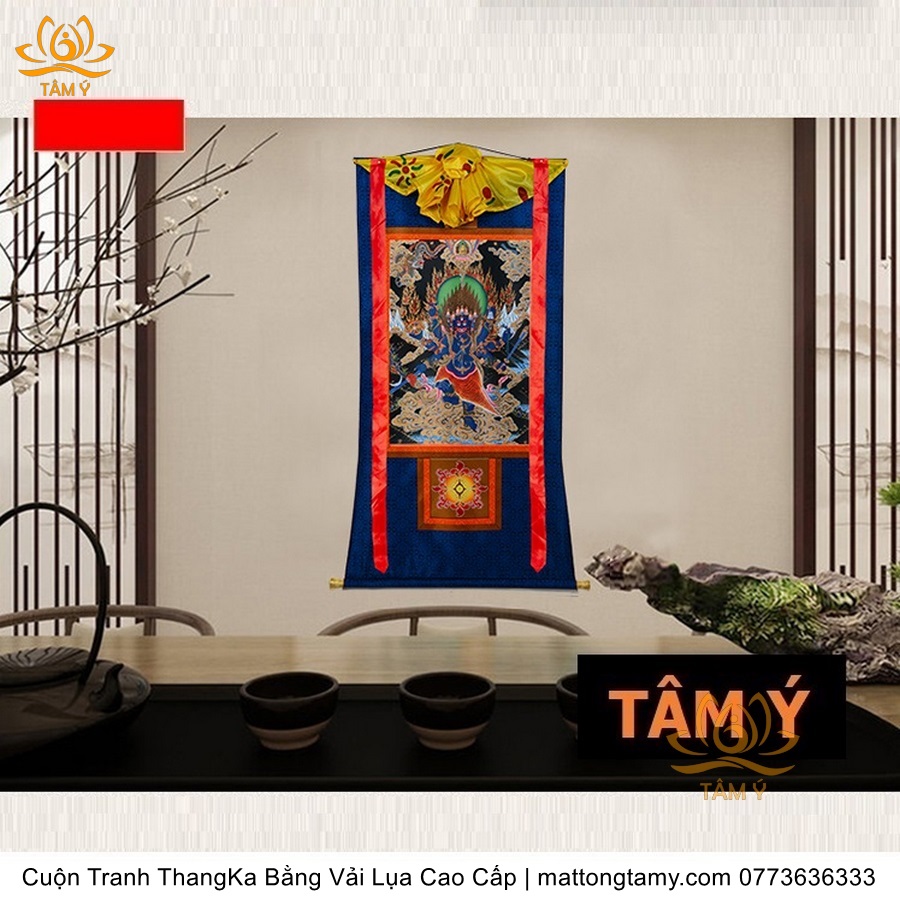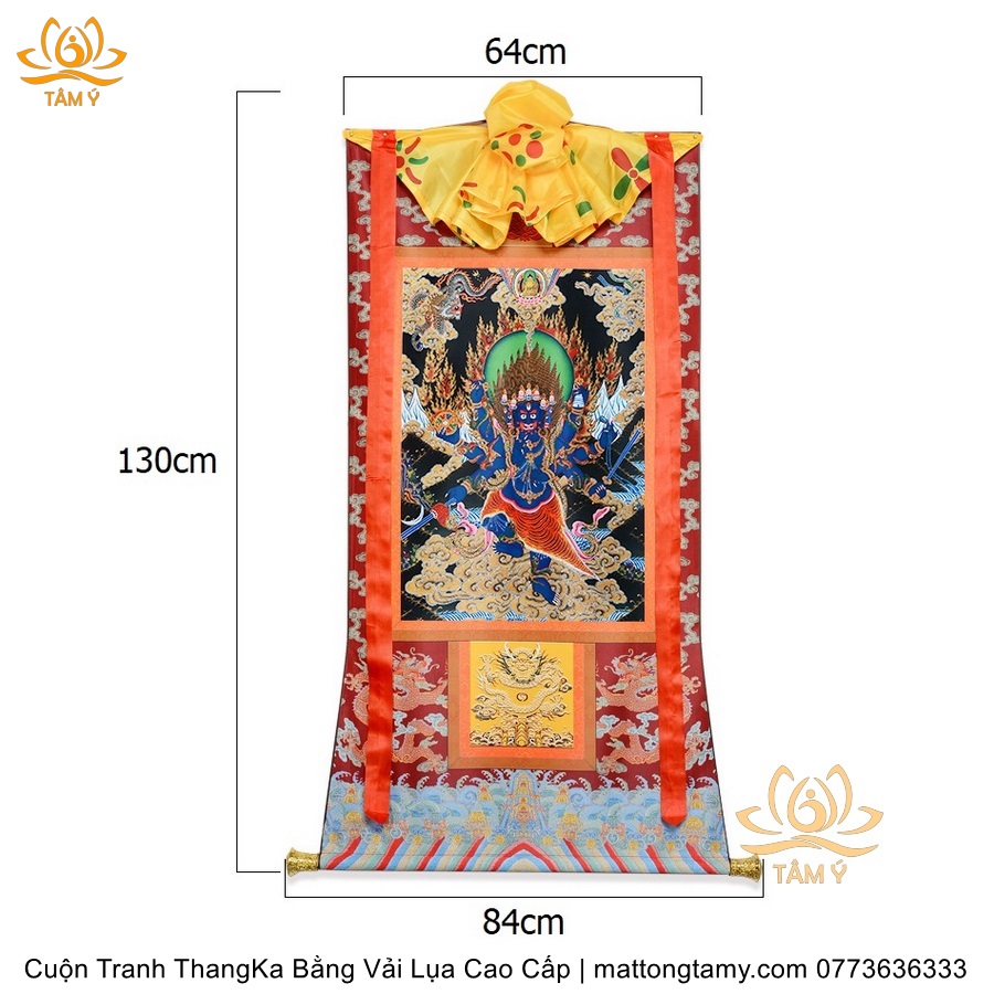 Chất liệu: Vải gấm cao cấp. Thêu: Ngài Yamataka Đại Uy Đức Minh Vương. Kích thước: dài: 130cm, rộng phía trên: 64cm, rộng phía dưới: 84cm. Tranh vẽ máy nhiều lớp công nghệ cao rất sắc nét, màu sắc tươi sáng, độ hoàn mỹ xuất sắc. Tranh vẽ máy trên lụa, rồi may lên khung bằng vải gấm, 2 đầu tranh là thanh gỗ quý.