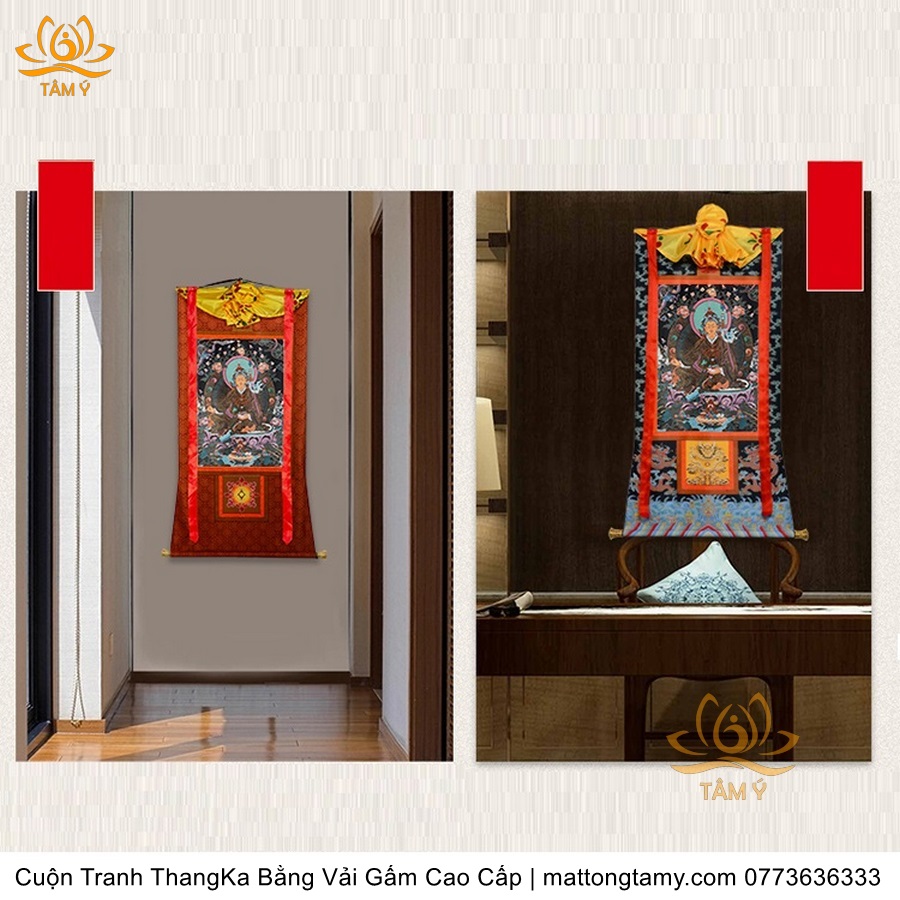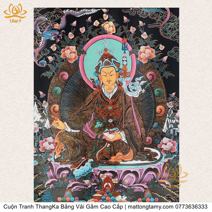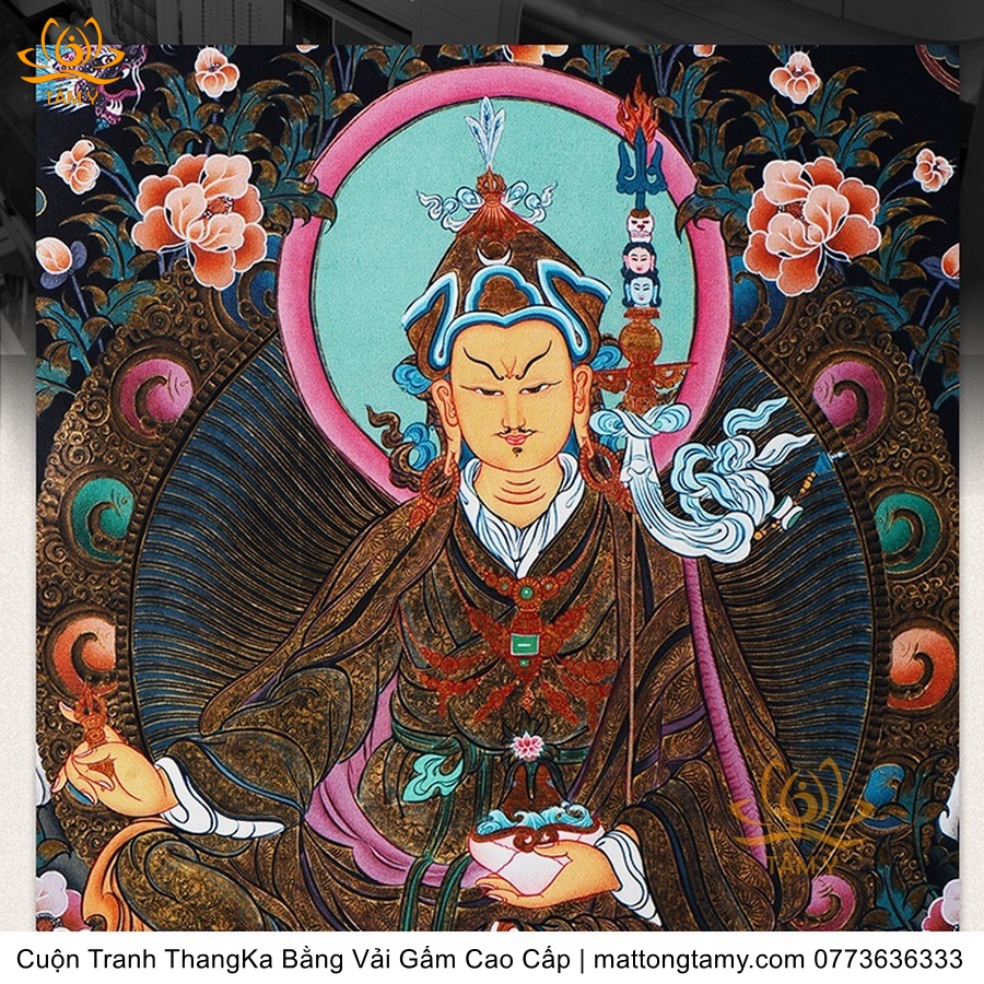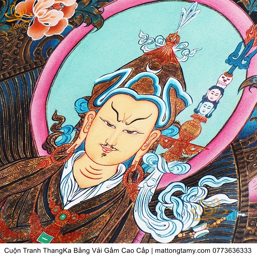 Chất liệu: Vải gấm cao cấp. In: Liên Hoa Sinh. Kích thước: dài: 200cm, rộng phía trên: 120cm, rộng phía dưới: 140cm. Tranh vẽ máy nhiều lớp công nghệ cao rất sắc nét, màu sắc tươi sáng, độ hoàn mỹ xuất sắc. Tranh vẽ máy trên lụa, rồi may lên khung bằng vải gấm, 2 đầu tranh là thanh gỗ quý.