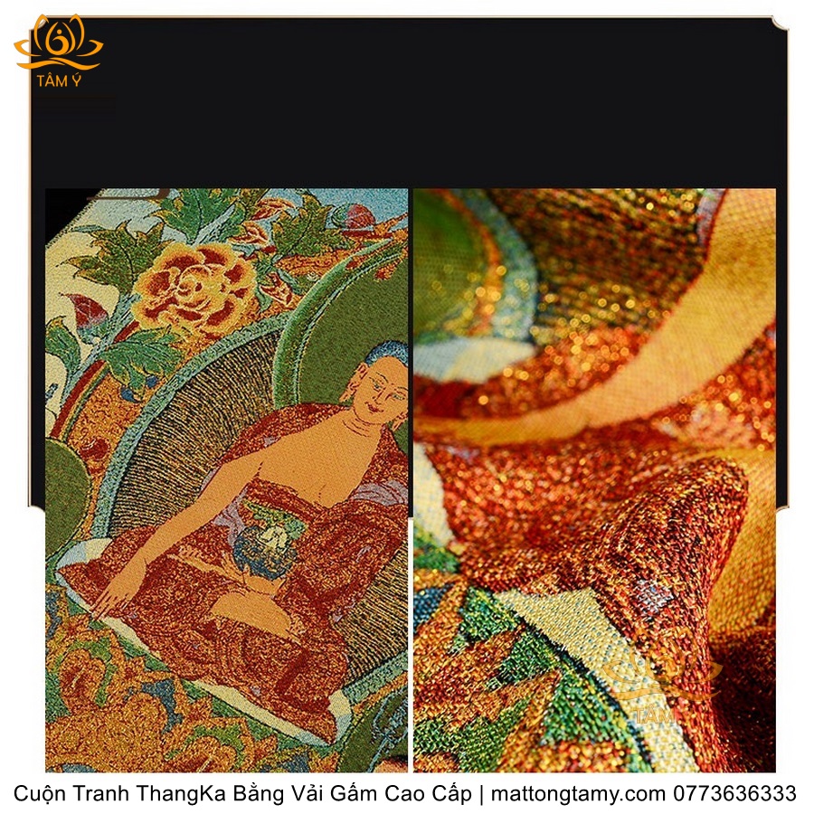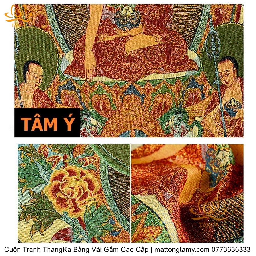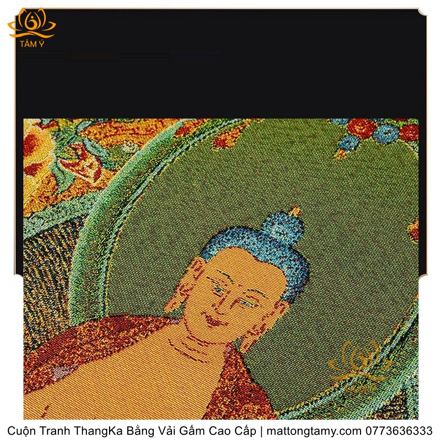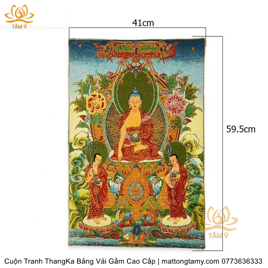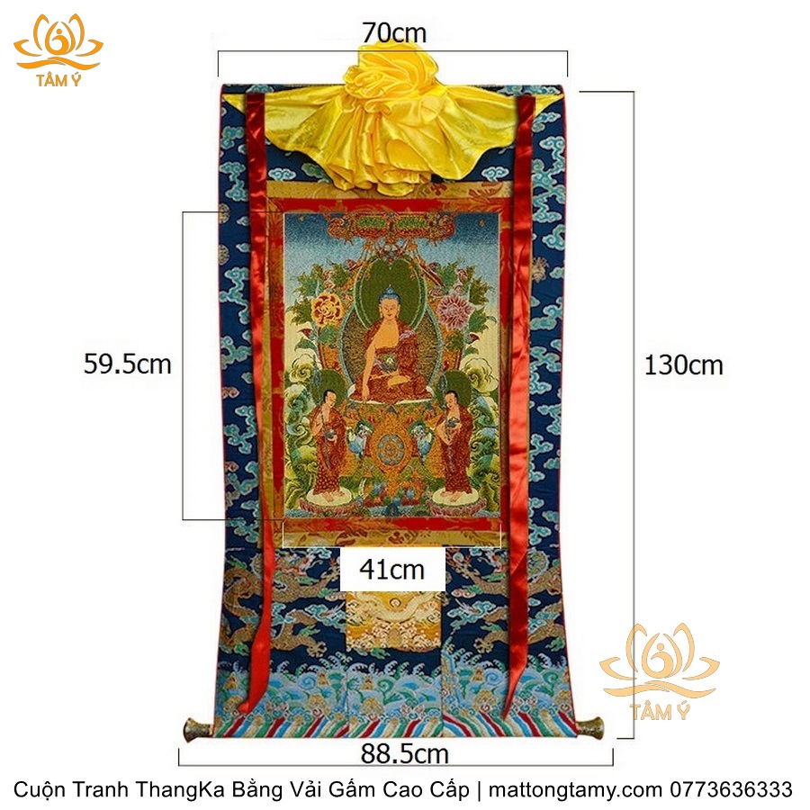 Chất liệu: Vải gấm cao cấp. Thêu dệt hình tướng: Thích Ca Mâu Ni. Kích thước: dài: 130cm, rộng phía trên: 70cm, rộng phía dưới: 88.5cm. Tranh thêu xong sẽ được may lên khung bằng vải gấm, 2 đầu tranh là thanh gỗ quý.