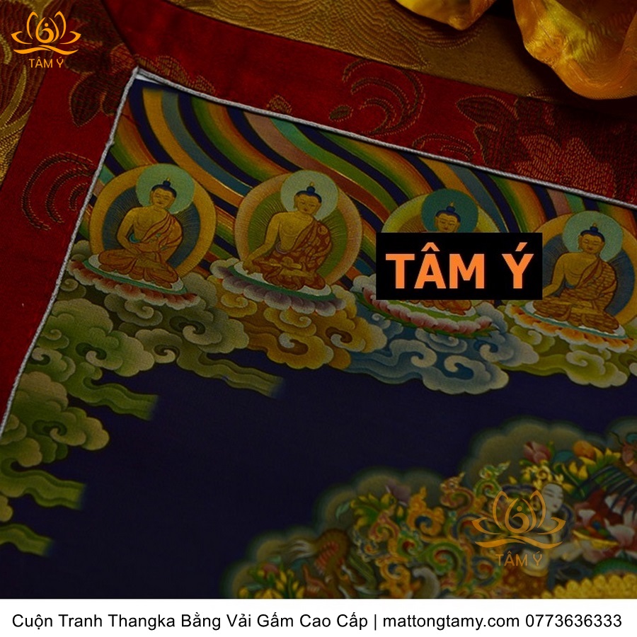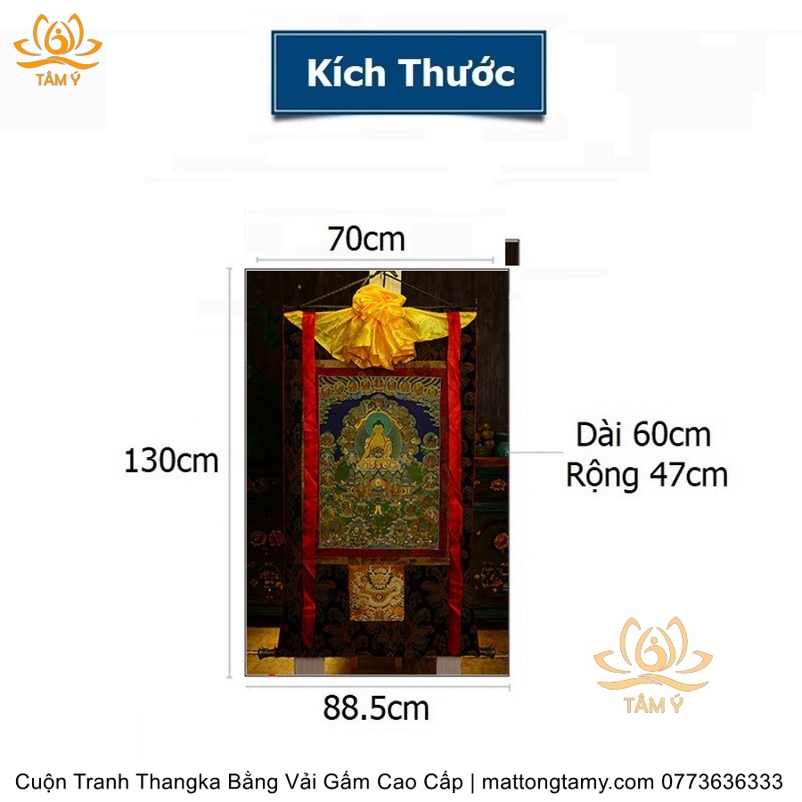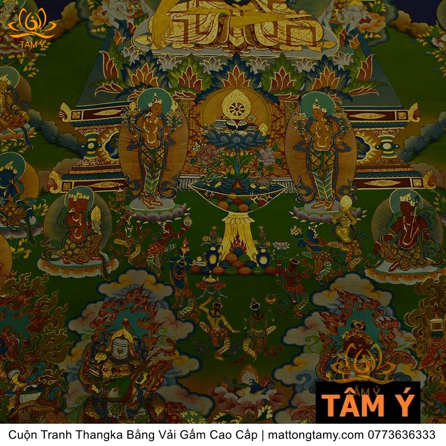 Chất liệu: Vải gấm cao cấp. In: Thích Ca Và Tám Vị Bồ Tát Mật Tông. Tranh vẽ máy nhiều lớp công nghệ cao rất sắc nét, màu sắc tươi sáng, độ hoàn mỹ xuất sắc. Kích thước: dài: 130cm, rộng phía trên: 70cm, rộng phía dưới: 88.5cm. Tranh vẽ máy nhiều lớp công nghệ cao rất sắc nét, màu sắc tươi sáng, độ hoàn mỹ xuất sắc. Tranh vẽ máy trên lụa, rồi may lên khung bằng vải gấm, 2 đầu tranh là thanh gỗ quý.