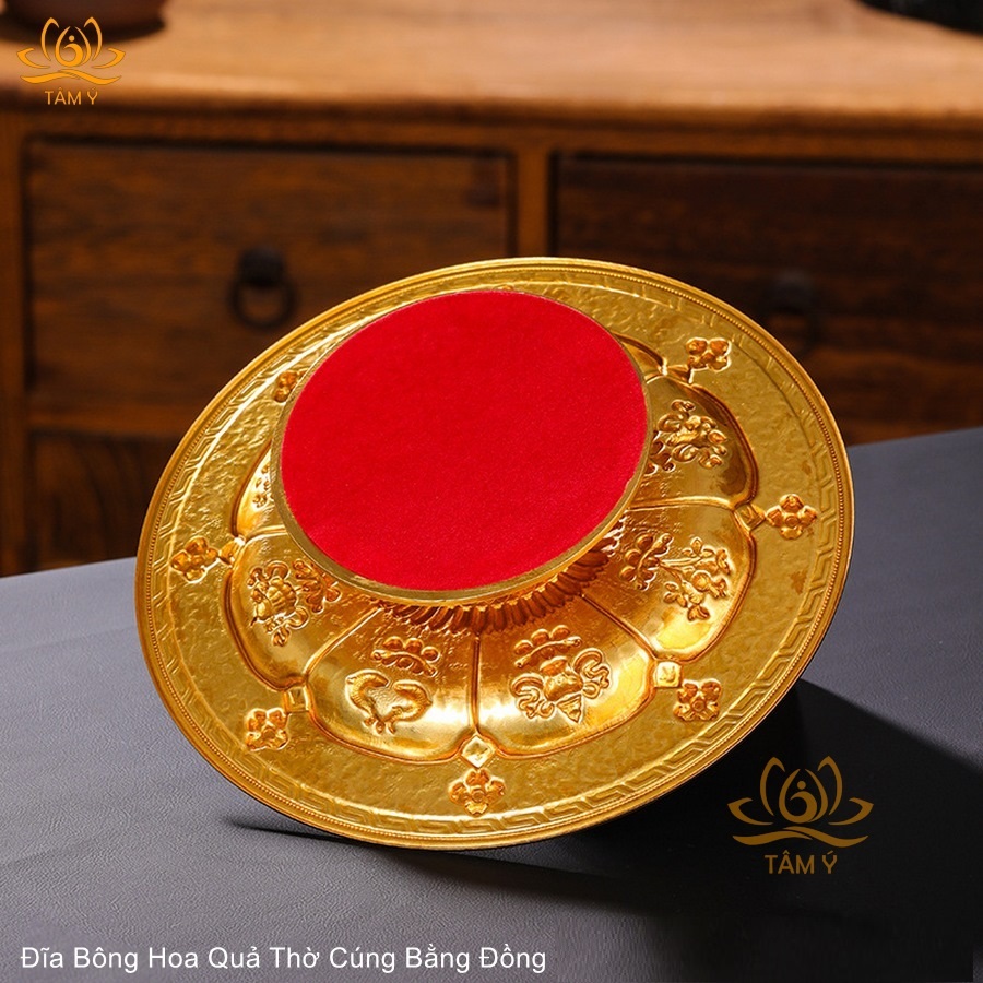 Đĩa bồng tinh xảo tỉ mỉ chạm khắc bát kiết tường bằng đồng rất đẹp, vật dụng ban thờ Phật, pháp bảo mật tông, Tâm Ý