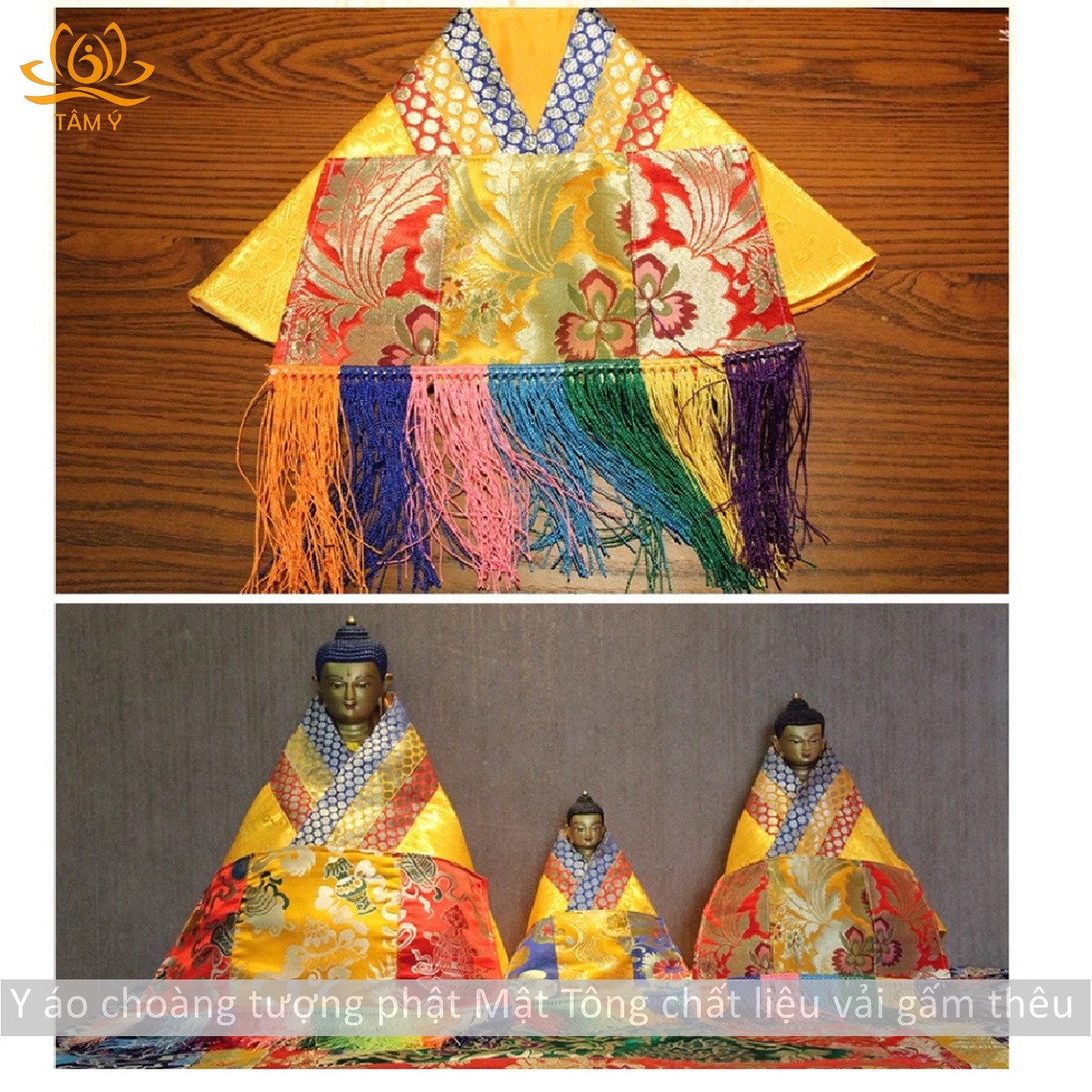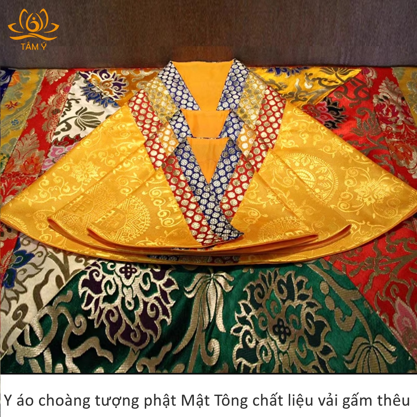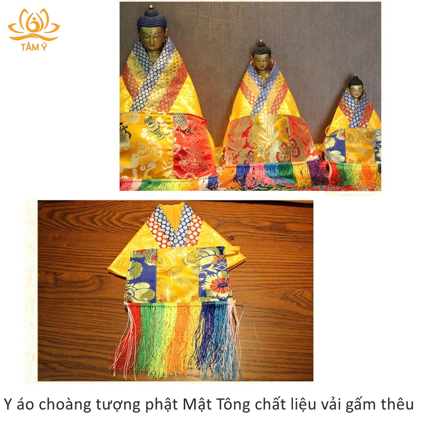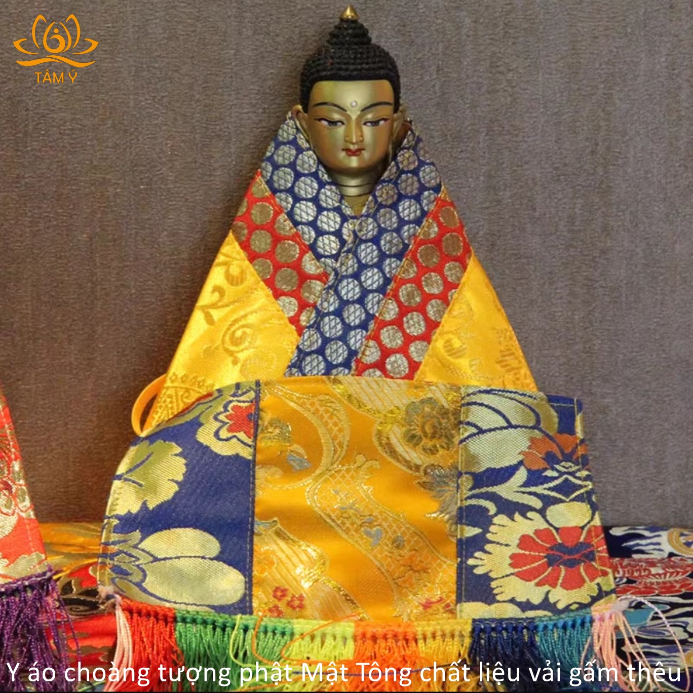 Y áo choàng tượng Phật được thiết kế với mục đích làm tăng sự trang nghiêm cho tượng Phật, thể hiện lòng tôn kính của chúng ta với các vị Phật mỗi khi chúng ta nhìn ngắm hảo tướng hay đảnh lễ các ngài, với chất liệu vải gấm dưới bàn tay công phu của những nghệ nhân Tây Tạng họ đã làm ra 1 sản phẩm vô cùng chất lượng, đẹp đến từng chi tiết.
