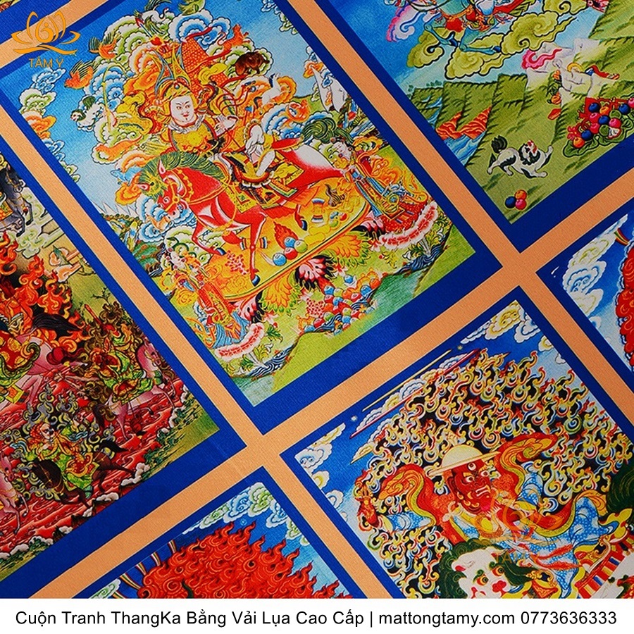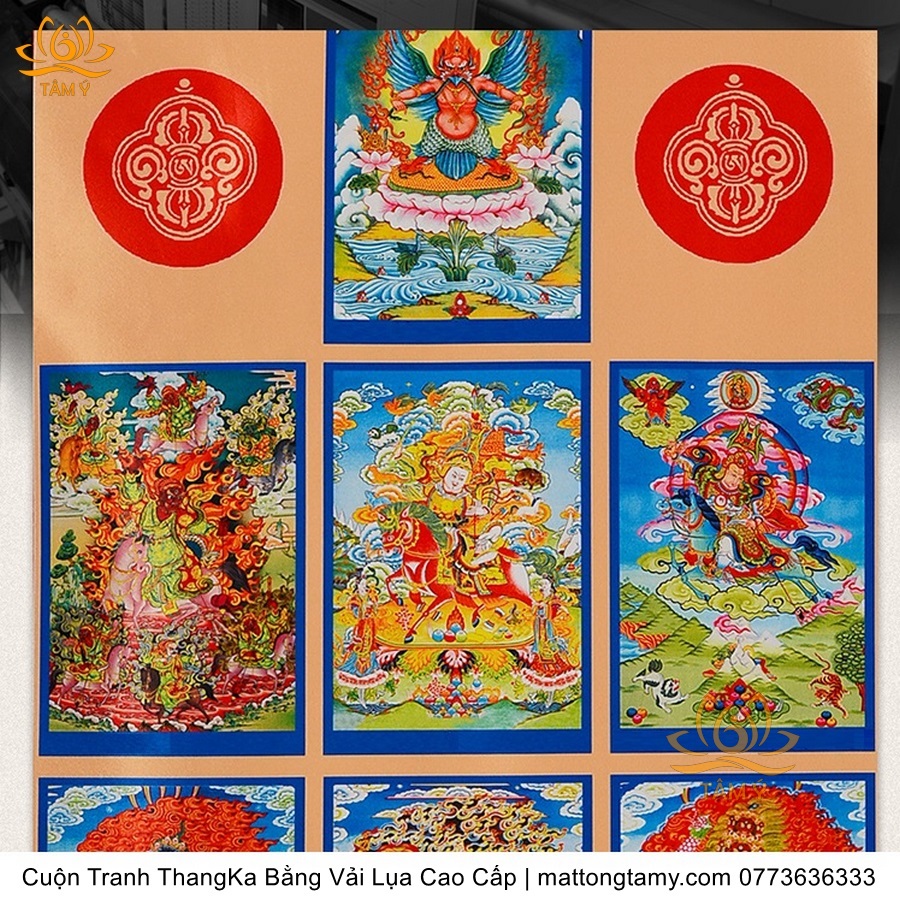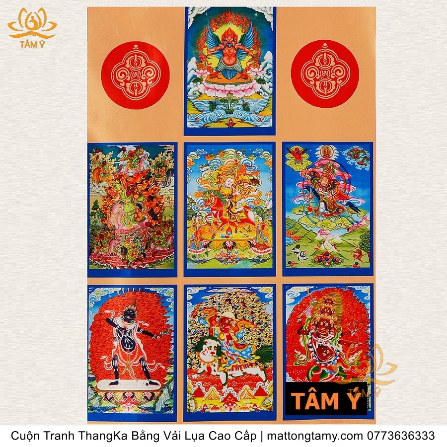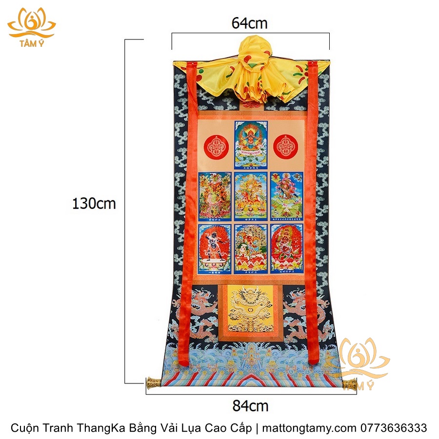 Chất liệu: Vải gấm cao cấp. In: 7 vị phật. Kích thước: dài: 130cm, rộng phía trên: 64cm, rộng phía dưới: 84cm. Tranh vẽ máy nhiều lớp công nghệ cao rất sắc nét, màu sắc tươi sáng, độ hoàn mỹ xuất sắc. Tranh vẽ máy trên lụa, rồi may lên khung bằng vải gấm, 2 đầu tranh là thanh gỗ quý.