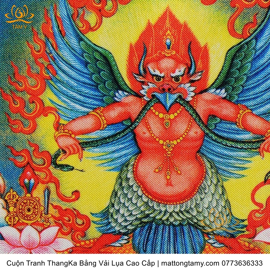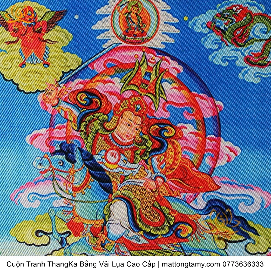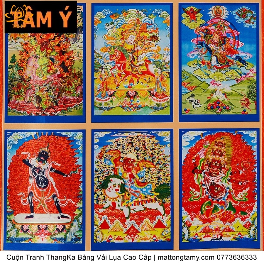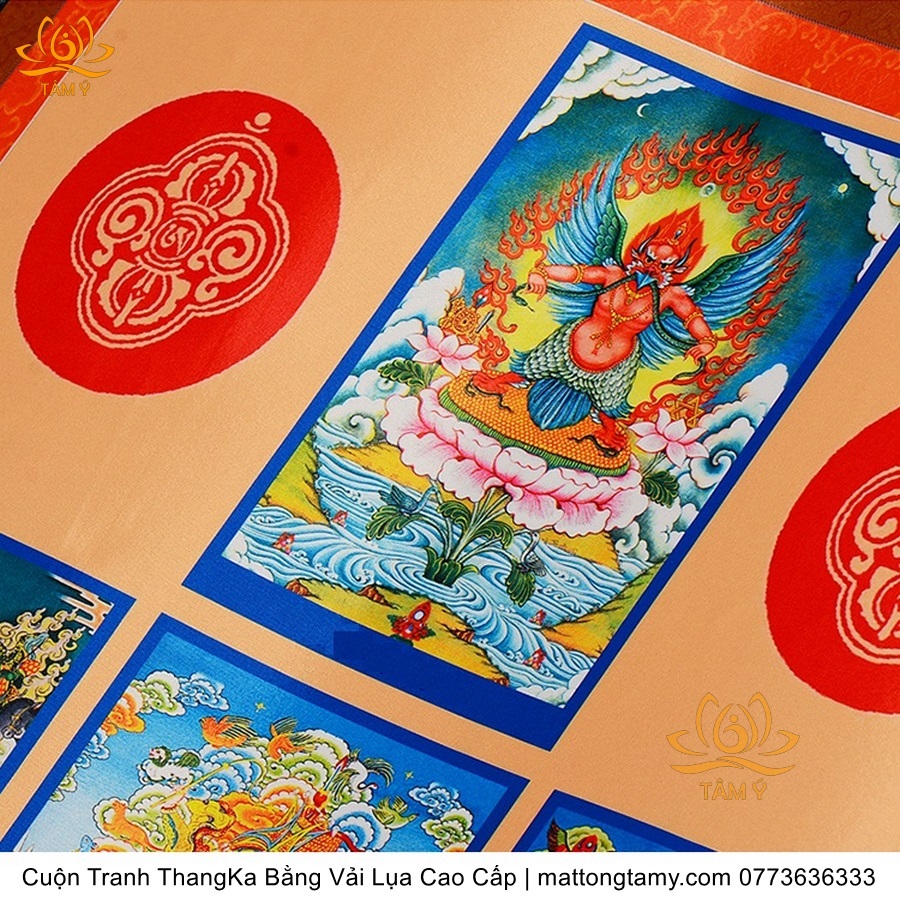 Chất liệu: Vải gấm cao cấp. In: 7 vị phật. Kích thước: dài: 130cm, rộng phía trên: 64cm, rộng phía dưới: 84cm. Tranh vẽ máy nhiều lớp công nghệ cao rất sắc nét, màu sắc tươi sáng, độ hoàn mỹ xuất sắc. Tranh vẽ máy trên lụa, rồi may lên khung bằng vải gấm, 2 đầu tranh là thanh gỗ quý.