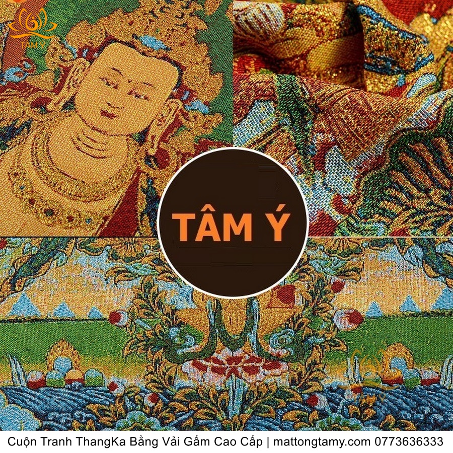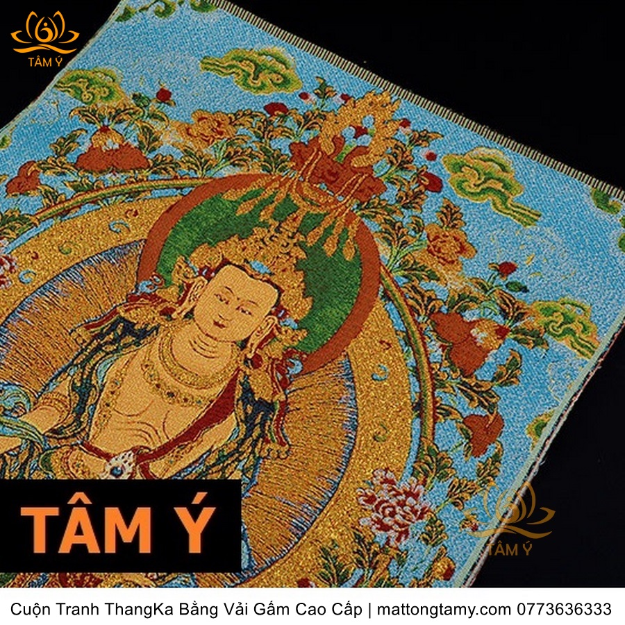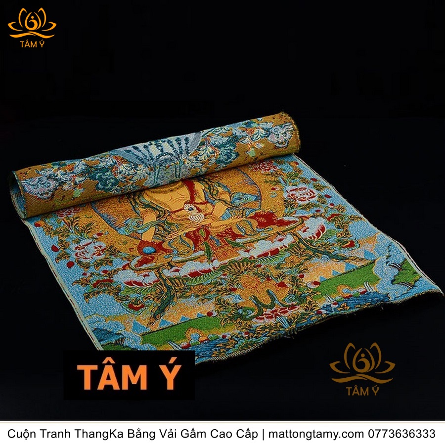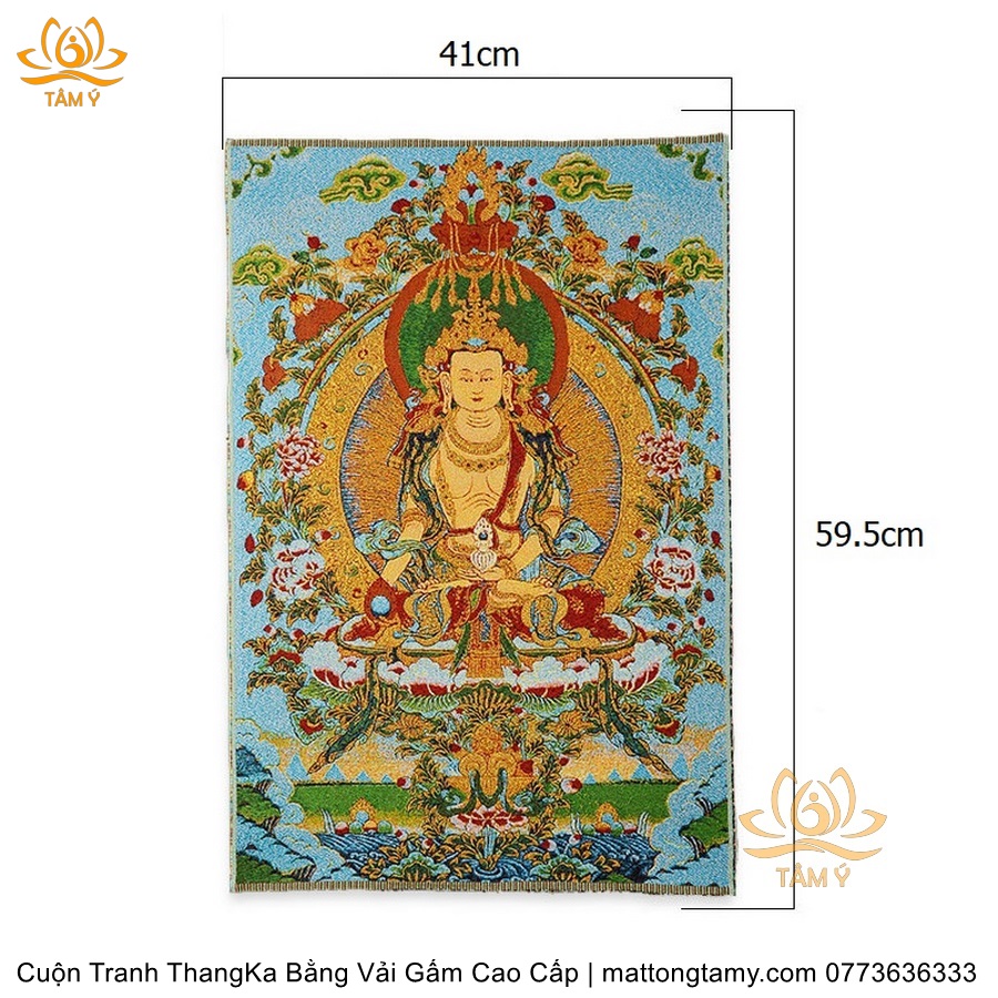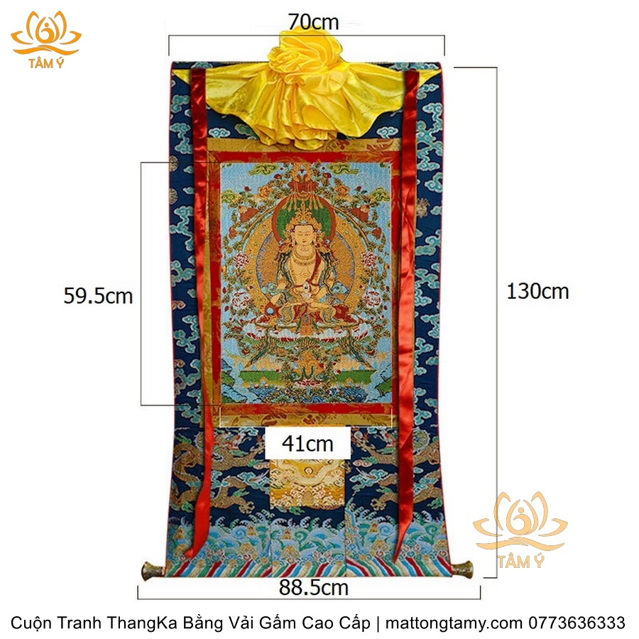 Chất liệu: Vải gấm cao cấp. Thêu dệt hình tướng: Địa Tạng Vương Bồ tát. Kích thước: dài: 130cm, rộng phía trên: 70cm, rộng phía dưới: 88.5cm. Tranh thêu xong sẽ được may lên khung bằng vải gấm, 2 đầu tranh là thanh gỗ quý.