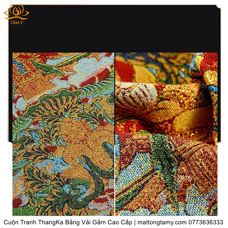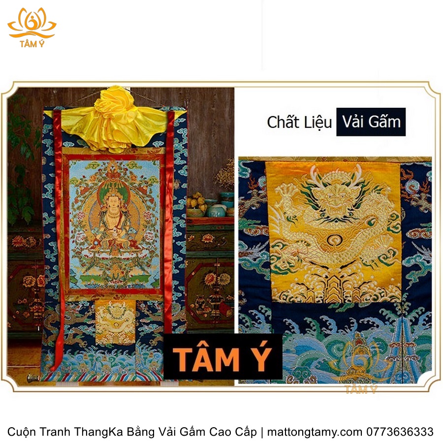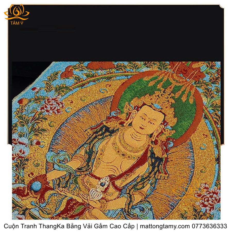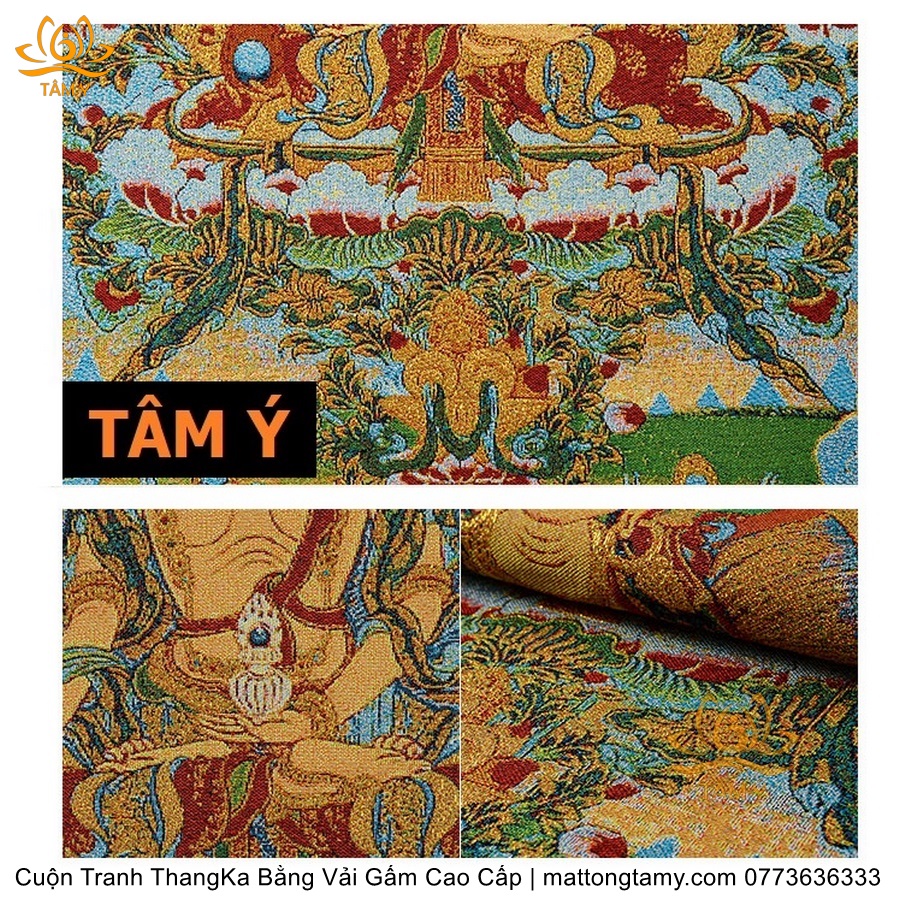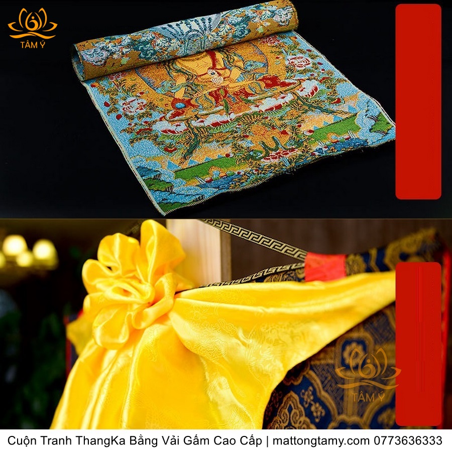 Chất liệu: Vải gấm cao cấp. Thêu dệt hình tướng: Địa Tạng Vương Bồ tát. Kích thước: dài: 130cm, rộng phía trên: 70cm, rộng phía dưới: 88.5cm. Tranh thêu xong sẽ được may lên khung bằng vải gấm, 2 đầu tranh là thanh gỗ quý.