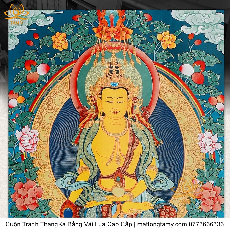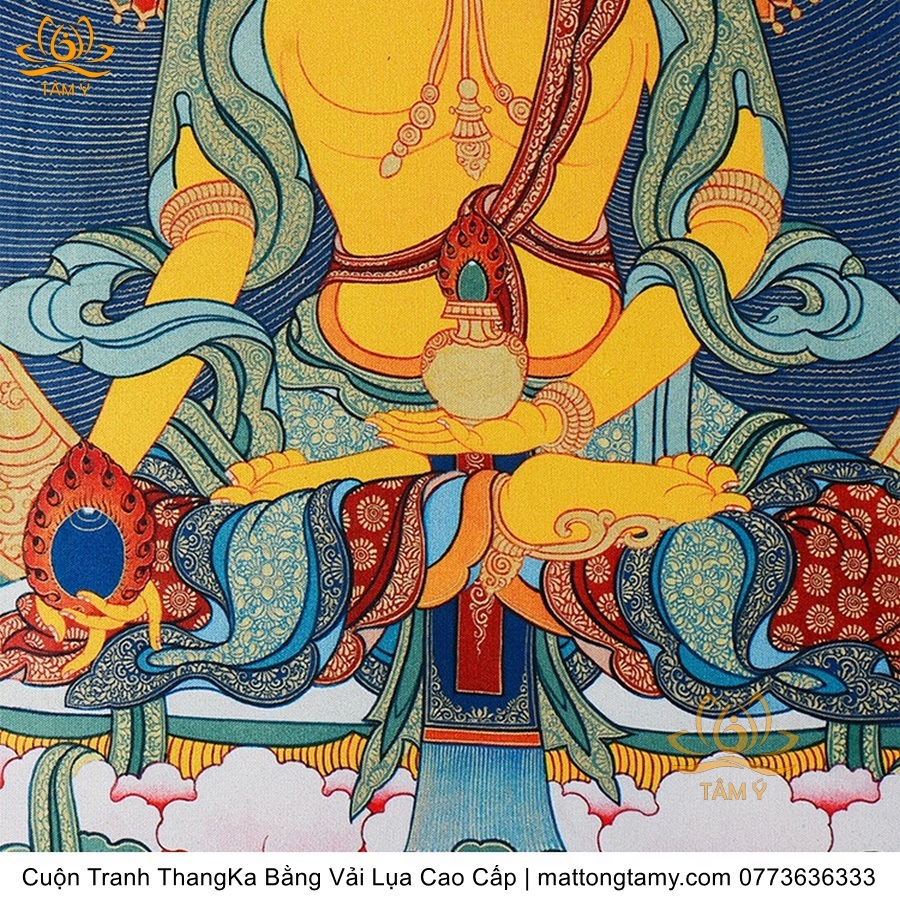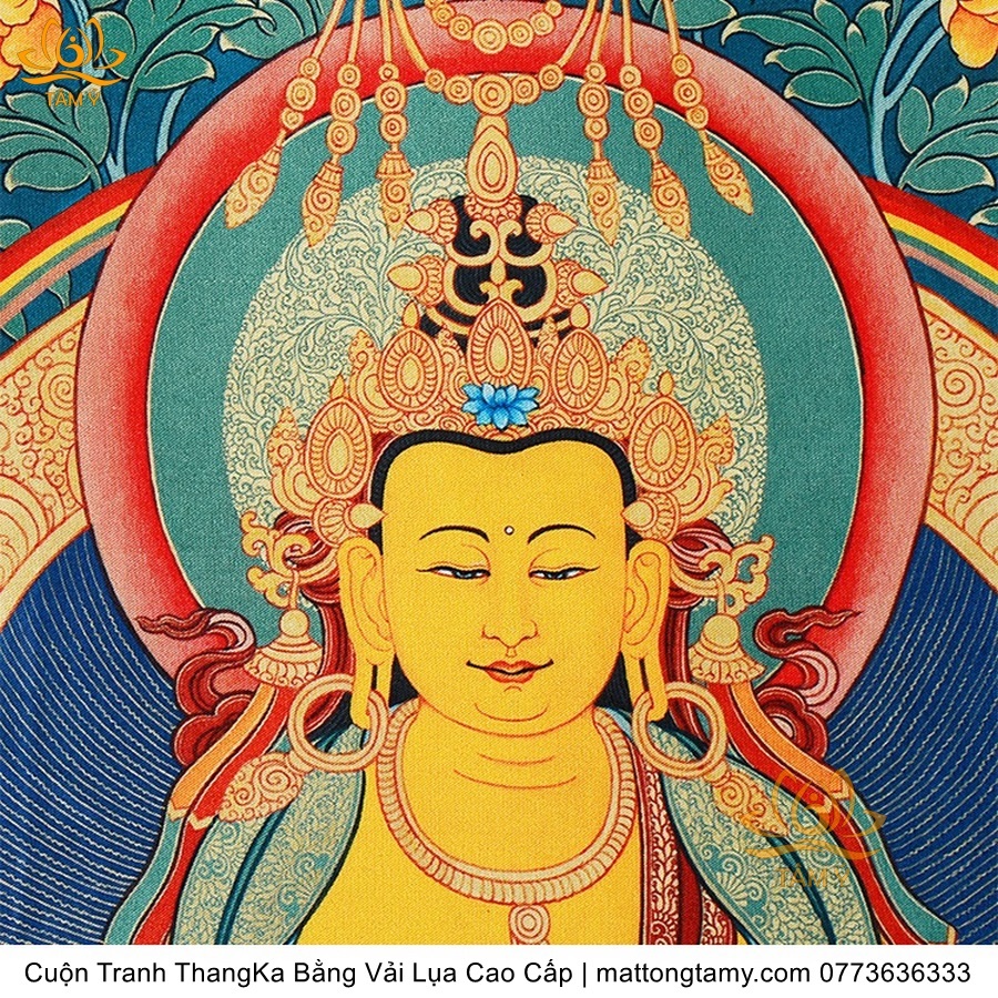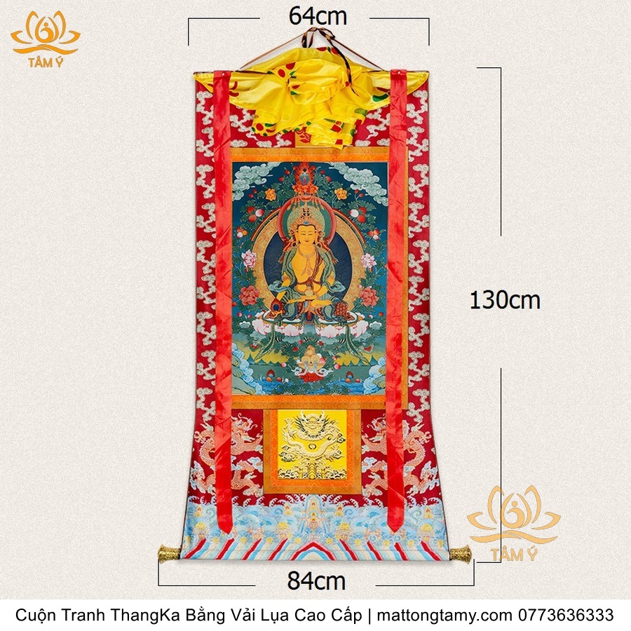 Chất liệu: Vải gấm cao cấp. In: Địa Tạng Vương Bồ tát. Kích thước: dài: 130cm, rộng phía trên: 70cm, rộng phía dưới: 88.5cm. Tranh vẽ máy nhiều lớp công nghệ cao rất sắc nét, màu sắc tươi sáng, độ hoàn mỹ xuất sắc. Tranh vẽ máy trên lụa, rồi may lên khung bằng vải gấm, 2 đầu tranh là thanh gỗ quý.