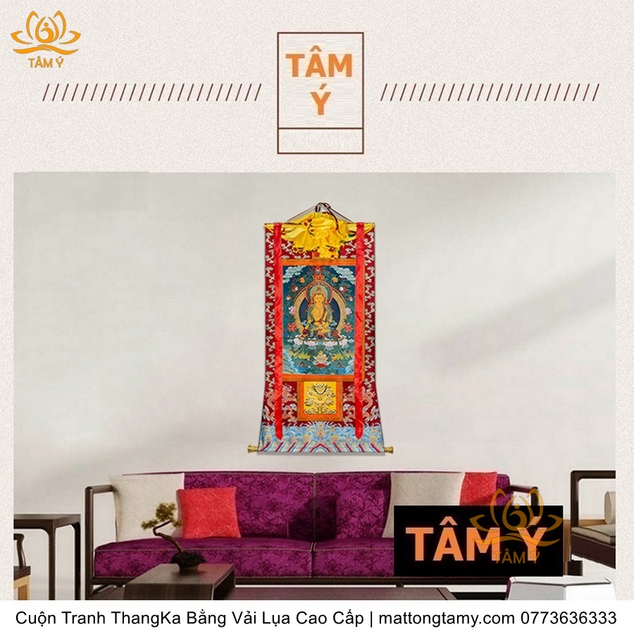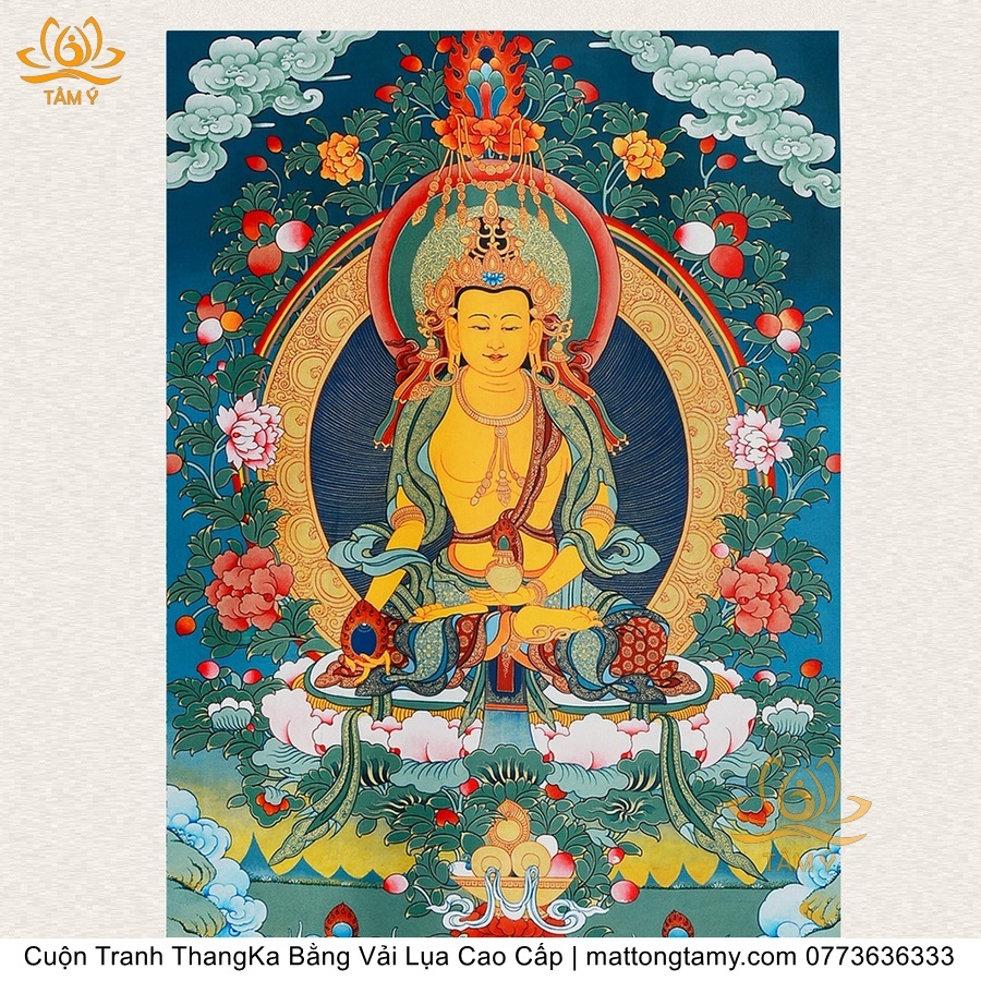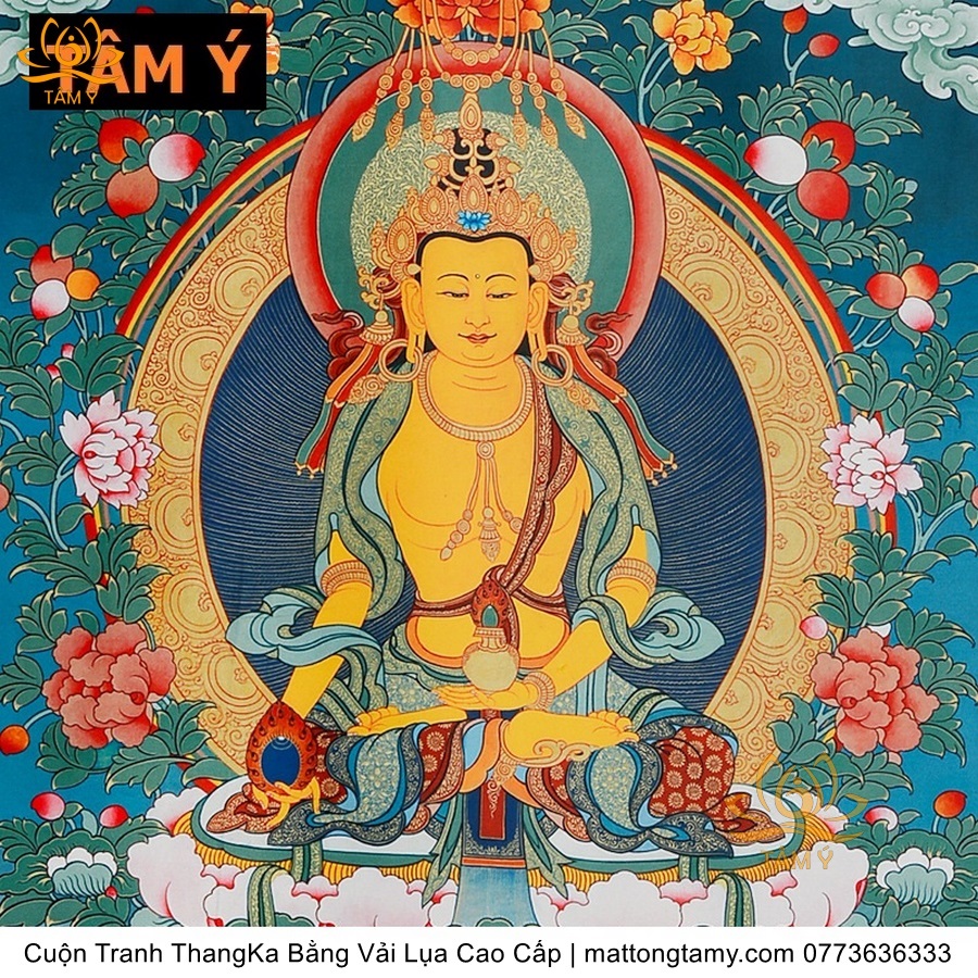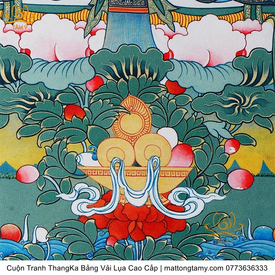 Chất liệu: Vải gấm cao cấp. In: Địa Tạng Vương Bồ tát. Kích thước: dài: 130cm, rộng phía trên: 70cm, rộng phía dưới: 88.5cm. Tranh vẽ máy nhiều lớp công nghệ cao rất sắc nét, màu sắc tươi sáng, độ hoàn mỹ xuất sắc. Tranh vẽ máy trên lụa, rồi may lên khung bằng vải gấm, 2 đầu tranh là thanh gỗ quý.