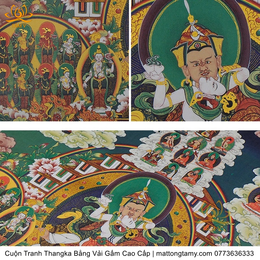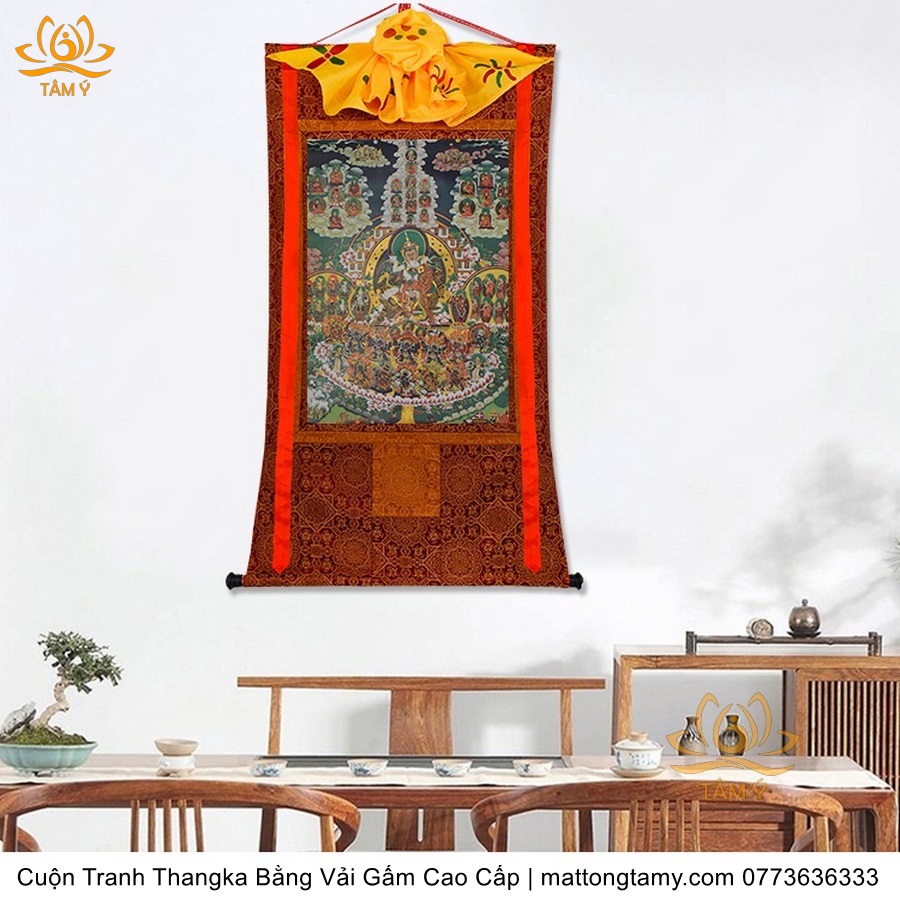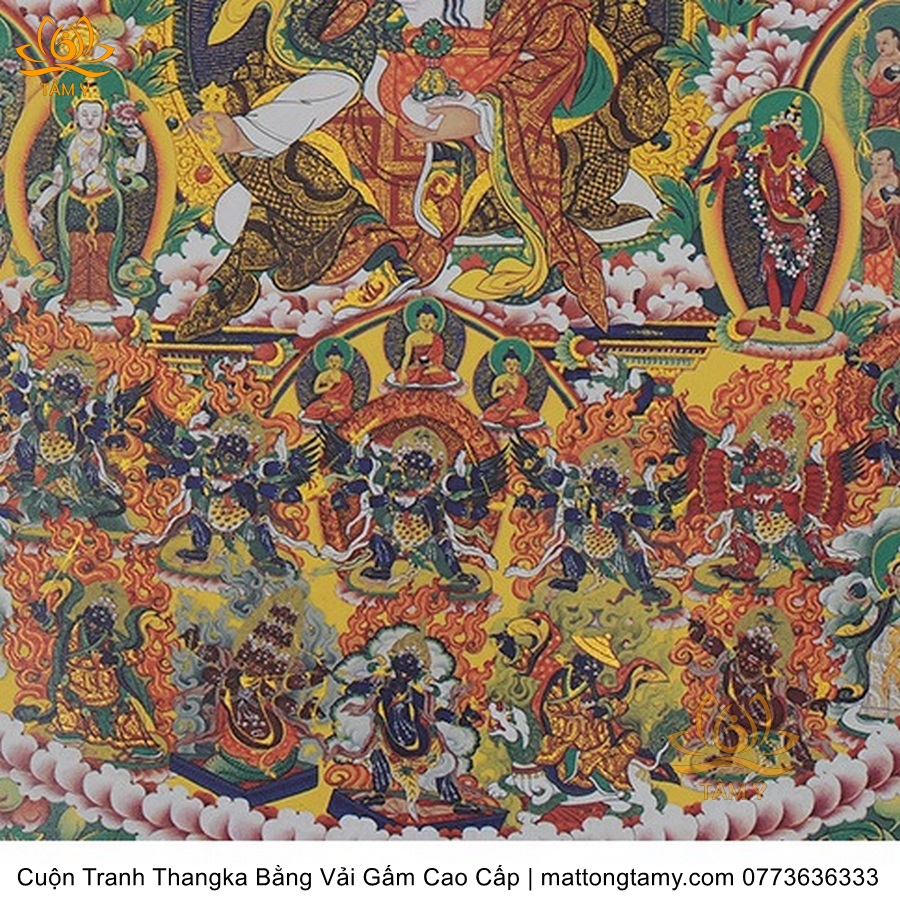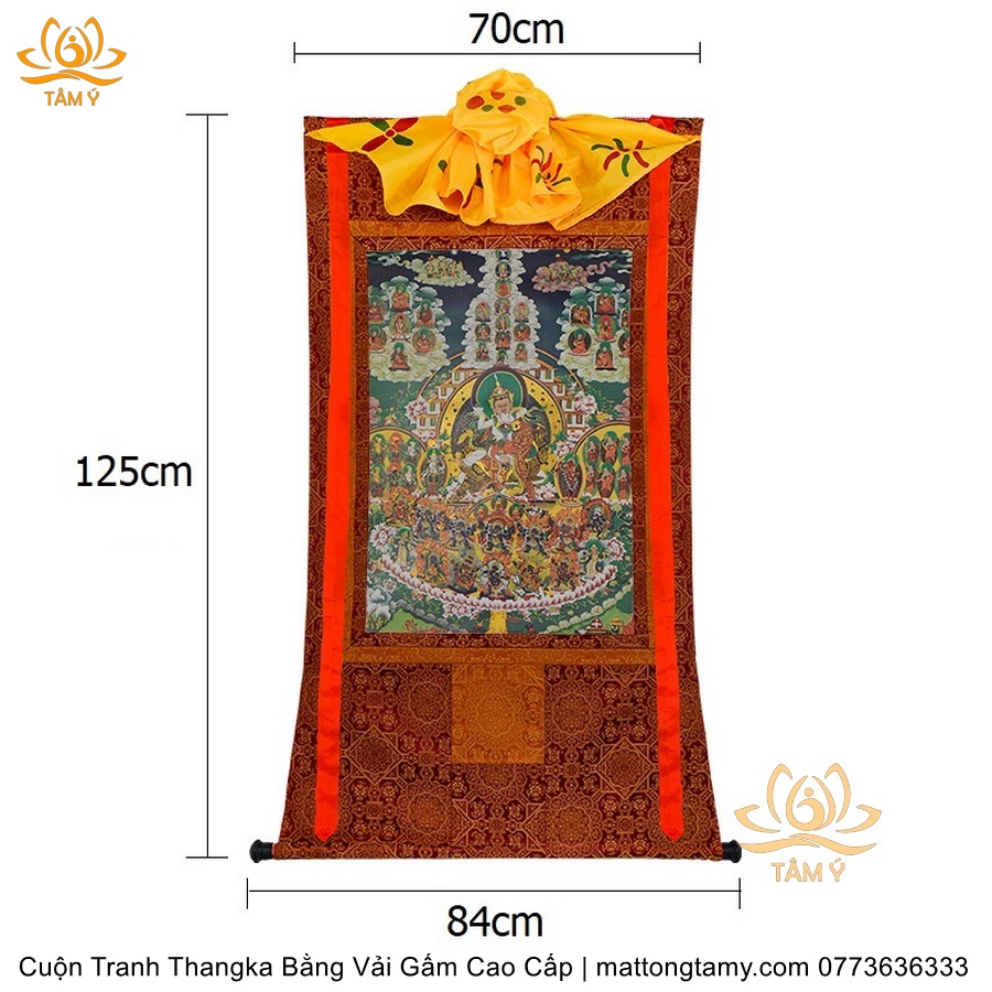 Chất liệu: Vải gấm cao cấp. In: Quan Âm Thiên Thủ Thiên Nhãn. Kích thước: dài: 125cm, rộng phía trên: 70cm, rộng phía dưới: 84cm. Tranh vẽ máy nhiều lớp công nghệ cao rất sắc nét, màu sắc tươi sáng, độ hoàn mỹ xuất sắc. Tranh vẽ máy trên lụa, rồi may lên khung bằng vải gấm, 2 đầu tranh là thanh gỗ quý.