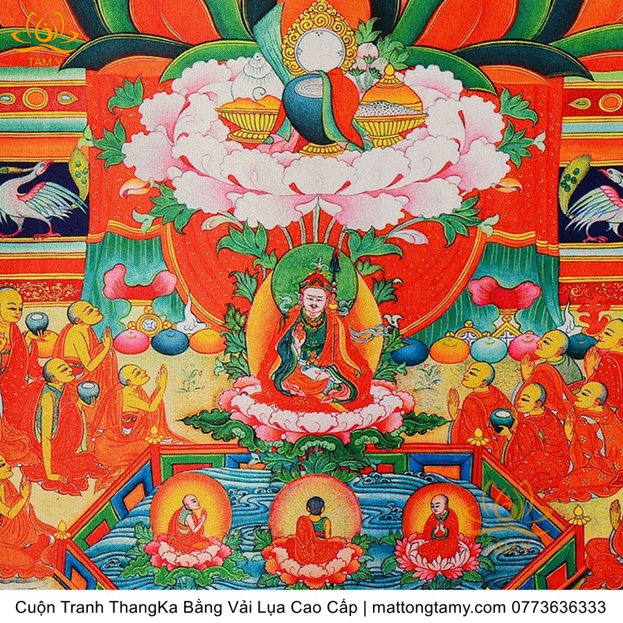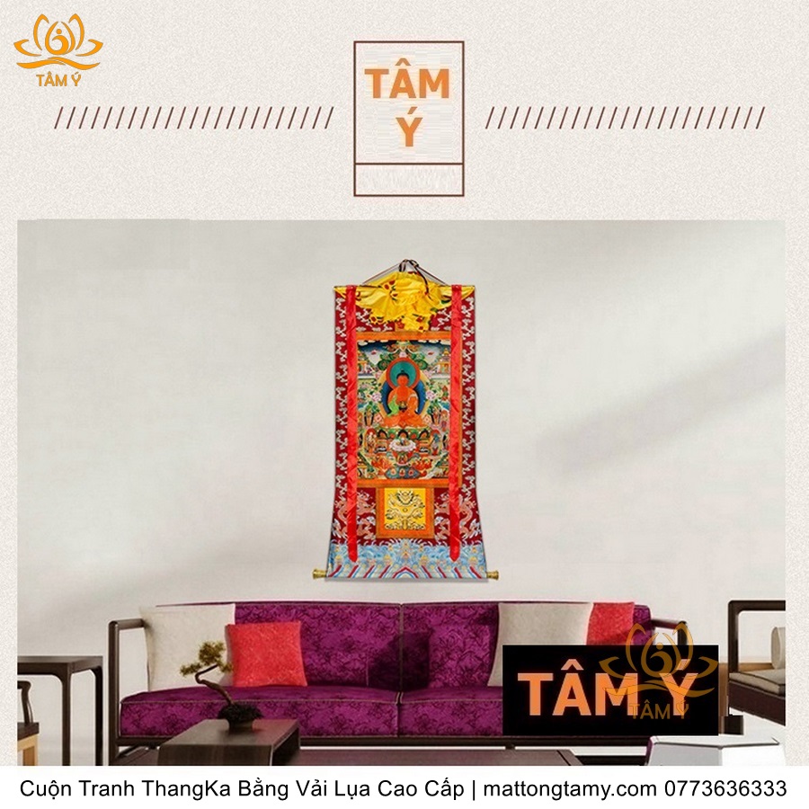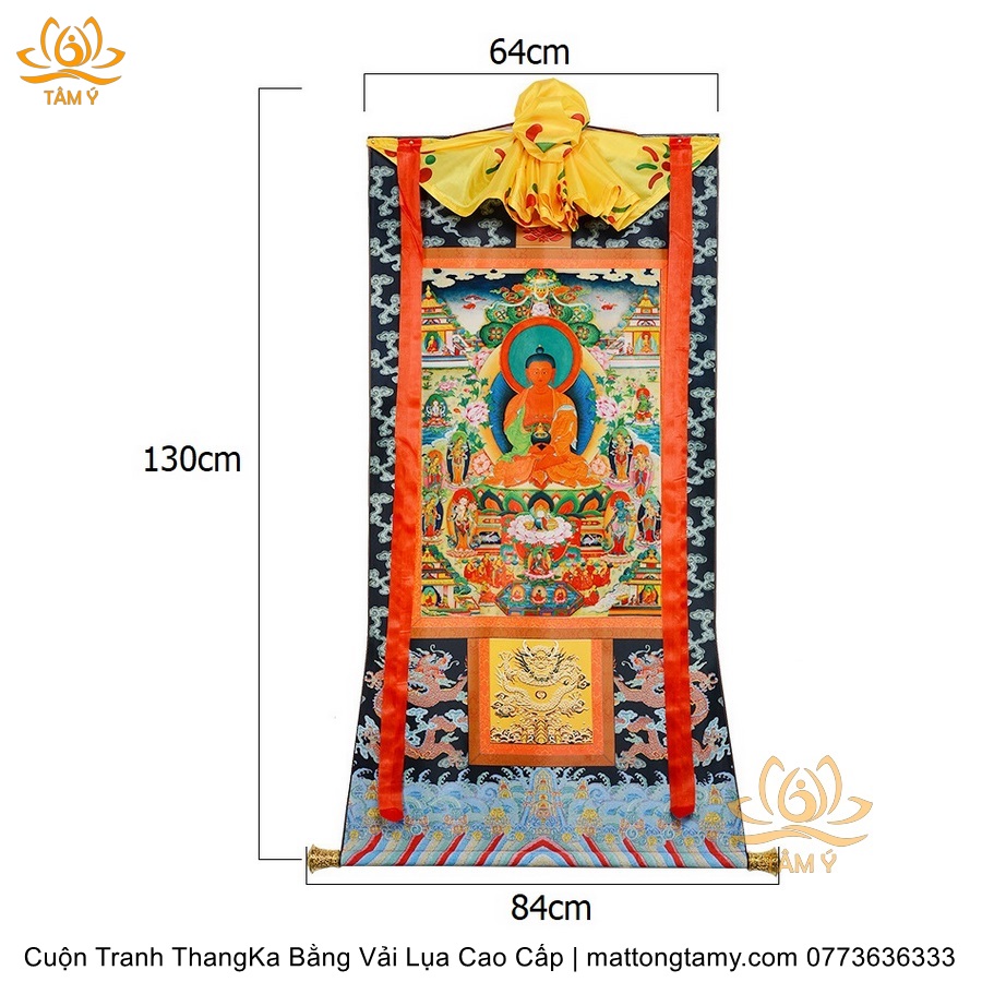 Chất liệu: Vải gấm cao cấp. In: A Di Đà Phật. Kích thước: dài: 130cm, rộng phía trên: 64cm, rộng phía dưới: 84cm. Tranh vẽ máy nhiều lớp công nghệ cao rất sắc nét, màu sắc tươi sáng, độ hoàn mỹ xuất sắc. Tranh vẽ máy trên lụa, rồi may lên khung bằng vải gấm, 2 đầu tranh là thanh gỗ quý.