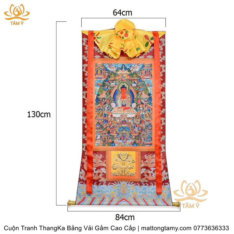 Chất liệu: Vải gấm cao cấp. In: A Di Đà Phật. Kích thước: dài: 130cm, rộng phía trên: 64cm, rộng phía dưới: 84cm. Tranh vẽ máy nhiều lớp công nghệ cao rất sắc nét, màu sắc tươi sáng, độ hoàn mỹ xuất sắc. Tranh vẽ máy trên lụa, rồi may lên khung bằng vải gấm, 2 đầu tranh là thanh gỗ quý.