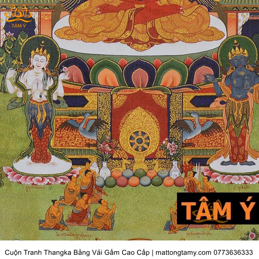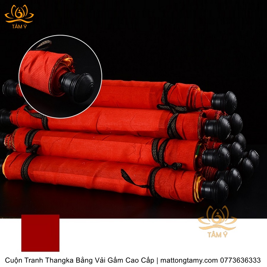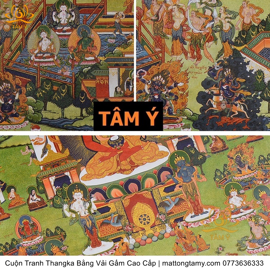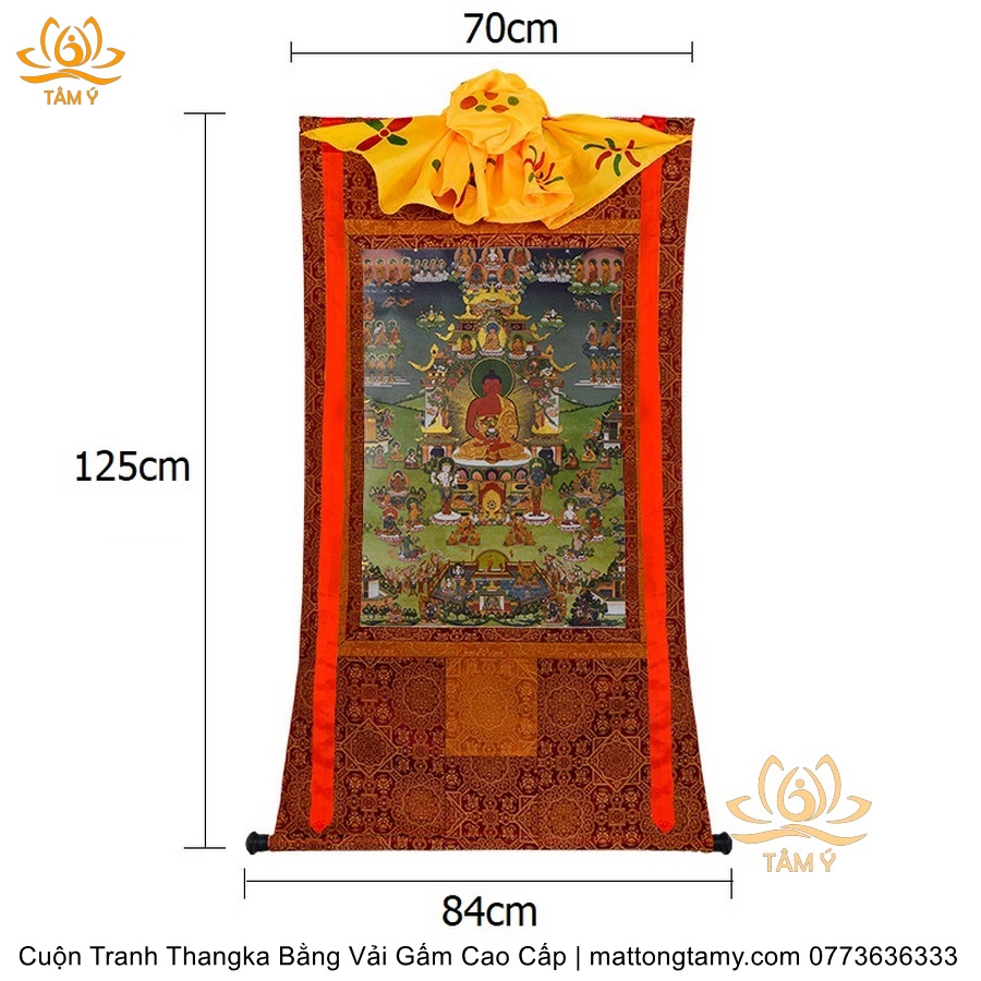 Chất liệu: Vải gấm cao cấp. In: A Di Đà Phật. Kích thước: dài: 125cm, rộng phía trên: 70cm, rộng phía dưới: 84cm. Tranh vẽ máy nhiều lớp công nghệ cao rất sắc nét, màu sắc tươi sáng, độ hoàn mỹ xuất sắc. Tranh vẽ máy trên lụa, rồi may lên khung bằng vải gấm, 2 đầu tranh là thanh gỗ quý.