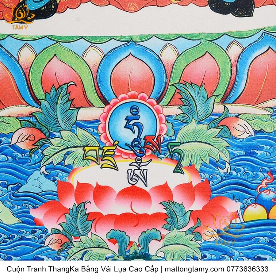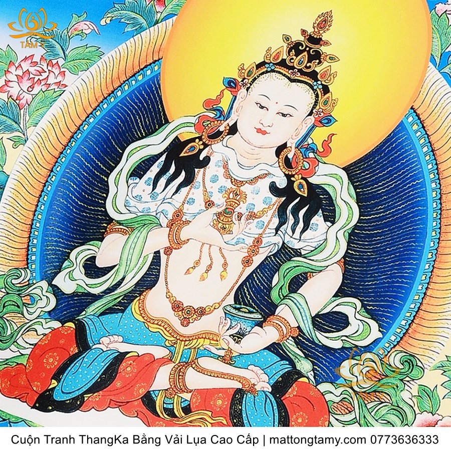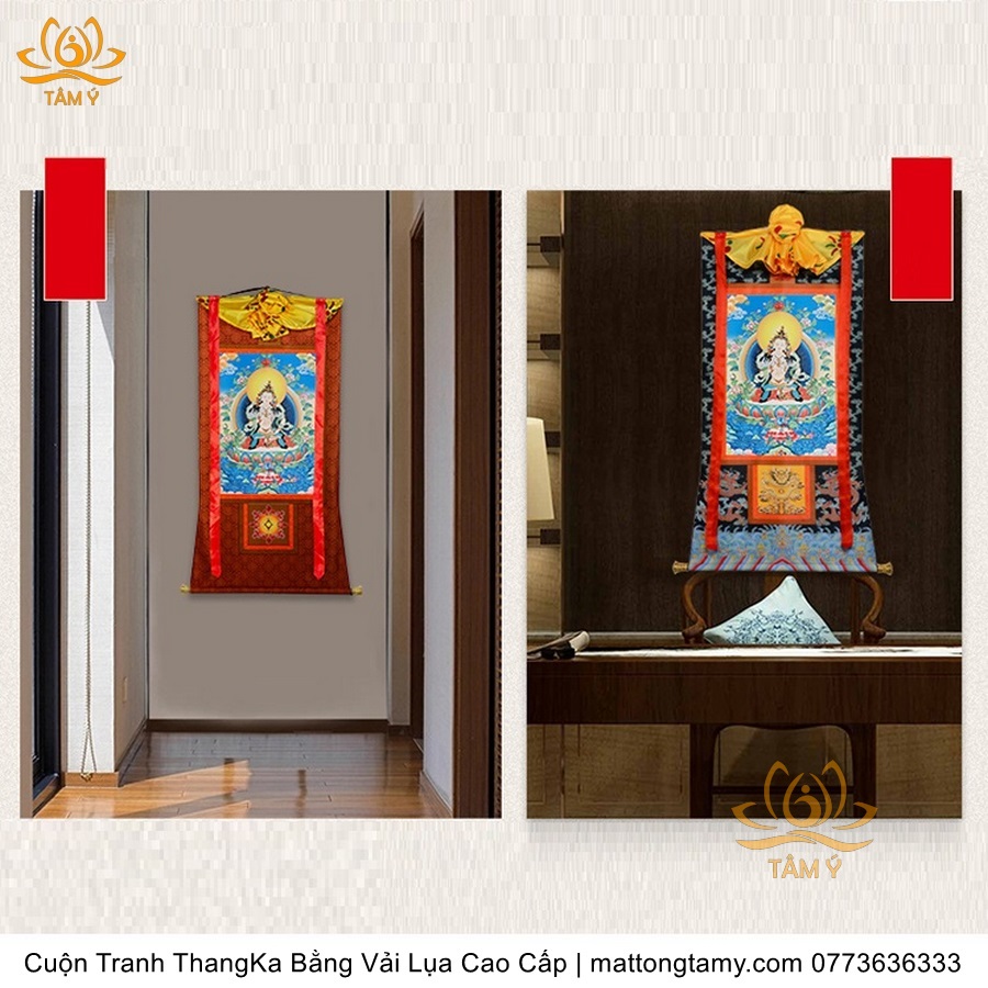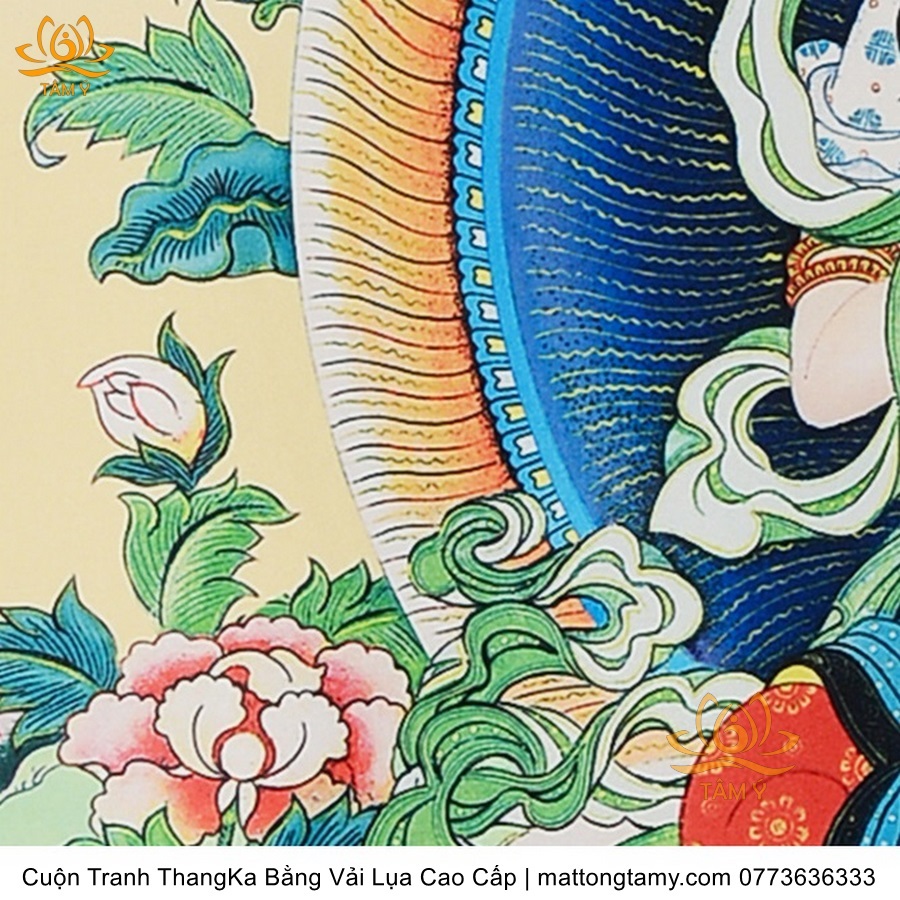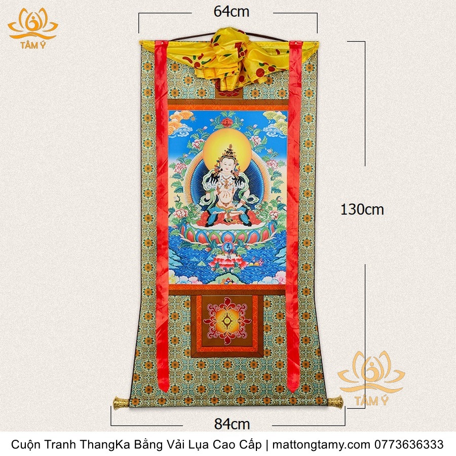 Chất liệu: Vải gấm cao cấp. In: Ngài Kim Cang Tát Đỏa. Kích thước: dài: 130cm, rộng phía trên: 64cm, rộng phía dưới: 84cm. Tranh vẽ máy nhiều lớp công nghệ cao rất sắc nét, màu sắc tươi sáng, độ hoàn mỹ xuất sắc. Tranh vẽ máy trên lụa, rồi may lên khung bằng vải gấm, 2 đầu tranh là thanh gỗ quý.