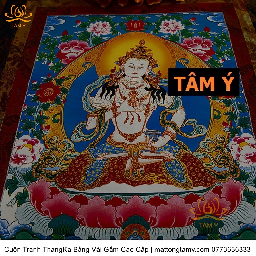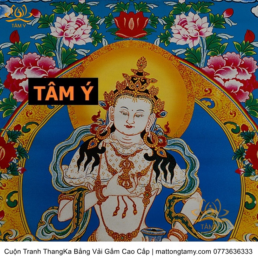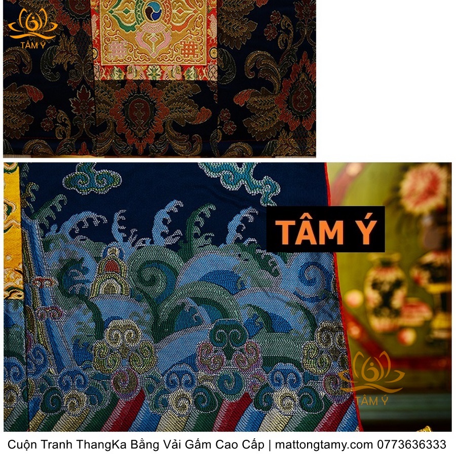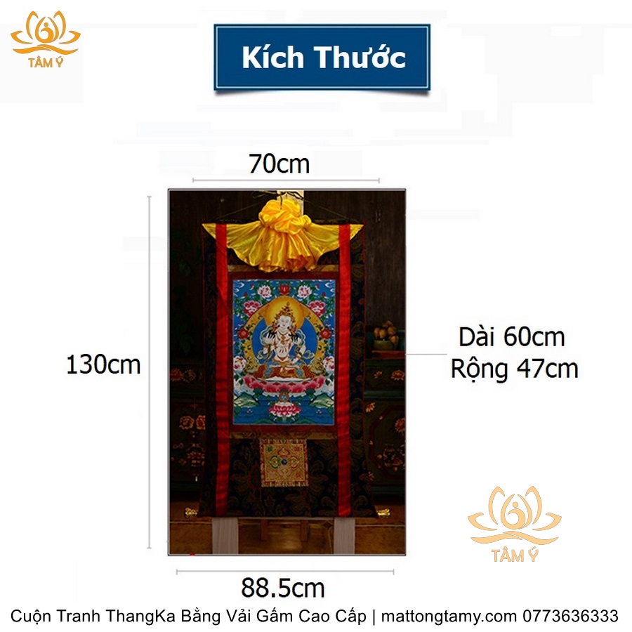 Chất liệu: Vải gấm cao cấp. In: Ngài Kim Cang Tát Đỏa. Kích thước: dài: 130cm, rộng phía trên: 70cm, rộng phía dưới: 88.5cm. Tranh vẽ máy nhiều lớp công nghệ cao rất sắc nét, màu sắc tươi sáng, độ hoàn mỹ xuất sắc. Tranh vẽ máy trên lụa, rồi may lên khung bằng vải gấm, 2 đầu tranh là thanh gỗ quý.