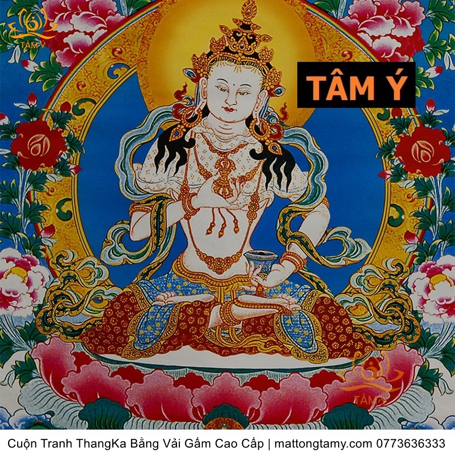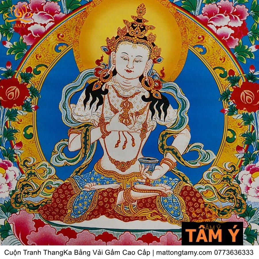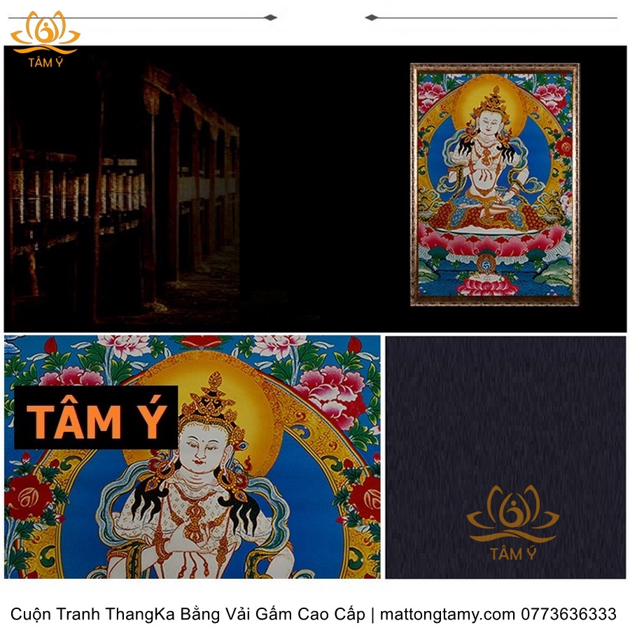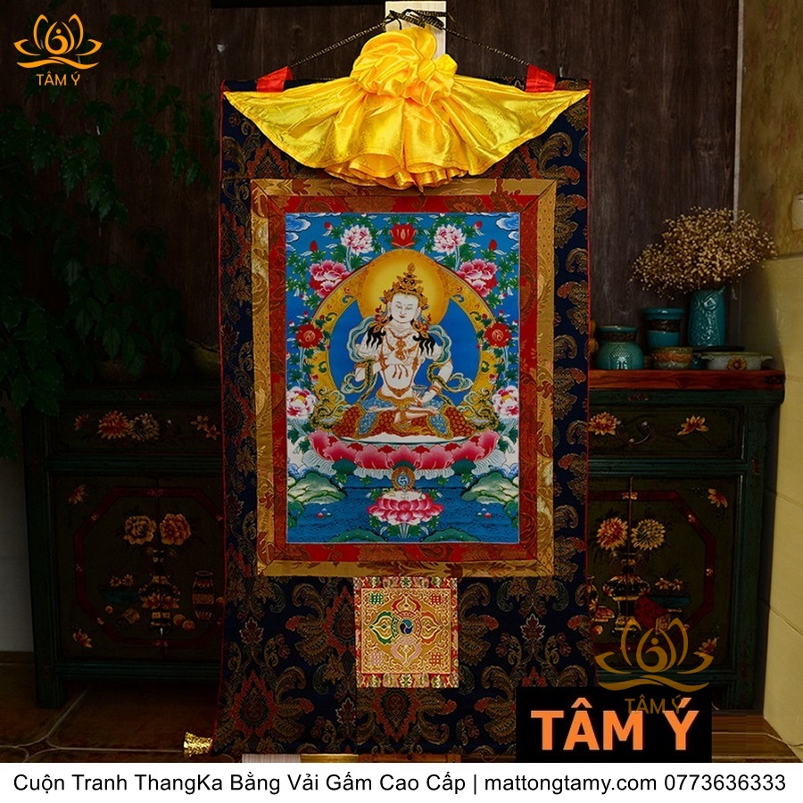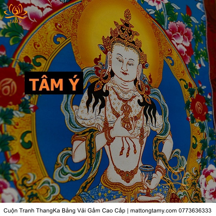 Chất liệu: Vải gấm cao cấp. In: Ngài Kim Cang Tát Đỏa. Kích thước: dài: 130cm, rộng phía trên: 70cm, rộng phía dưới: 88.5cm. Tranh vẽ máy nhiều lớp công nghệ cao rất sắc nét, màu sắc tươi sáng, độ hoàn mỹ xuất sắc. Tranh vẽ máy trên lụa, rồi may lên khung bằng vải gấm, 2 đầu tranh là thanh gỗ quý.