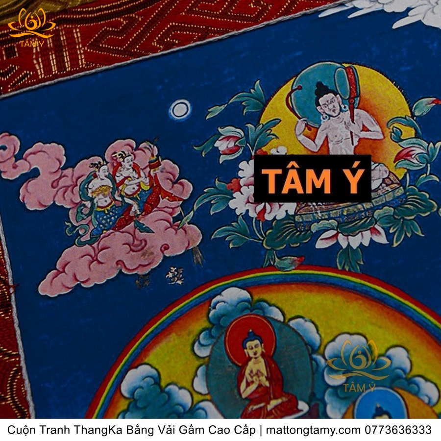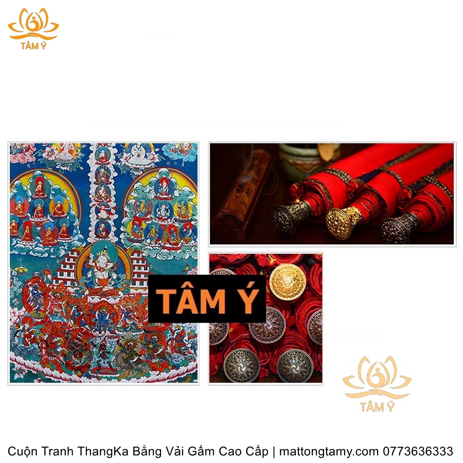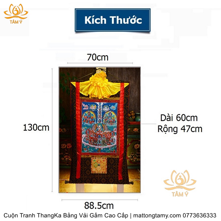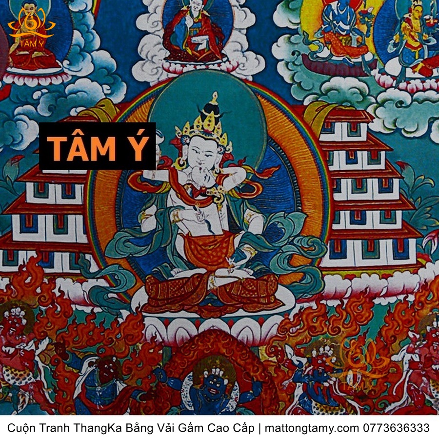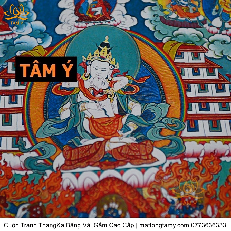 Chất liệu: Vải gấm cao cấp. In: Ngài Kim Cang Tát Đỏa. Kích thước: dài: 130cm, rộng phía trên: 70cm, rộng phía dưới: 88.5cm. Tranh vẽ máy nhiều lớp công nghệ cao rất sắc nét, màu sắc tươi sáng, độ hoàn mỹ xuất sắc. Tranh vẽ máy trên lụa, rồi may lên khung bằng vải gấm, 2 đầu tranh là thanh gỗ quý.