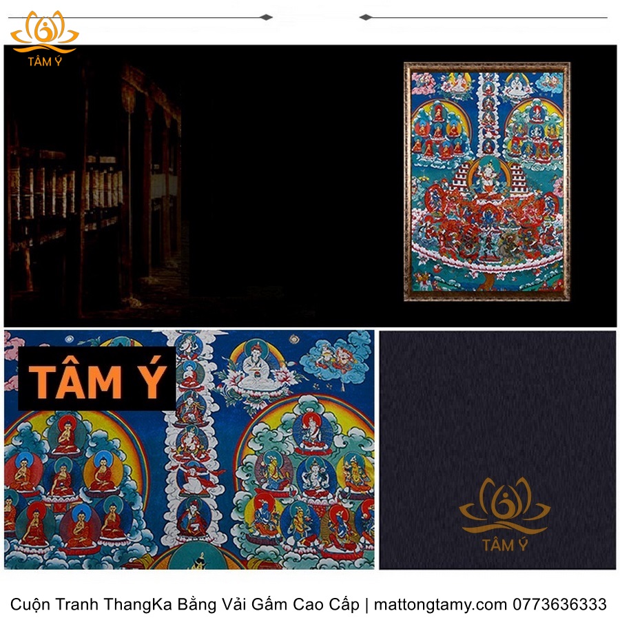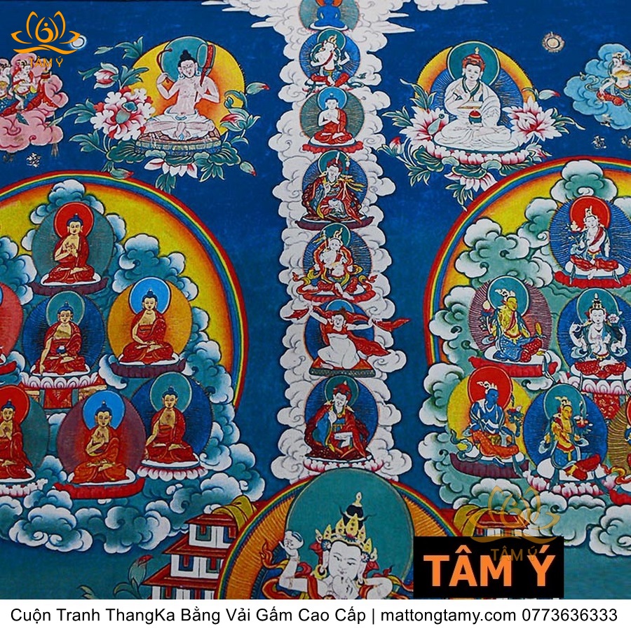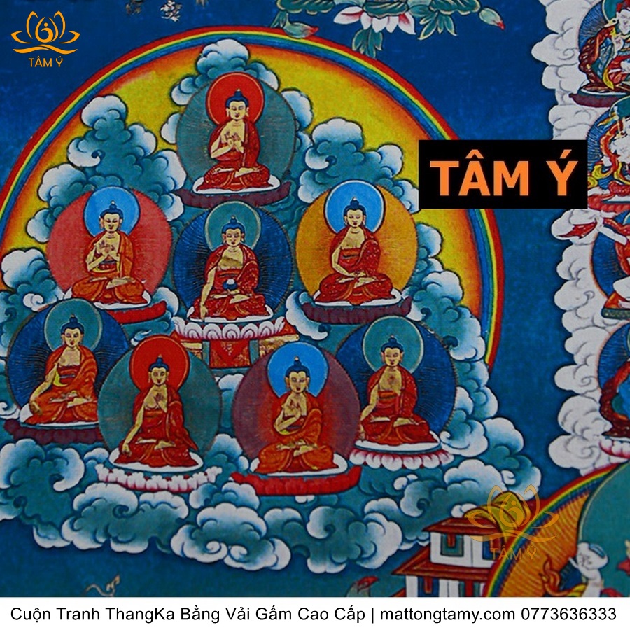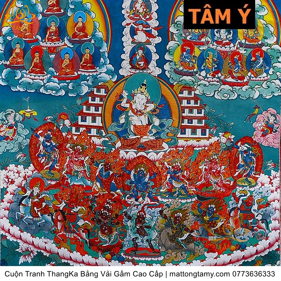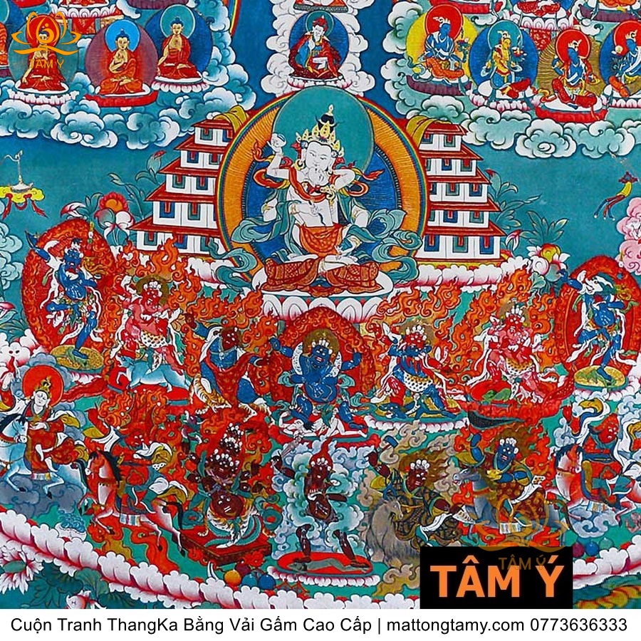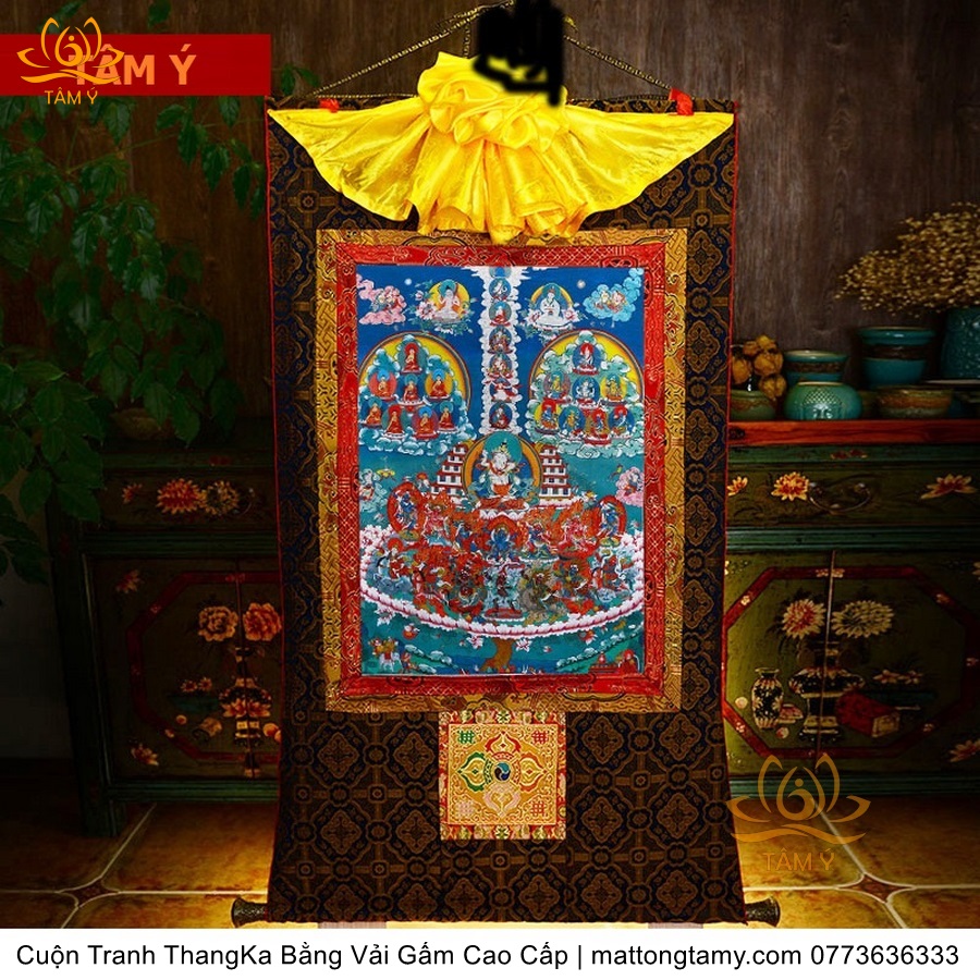 Chất liệu: Vải gấm cao cấp. In: Ngài Kim Cang Tát Đỏa. Kích thước: dài: 130cm, rộng phía trên: 70cm, rộng phía dưới: 88.5cm. Tranh vẽ máy nhiều lớp công nghệ cao rất sắc nét, màu sắc tươi sáng, độ hoàn mỹ xuất sắc. Tranh vẽ máy trên lụa, rồi may lên khung bằng vải gấm, 2 đầu tranh là thanh gỗ quý.